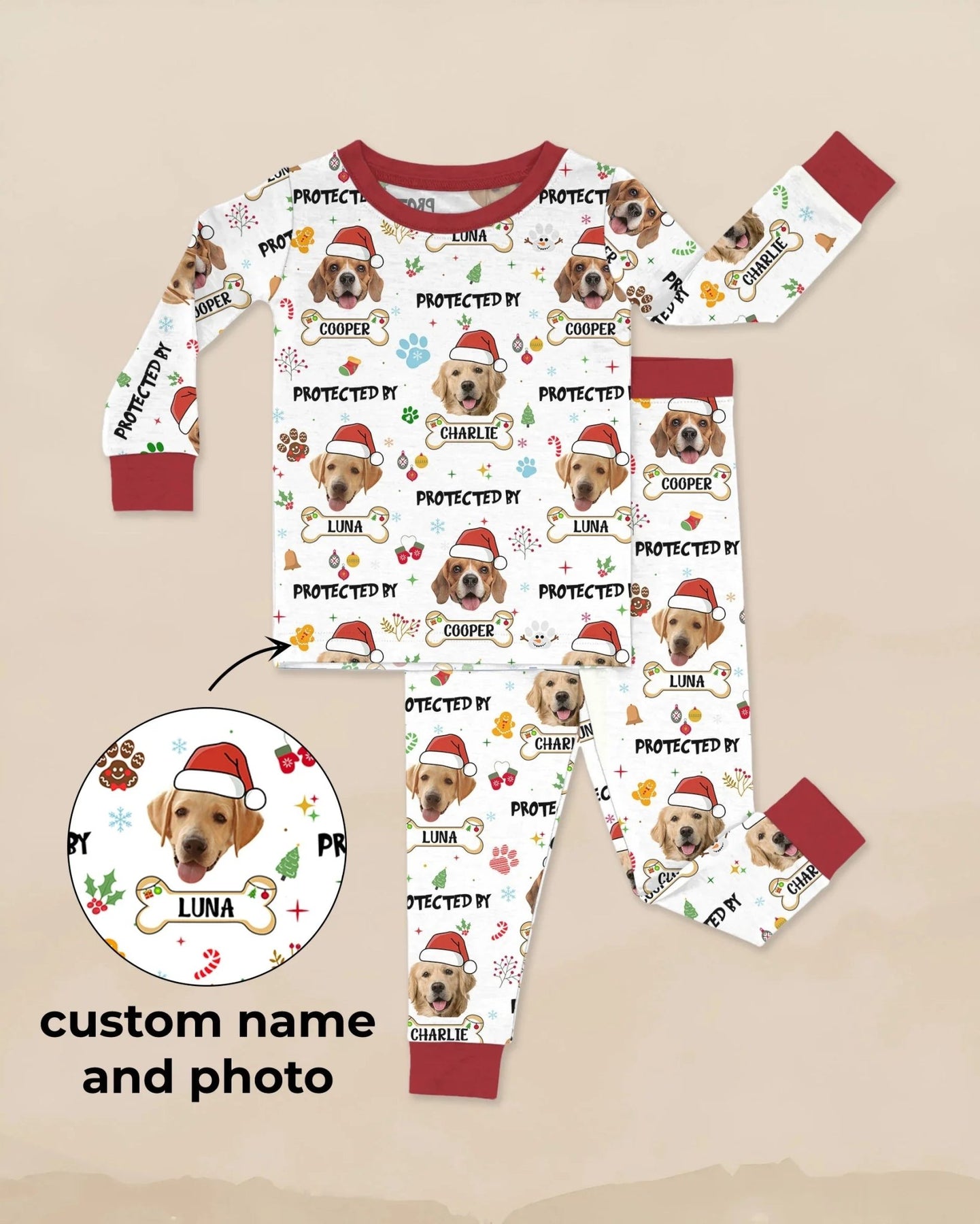 Celebrate the holidays with our “Custom Dog Photo "Protected By" Christmas” bamboo zippies and pajamas. Made from buttery-soft, breathable bamboo fabric, these PJs keep little ones cozy and comfy all season long. Personalized with up to 4 photos of your pup, festive Christmas icons, and the playful “Protected By” theme, they add warmth, joy, and a paw-sonal touch to bedtime.