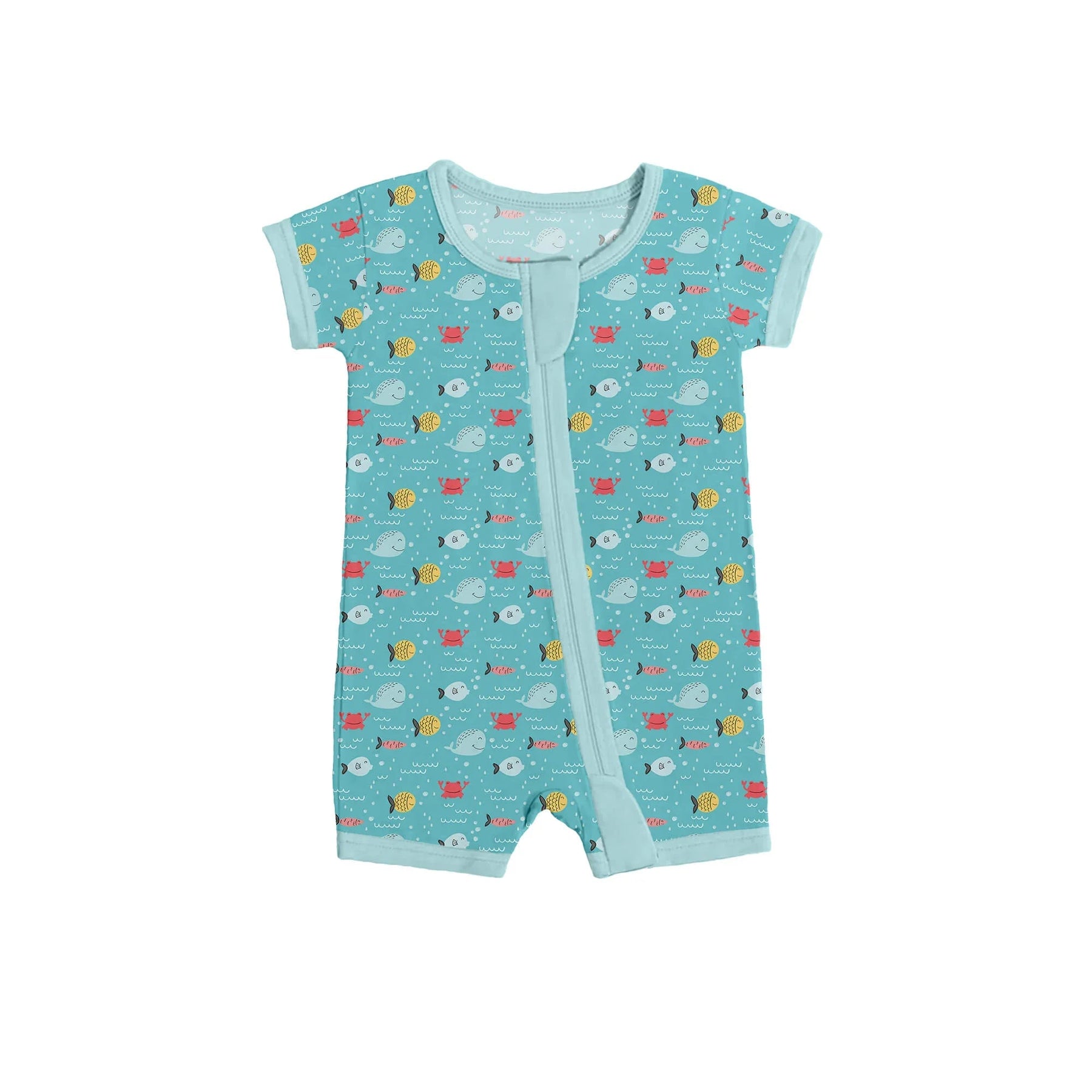 Dive into fun with our fishes and crabs shorty romper. Made from breathable bamboo viscose, it keeps your baby cool and comfy. The double zipper ensures hassle-free diaper changes, ensuring your little one stays happy and comfortable.