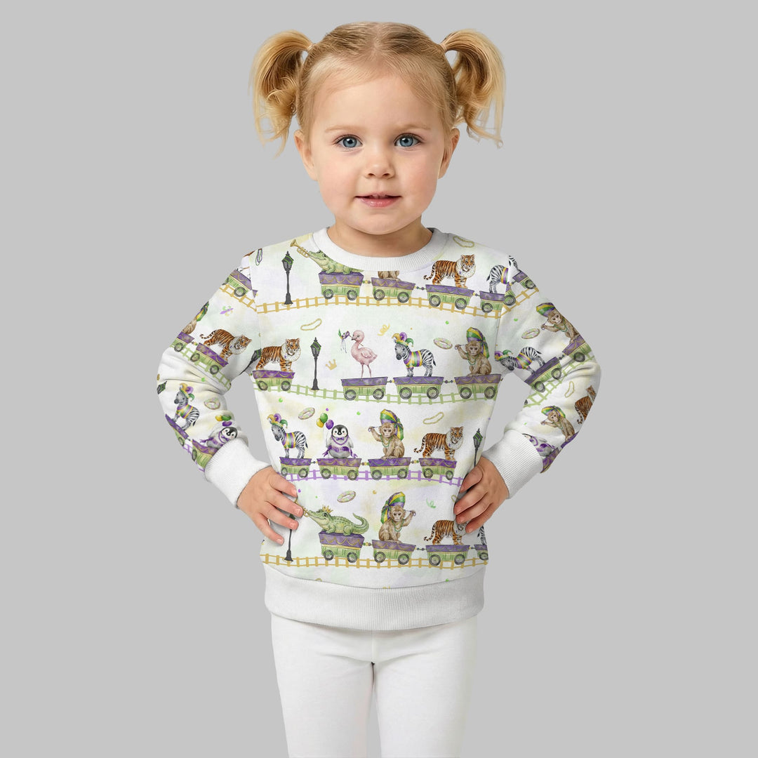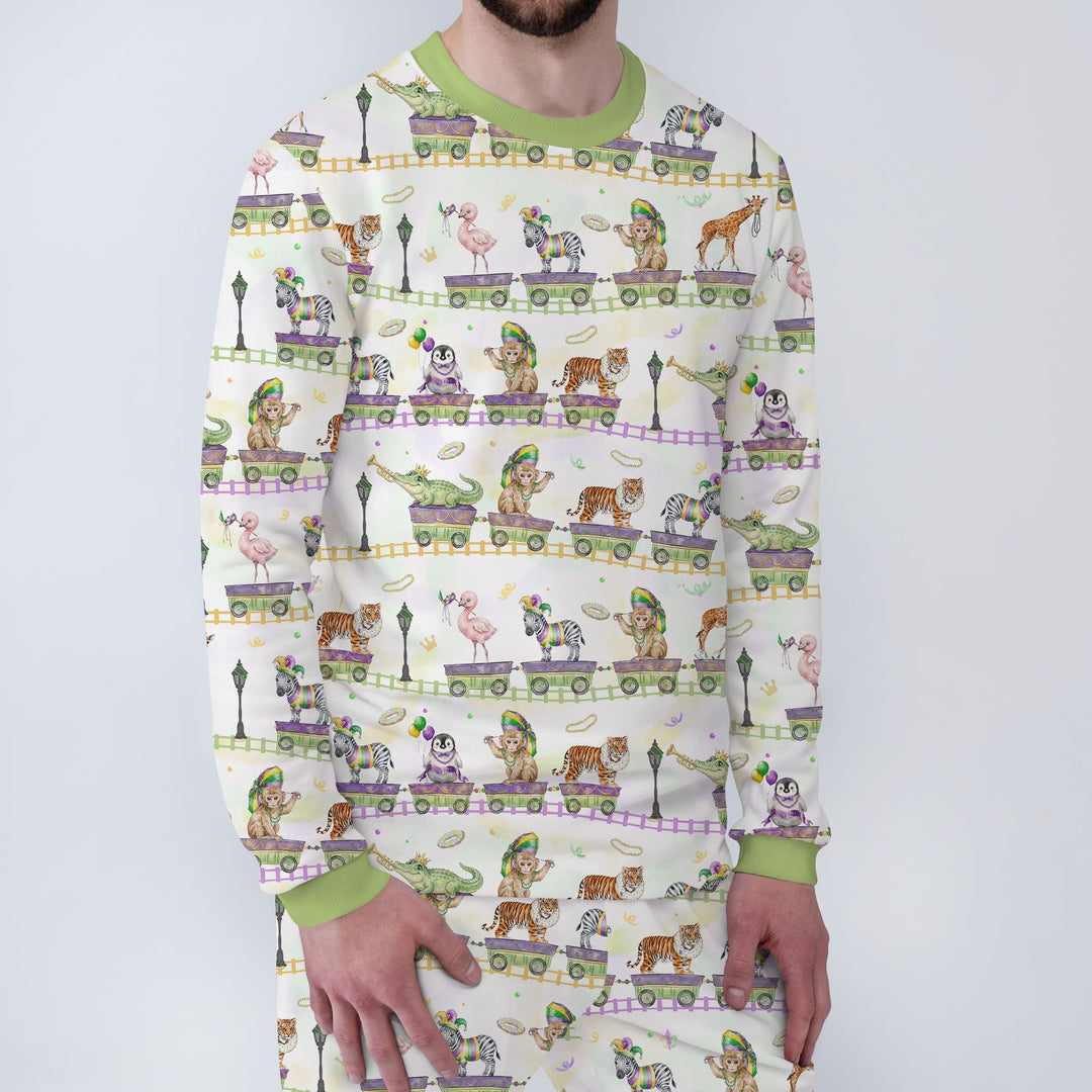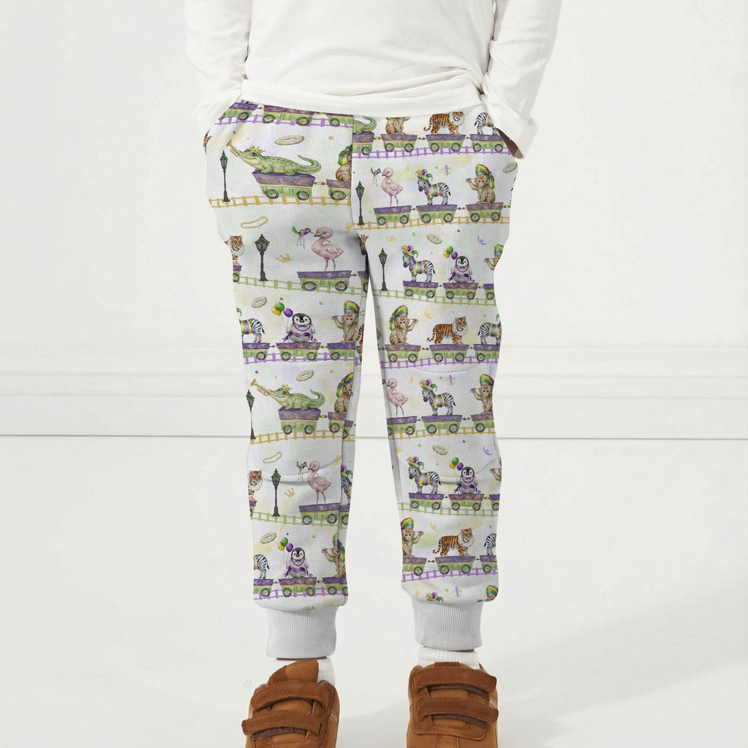 Playful Mardi Gras–inspired kids collection featuring whimsical parade animals and festive colors, made with soft, breathable fabric for everyday comfort across pajamas, sleepwear, and matching essentials.