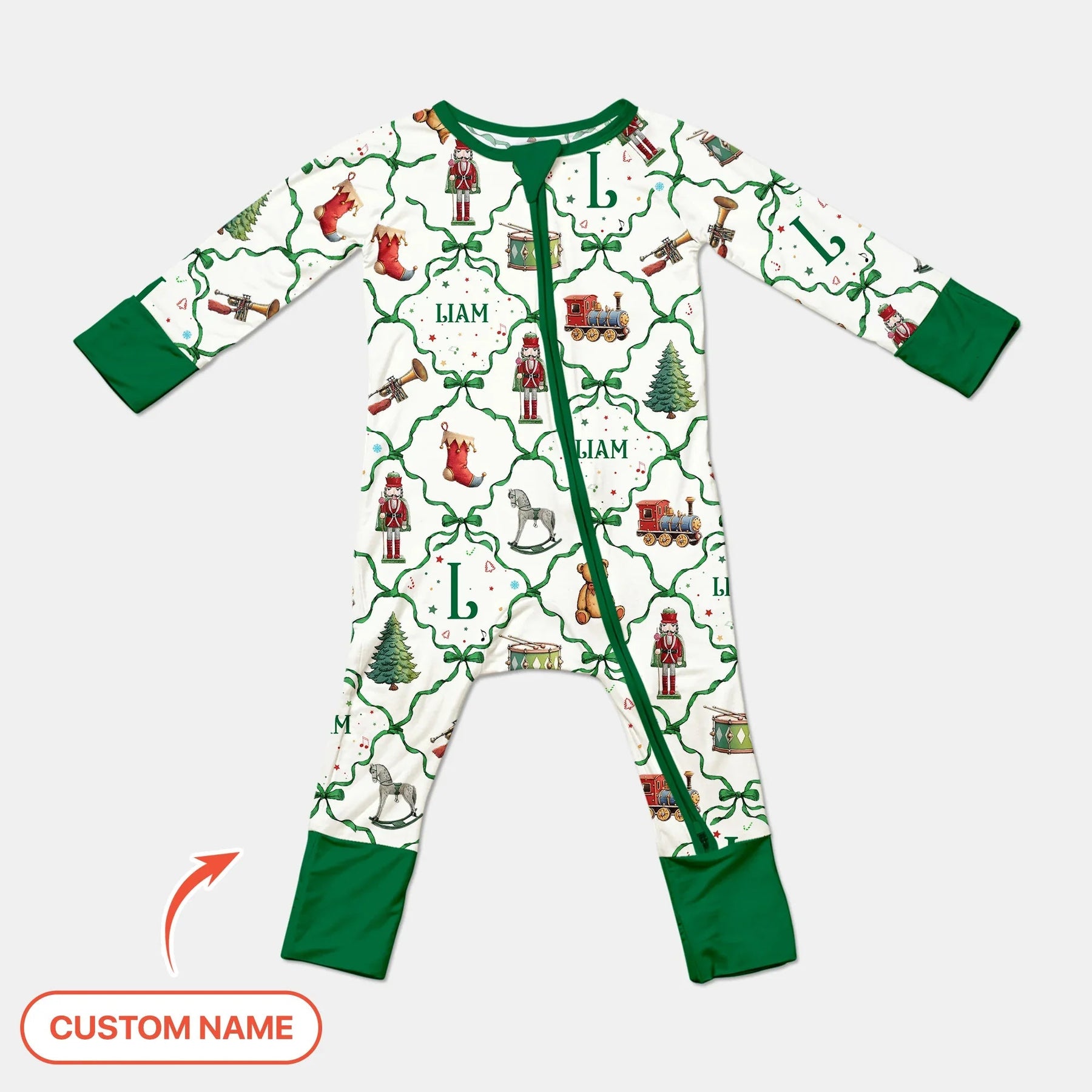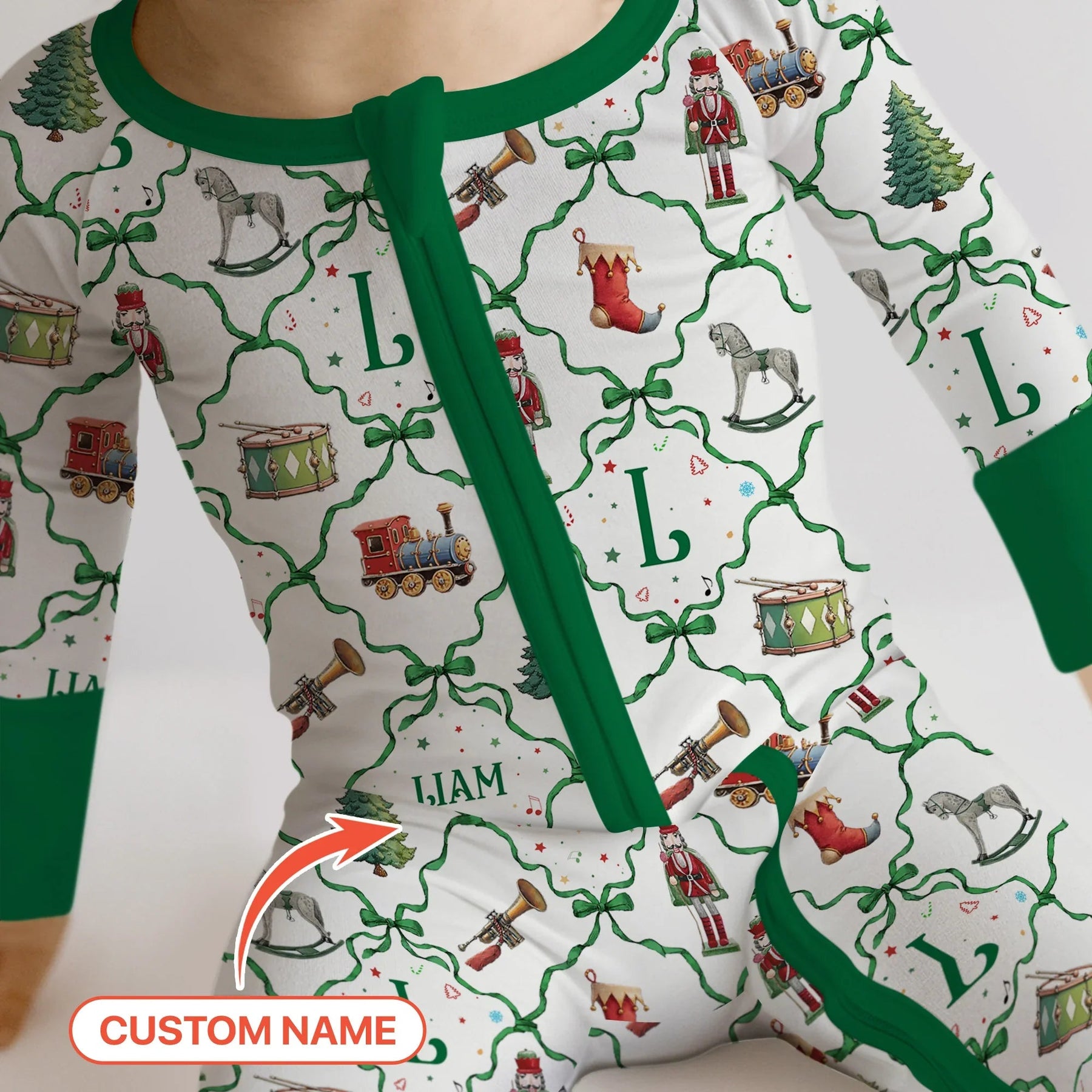Step back into a world of classic holiday charm with our Vintage Christmas Toy Custom Name Collection — where nostalgia meets festive coziness. This heartwarming pajama design brings together timeless Christmas icons: toy drums, dolls, bunnies, ornaments, and pine trees — all delicately framed in a vintage red ribbon pattern that feels like a page from an old-fashioned storybook.