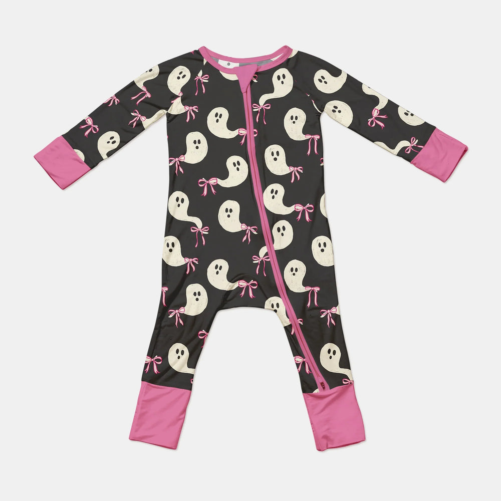 Sweetly spooky, our “Little Ghosts” bamboo zippies and pajamas make bedtime extra fun. Crafted from buttery-soft, breathable bamboo fabric, these PJs keep little ones cozy and comfy all night long. The playful ghost print with pink bows adds a charming Halloween touch while being gentle on sensitive skin. Stretchy, soft, and perfect for spooky season snuggles.