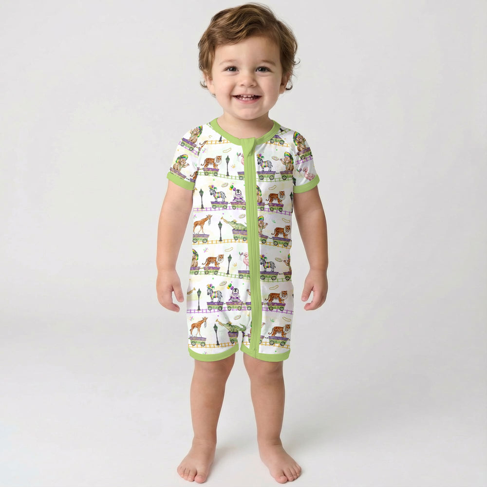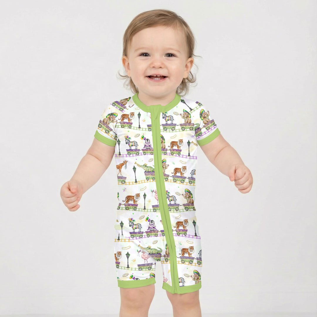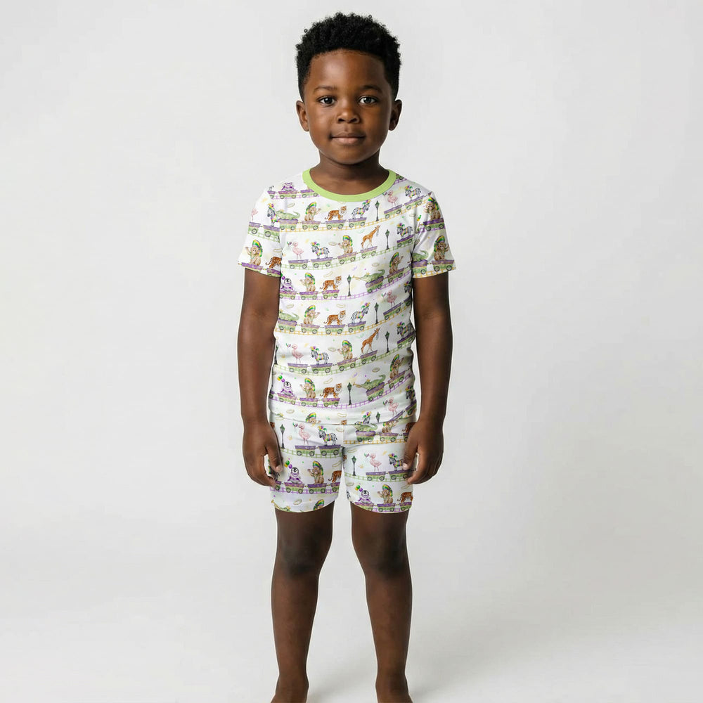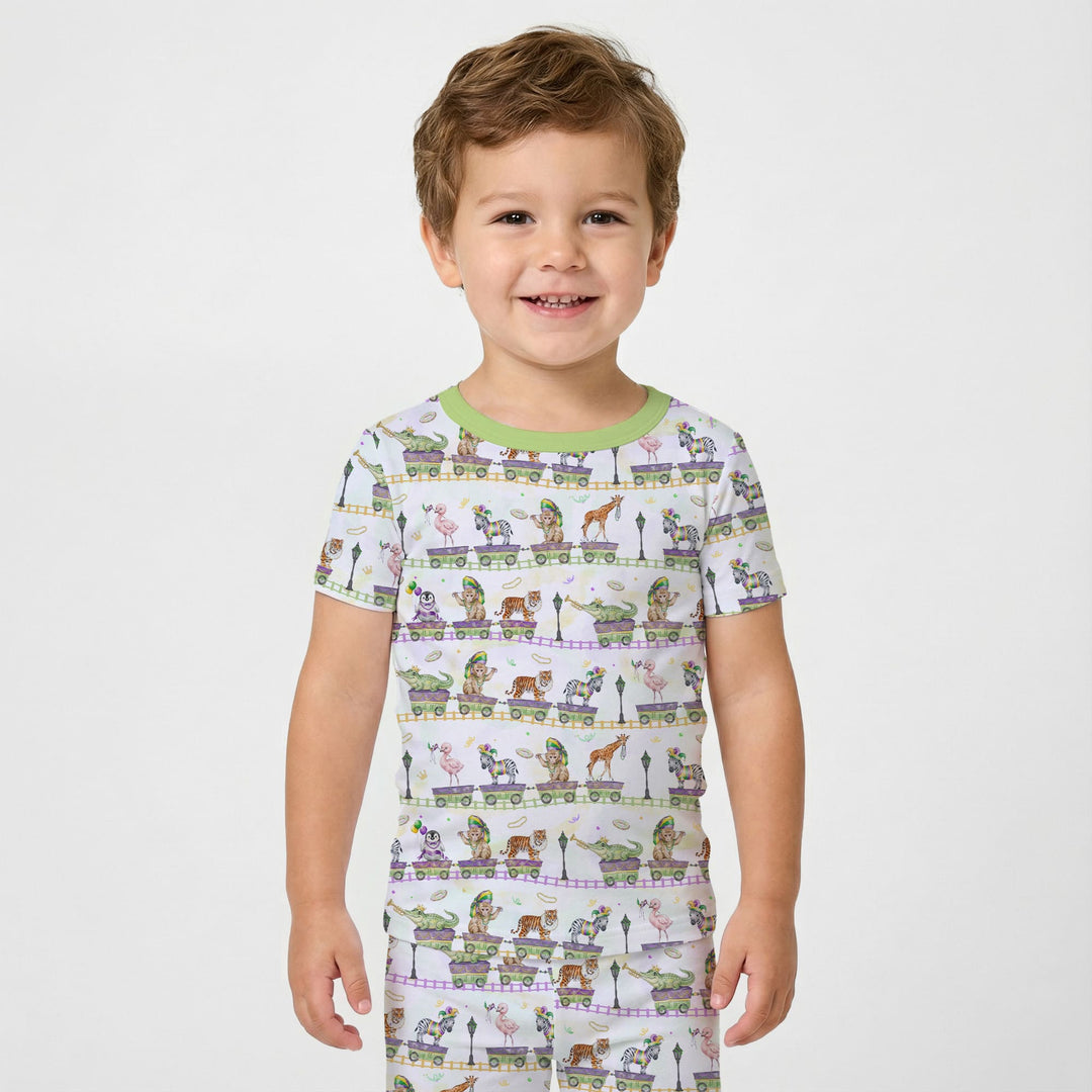 Playful Mardi Gras–inspired kids collection featuring whimsical parade animals and festive colors, made with soft, breathable fabric for everyday comfort across pajamas, sleepwear, and matching essentials.