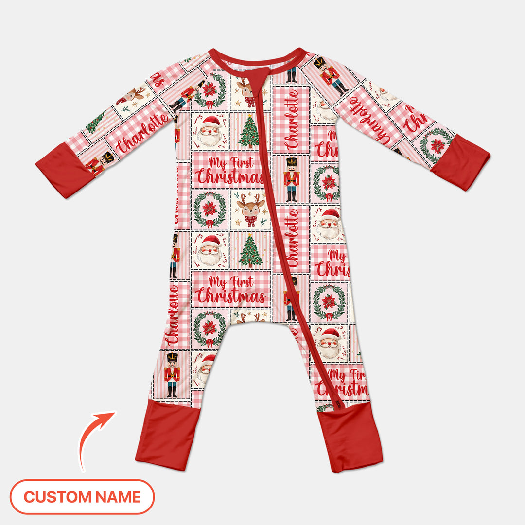 Wrap your little one in the warmth of the holiday spirit with the Merry Patchwork Christmas Custom Name Collection — a cozy blend of festive cheer and personal charm! Featuring a delightful patchwork design of Santa Claus, nutcrackers, reindeer, Christmas trees, and wreaths, this pajama set brings together every symbol of a joyful Christmas. The soft red-and-pink plaid background adds a touch of classic holiday coziness, while the custom name detail makes it truly one-of-a-kind. Crafted from buttery-soft, breathable fabric, these pajamas are perfect for Christmas Eve snuggles, bedtime stories by the tree, or that picture-perfect family photo.