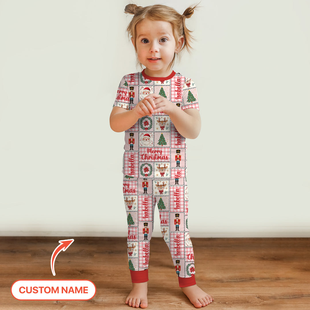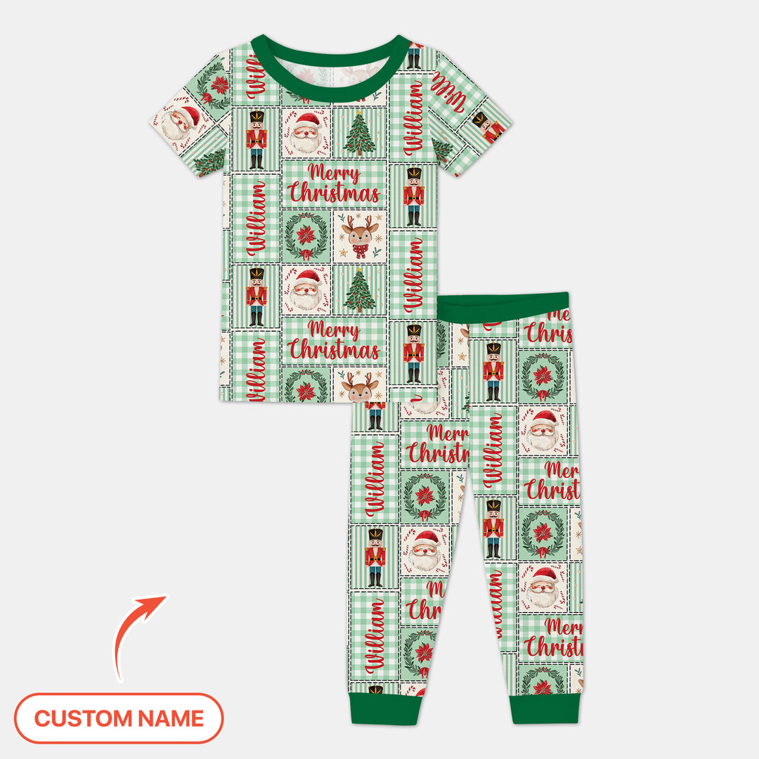 Merry Patchwork Christmas Custom Name Two Piece Short Sleeve Pajama Set