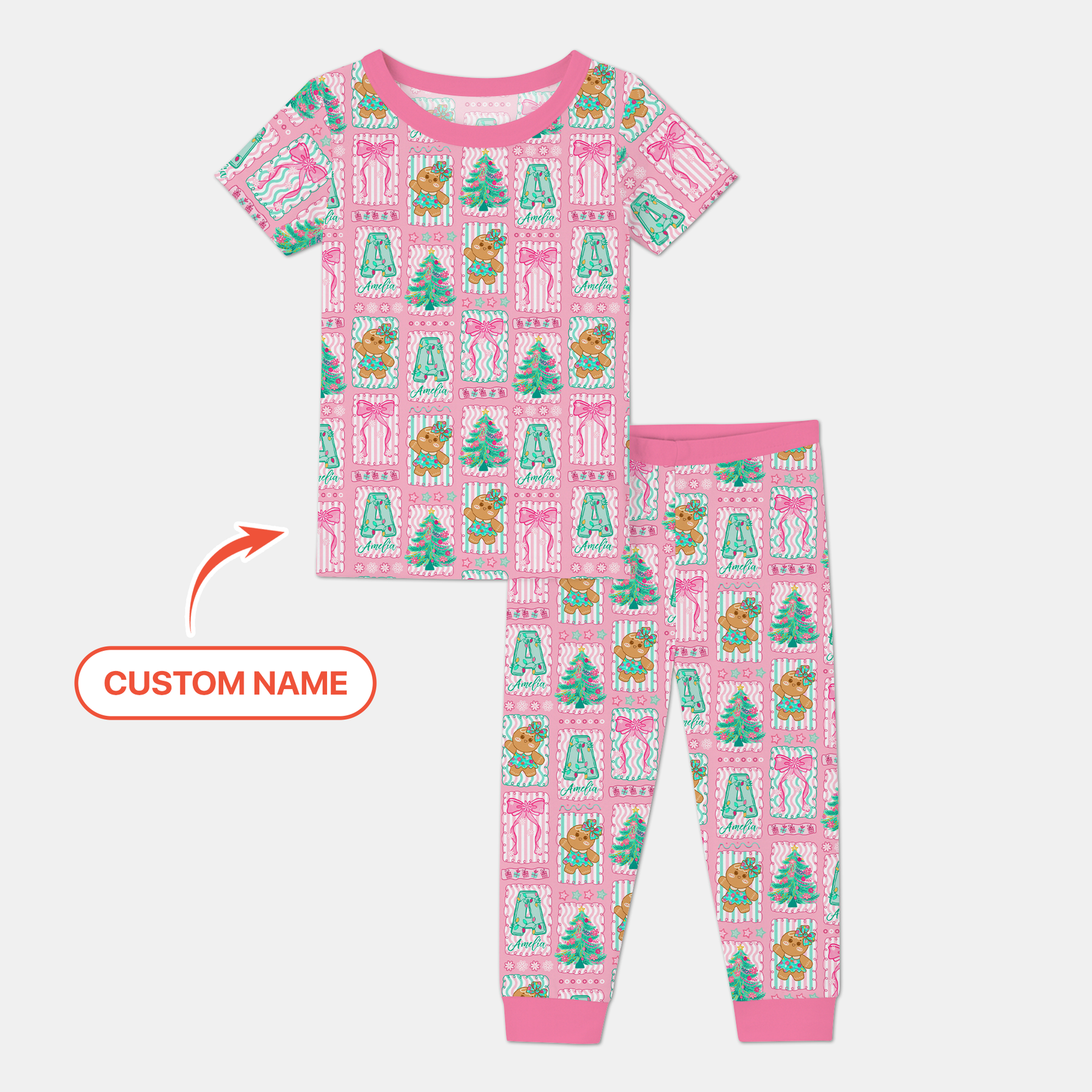 Custom Name "Merry Pink Christmas" Two Piece Short Sleeve Pajama Set