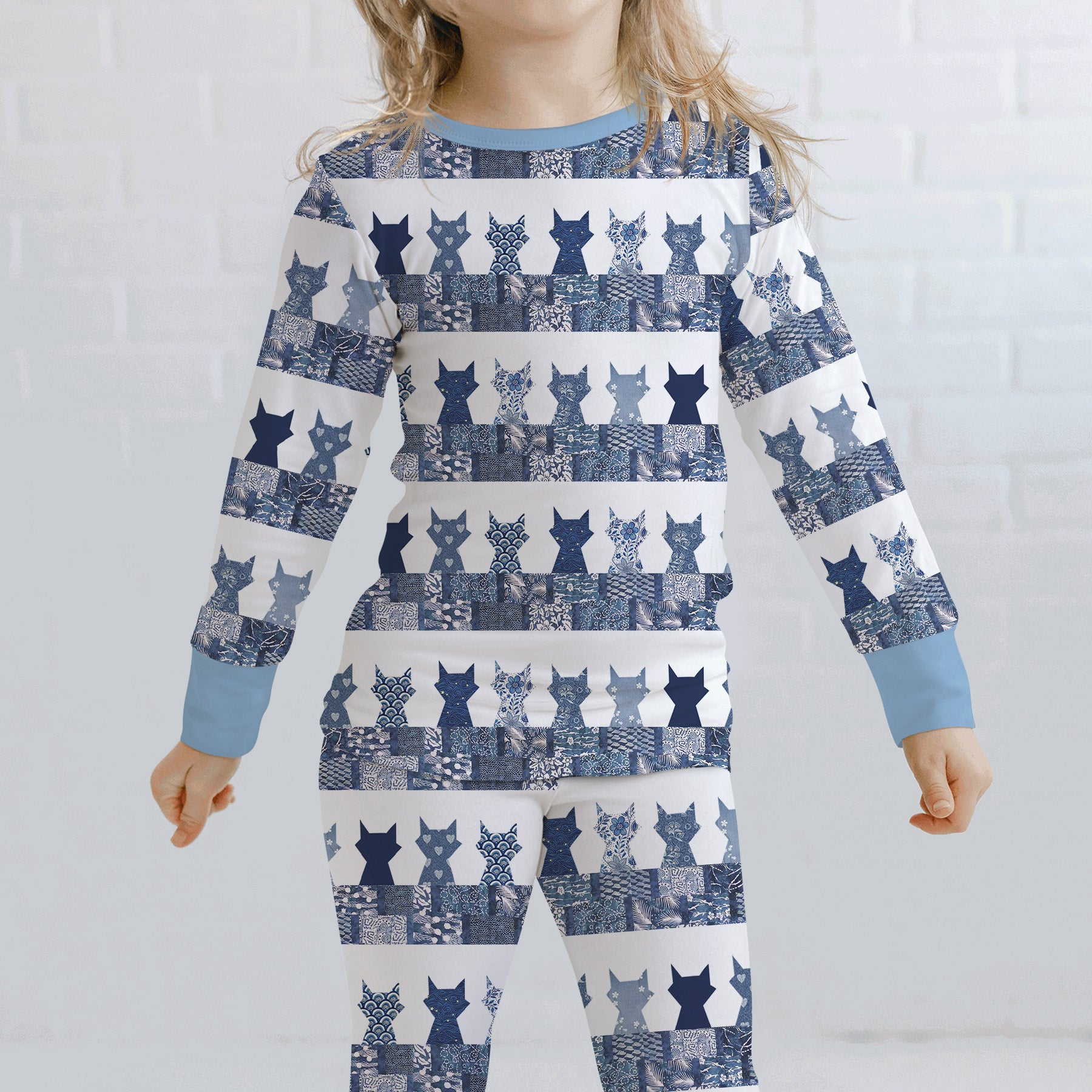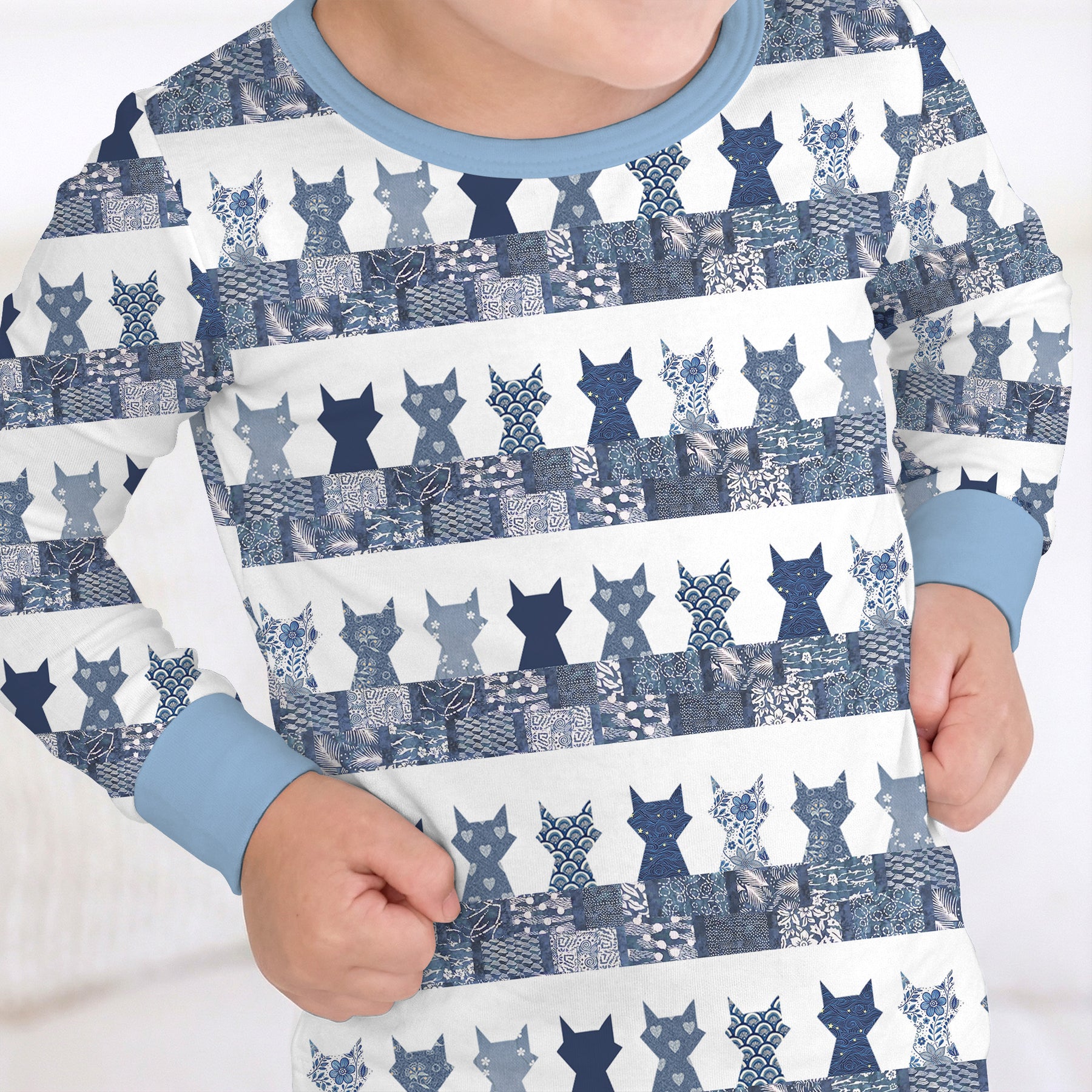 The product features a modern patchwork-style print of stylized animal silhouettes in layered shades of blue and white, creating a calm, artistic look that feels both playful and sophisticated, finished with soft blue trim for a clean, cohesive finish. Crafted from soft bamboo viscose, this set is gentle on sensitive skin and offers breathable comfort in any season. The extra length ensures it fits longer, making bedtime routines even more enjoyable.