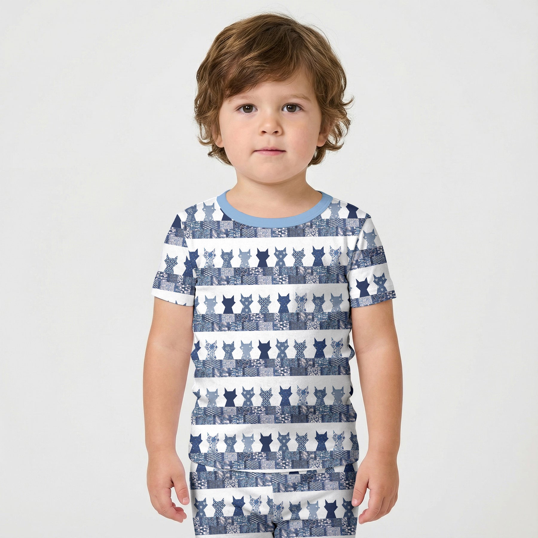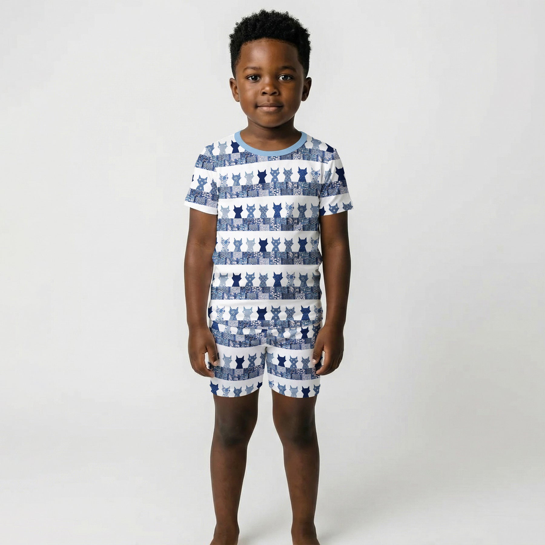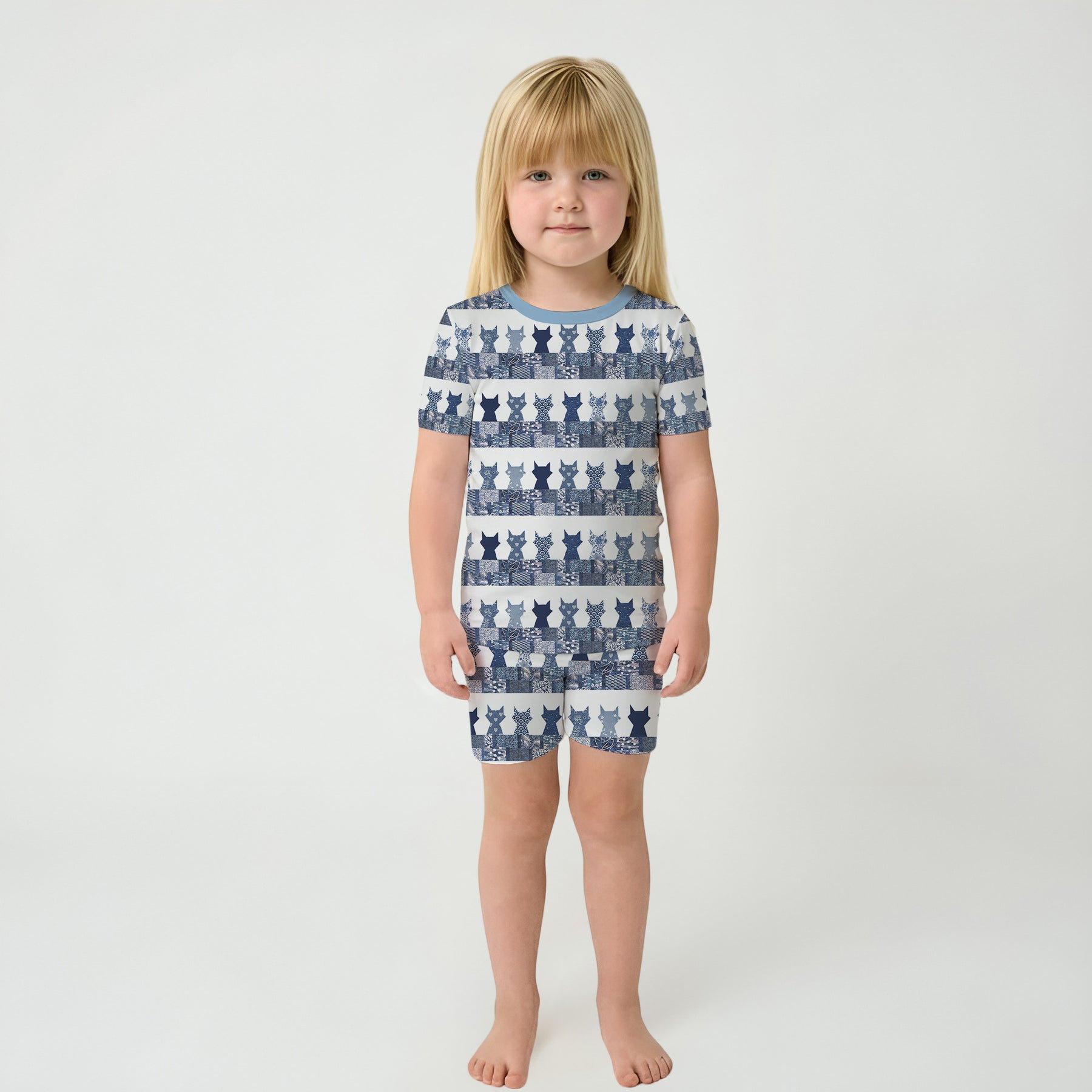 The product features a modern patchwork-style print of stylized animal silhouettes in layered shades of blue and white, creating a calm, artistic look that feels both playful and sophisticated, finished with soft blue trim for a clean, cohesive finish. Crafted from soft bamboo viscose, this set is gentle on sensitive skin and offers breathable comfort in any season. The extra length ensures it fits longer, making bedtime routines even more enjoyable.