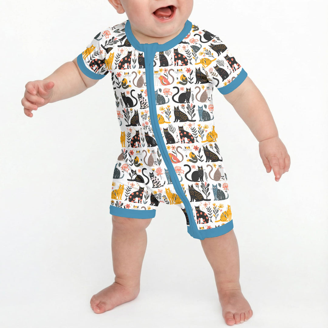 Playful folk-art style artwork featuring whimsical cats in varied poses, patterns, and colors, surrounded by hand-drawn florals and leaves. The repeating layout and warm, earthy palette create a cozy, cheerful feel—perfectly balanced between charming, modern, and storybook-like.