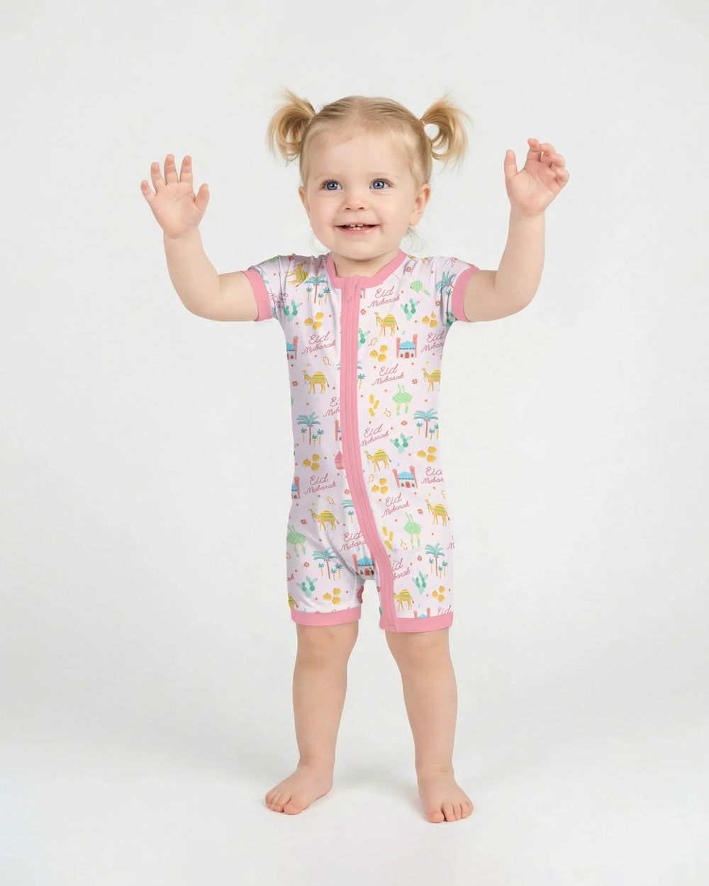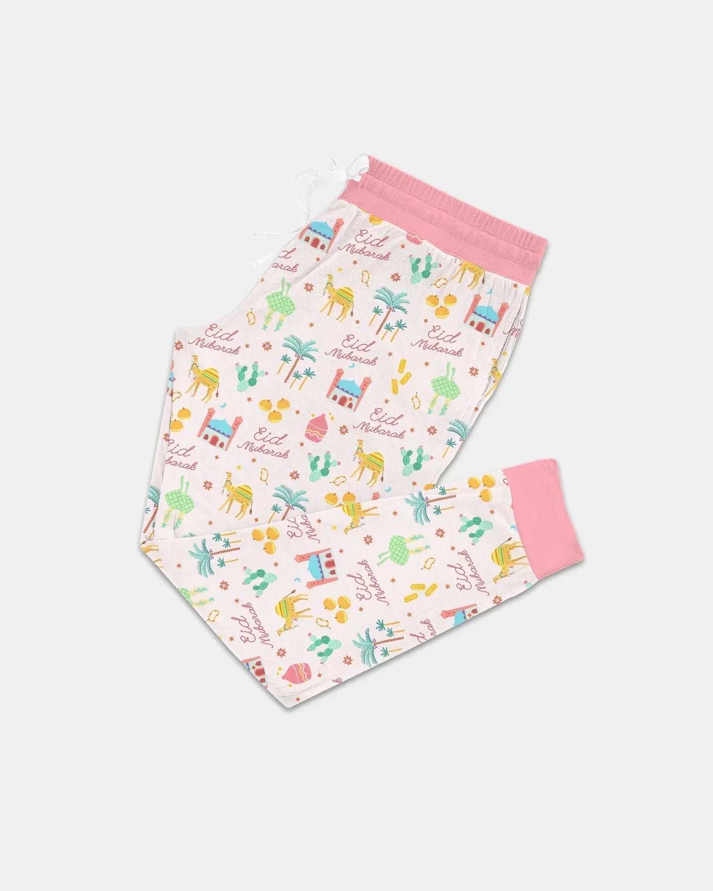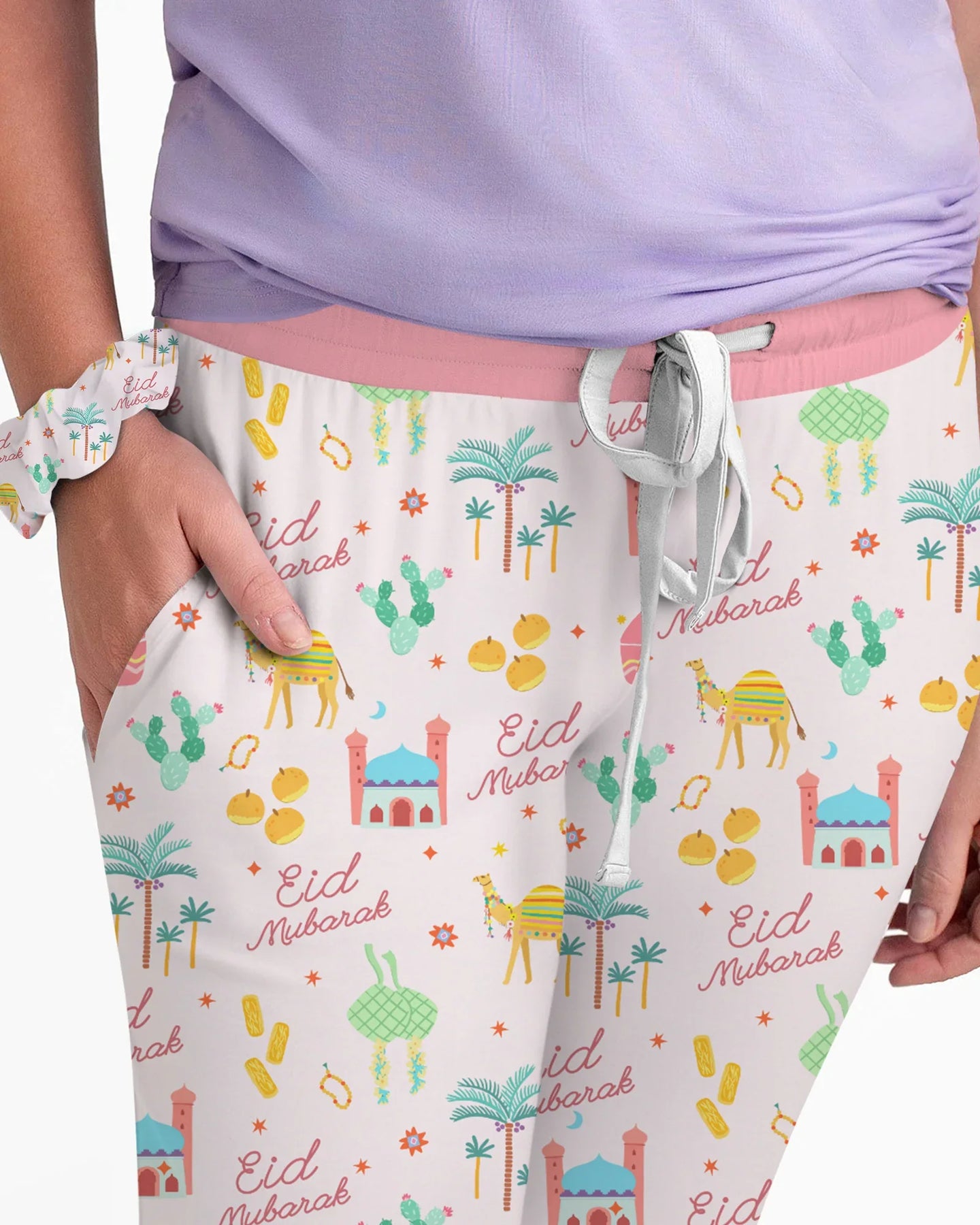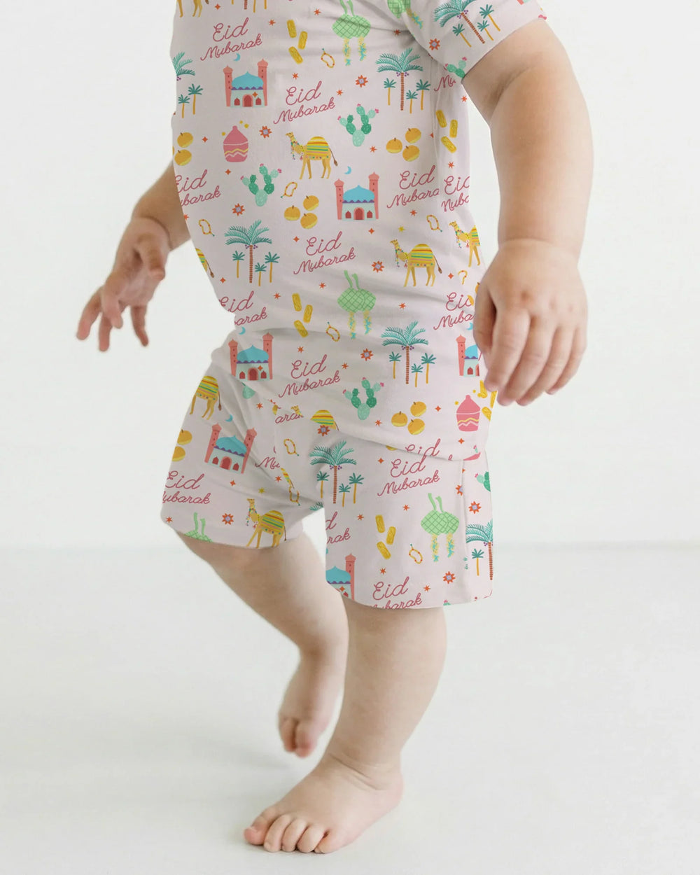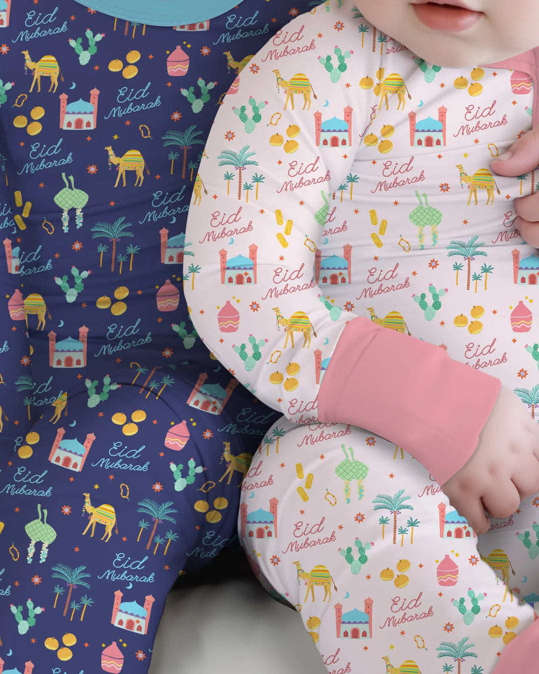 Fill your Eid celebrations with joy and unity in the Eid Mubarak Matching Family collection, featuring playful camels, palm trees, mosques, lanterns, and golden moons in soft pink and green pastels. "Eid Mubarak" script adds a heartfelt touch for families gathering to break the fast or share iftar.