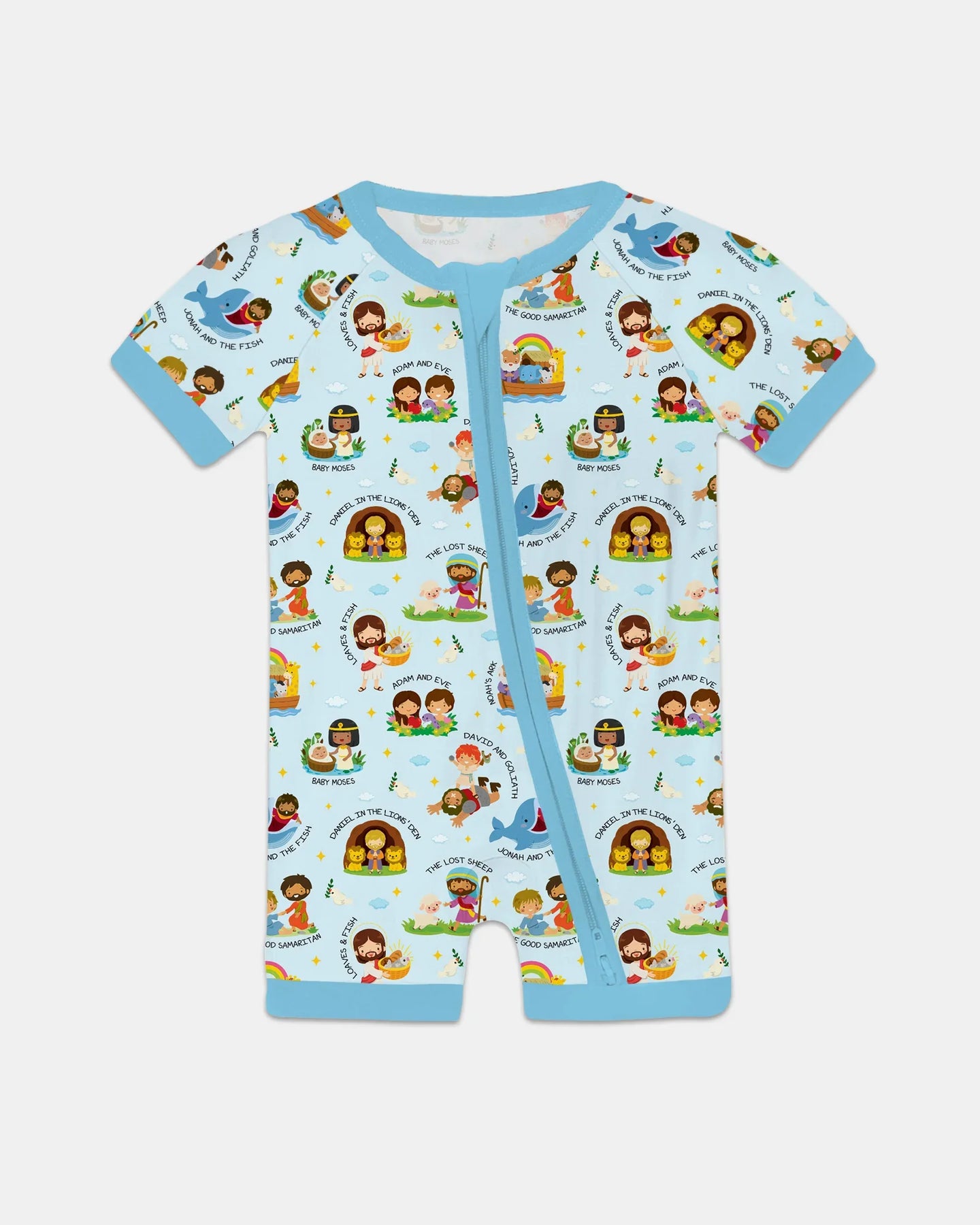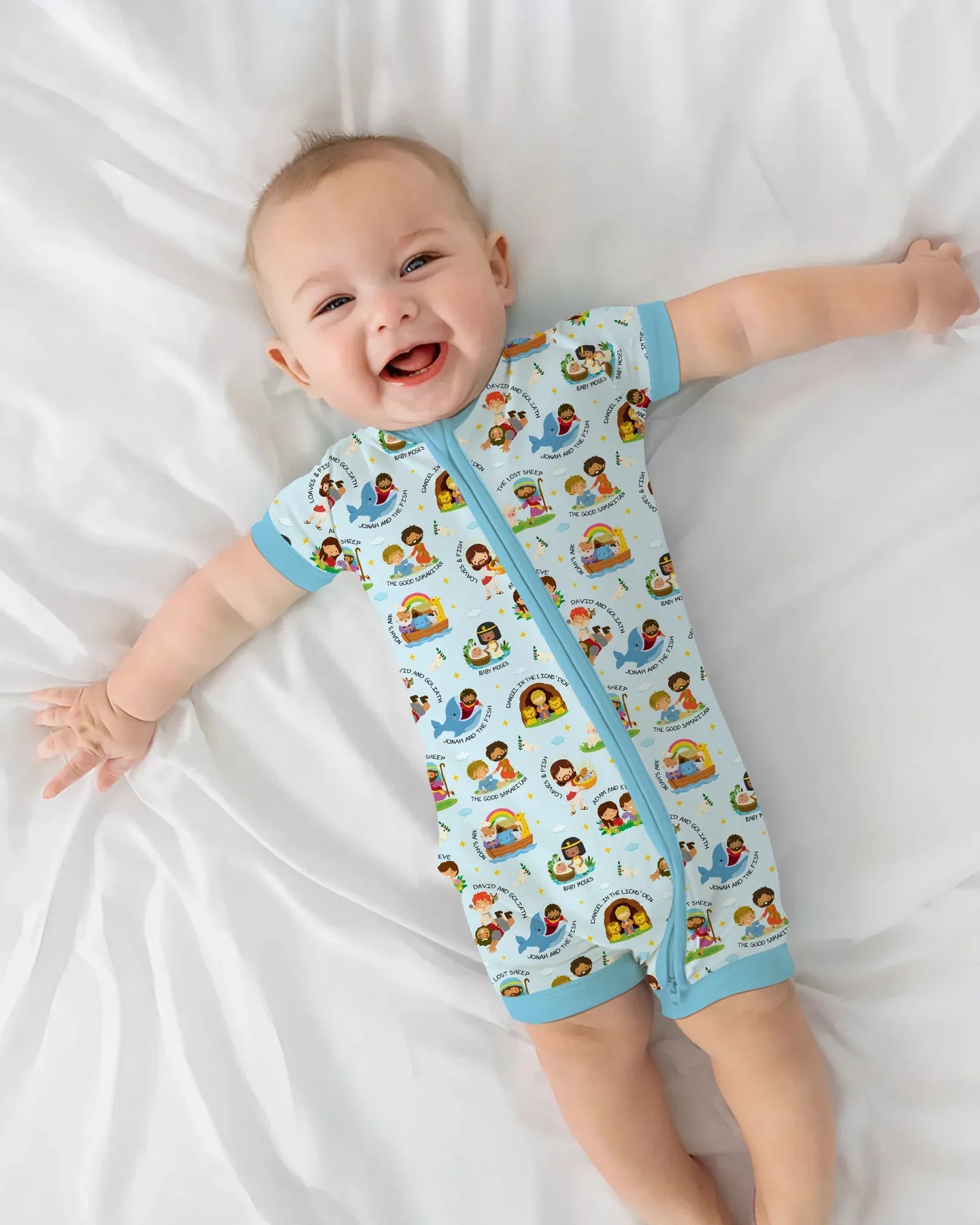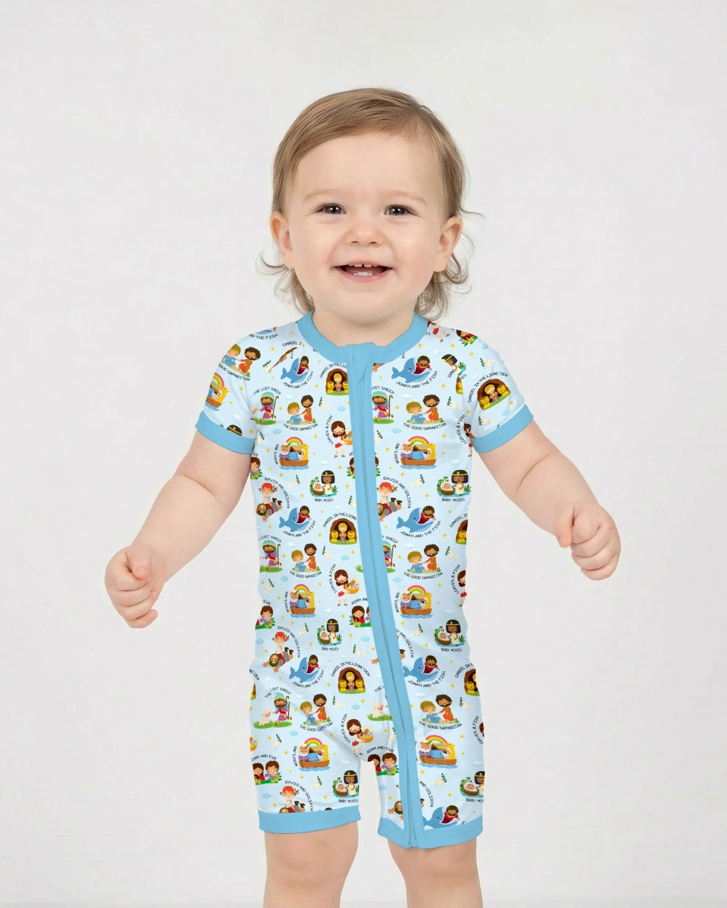 A gentle, story-filled collection inspired by beloved Bible stories, thoughtfully illustrated for babies and young children. Each design features familiar moments and characters from Scripture, presented in a playful, child-friendly style that feels joyful, warm, and easy to love.