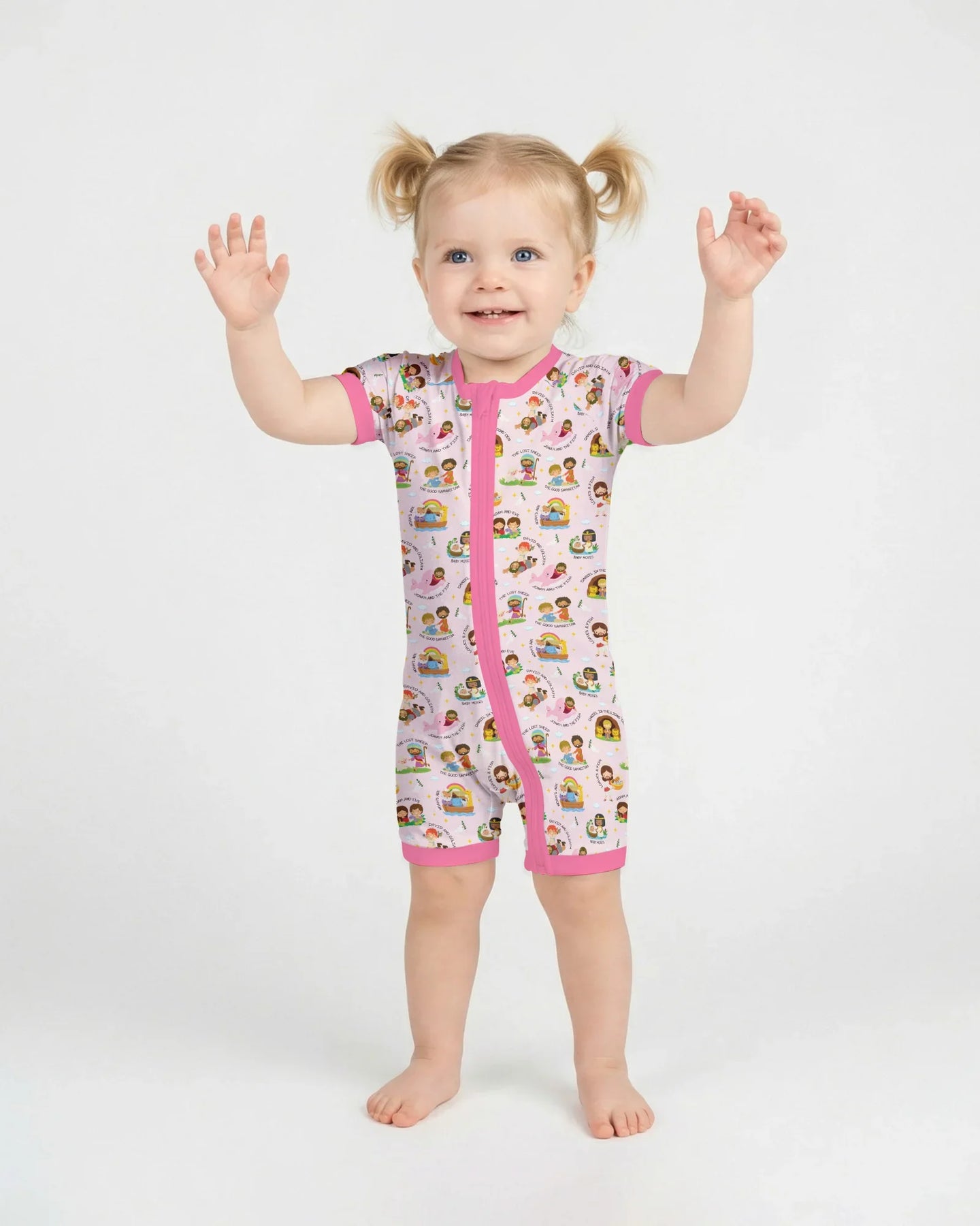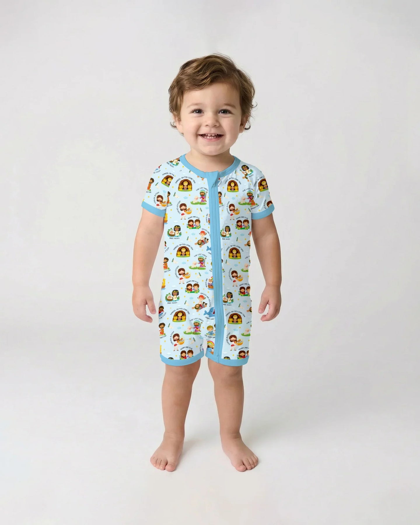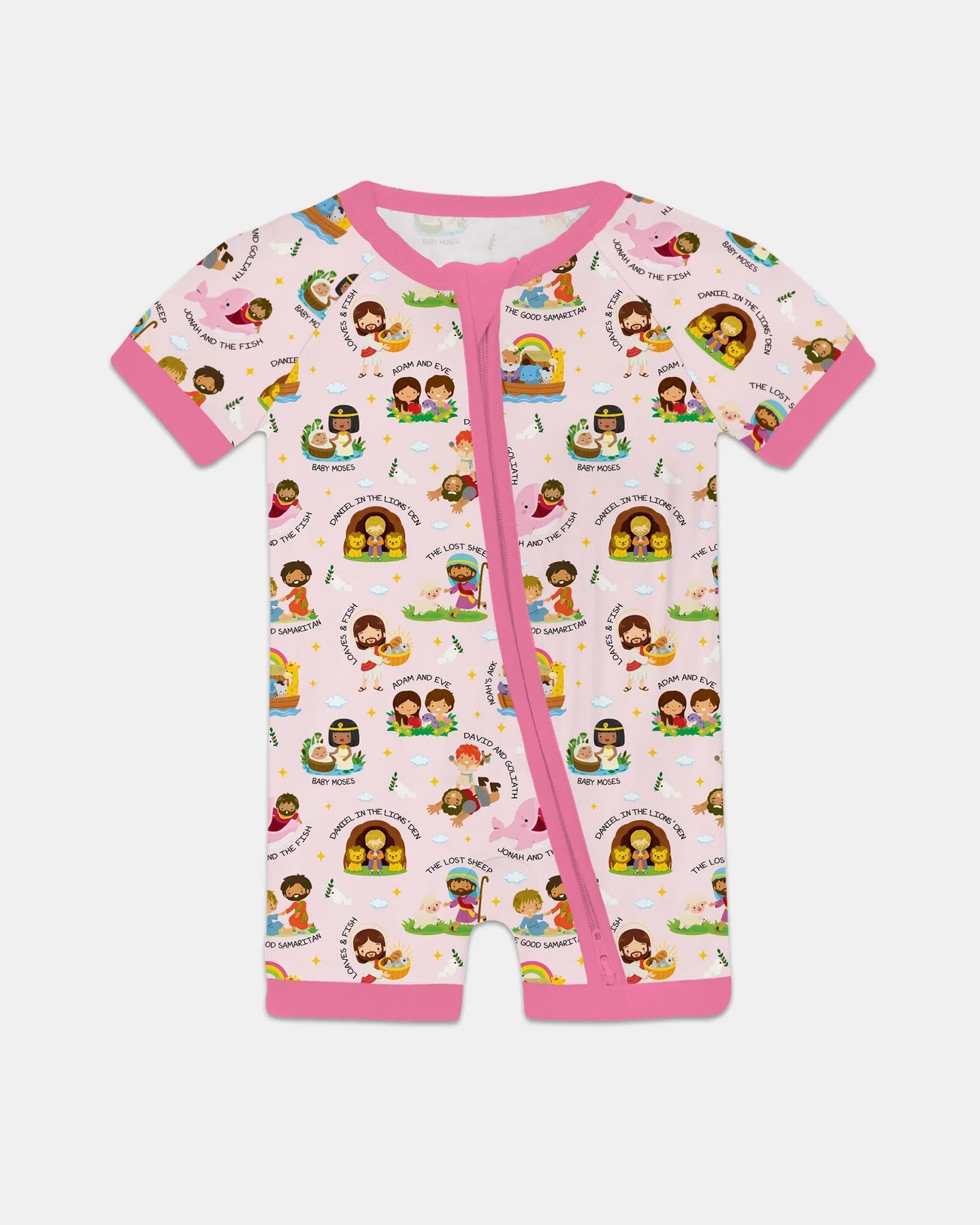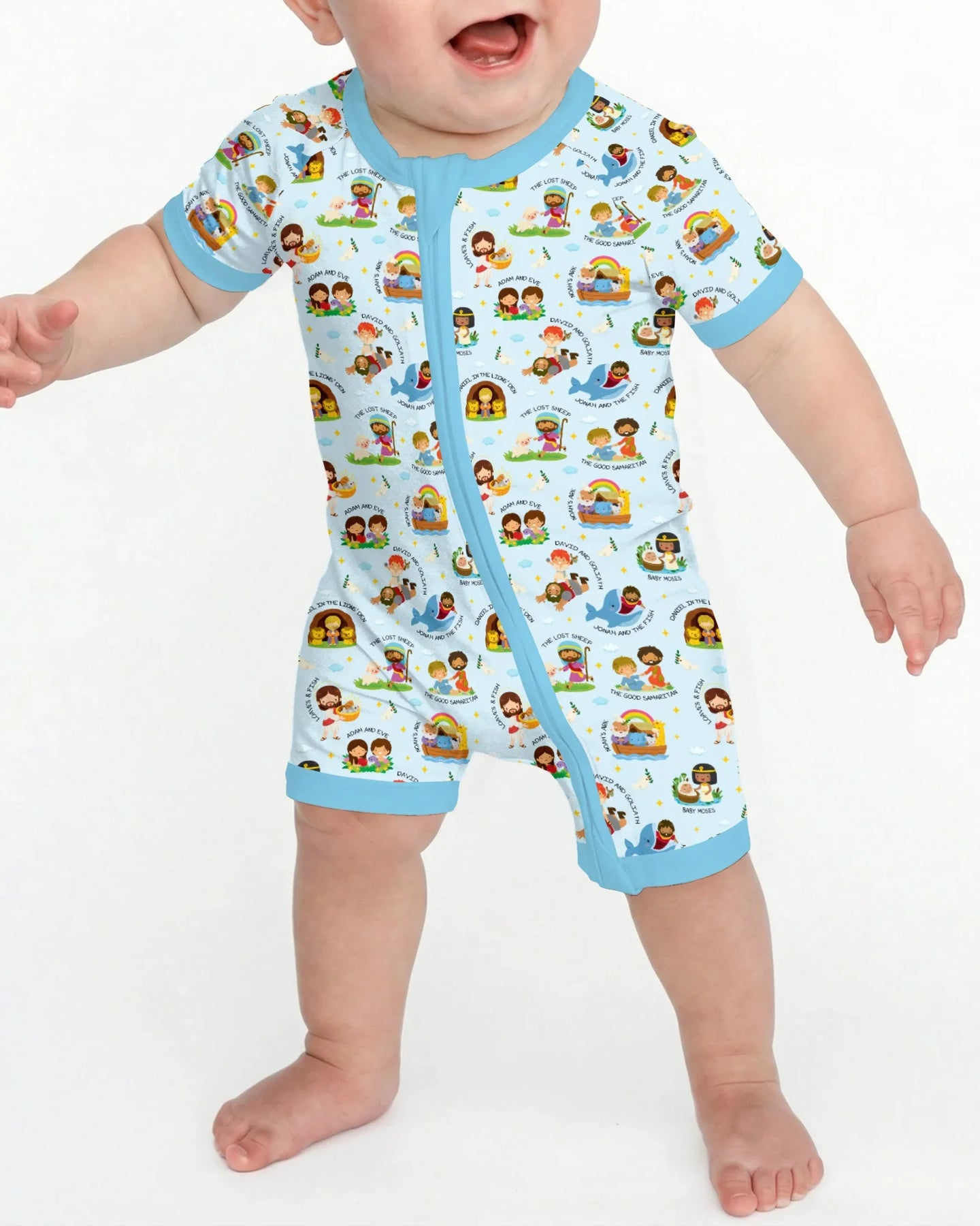 A gentle, story-filled collection inspired by beloved Bible stories, thoughtfully illustrated for babies and young children. Each design features familiar moments and characters from Scripture, presented in a playful, child-friendly style that feels joyful, warm, and easy to love.