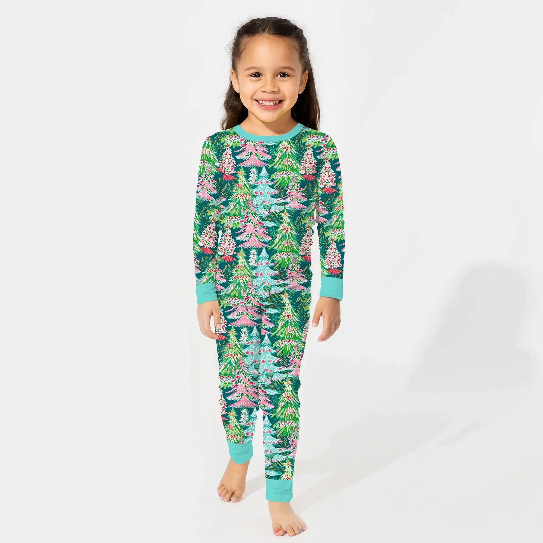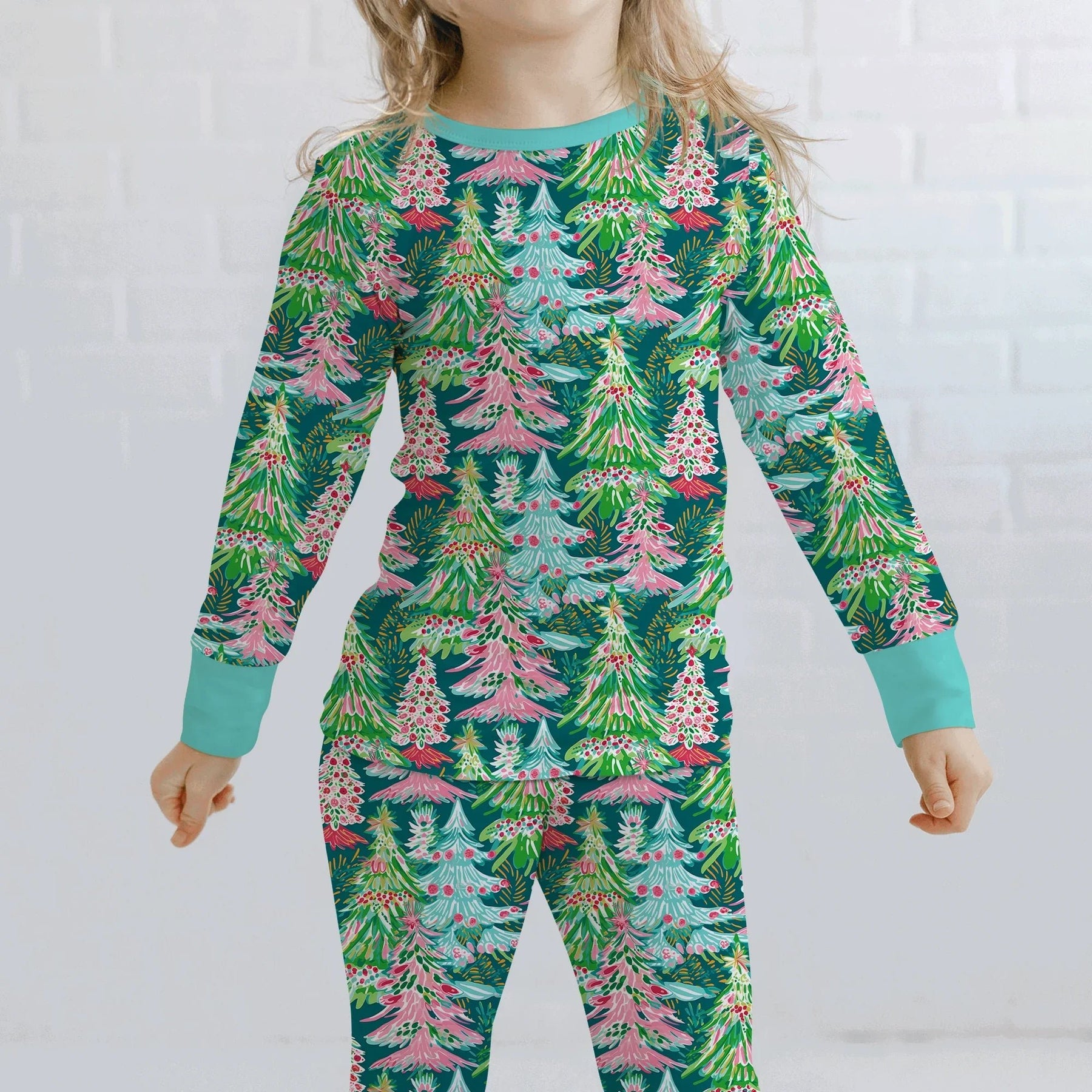 Celebrate the magic of the season with our Brushstroke Merry Trees Outfit! Adorned with a colorful mix of pink and green Christmas trees, this cheerful design brings holiday joy to every bedtime. Made from soft, breathable fabric, these pajamas keep your little one cozy through winter nights, story times, and Christmas morning fun.