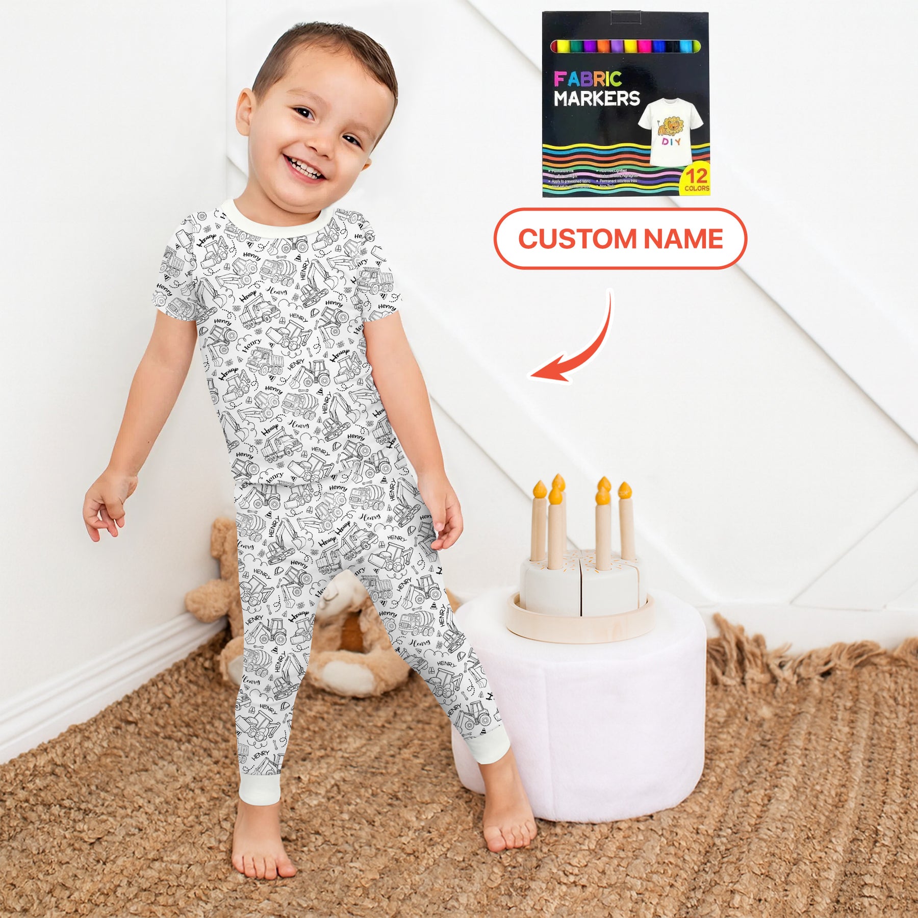 Featuring dump trucks, excavators, forklifts, cement mixers, and more—kids can color their own pajamas using the included fabric markers. Each piece is personalized with their name, making creativity even more special.