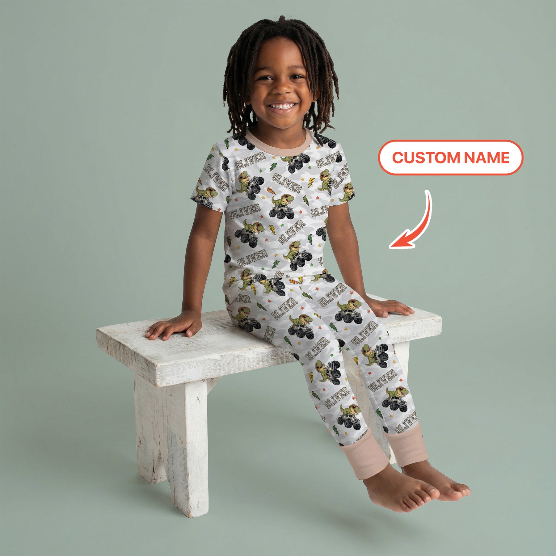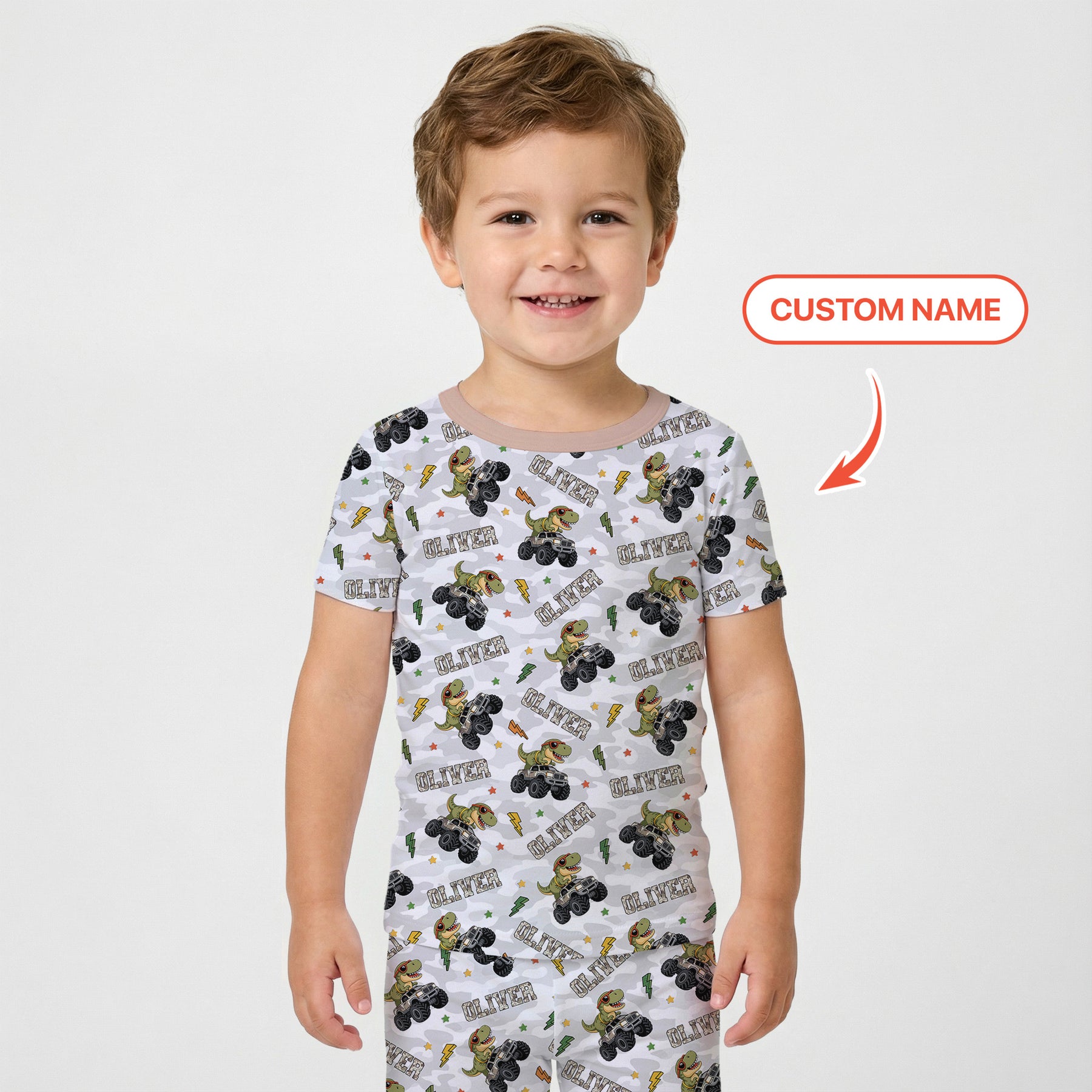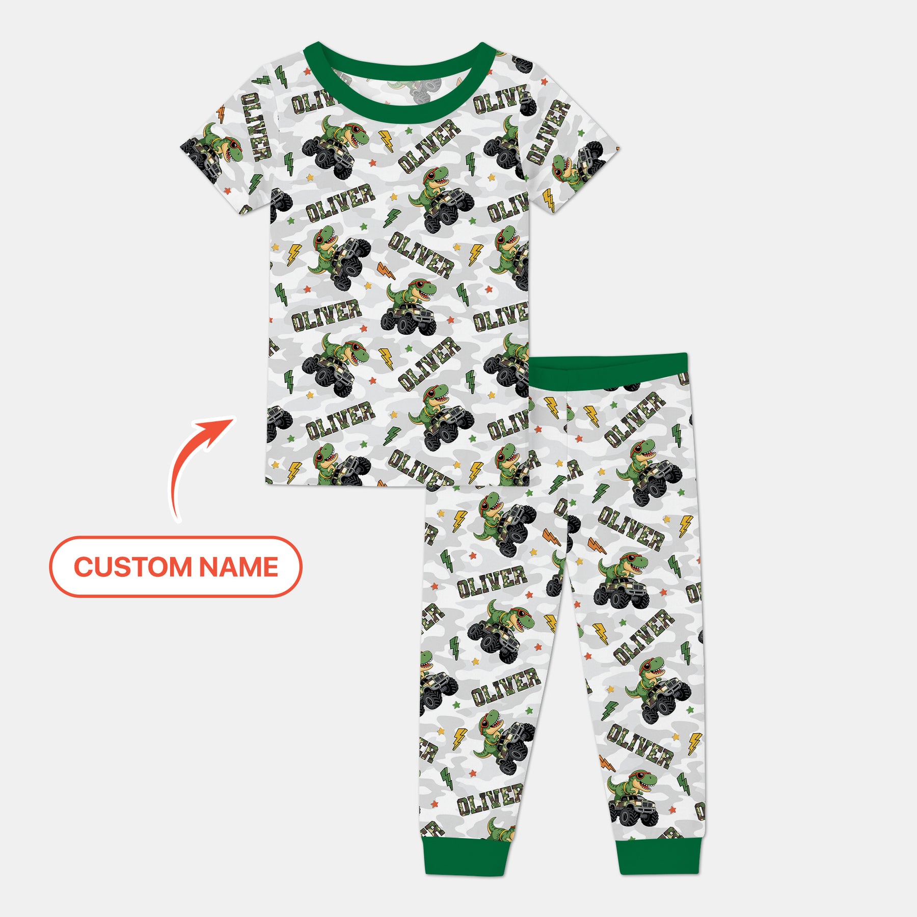 Custom Name Camo Trucker Dino Two Piece Short Sleeve Pajama Set