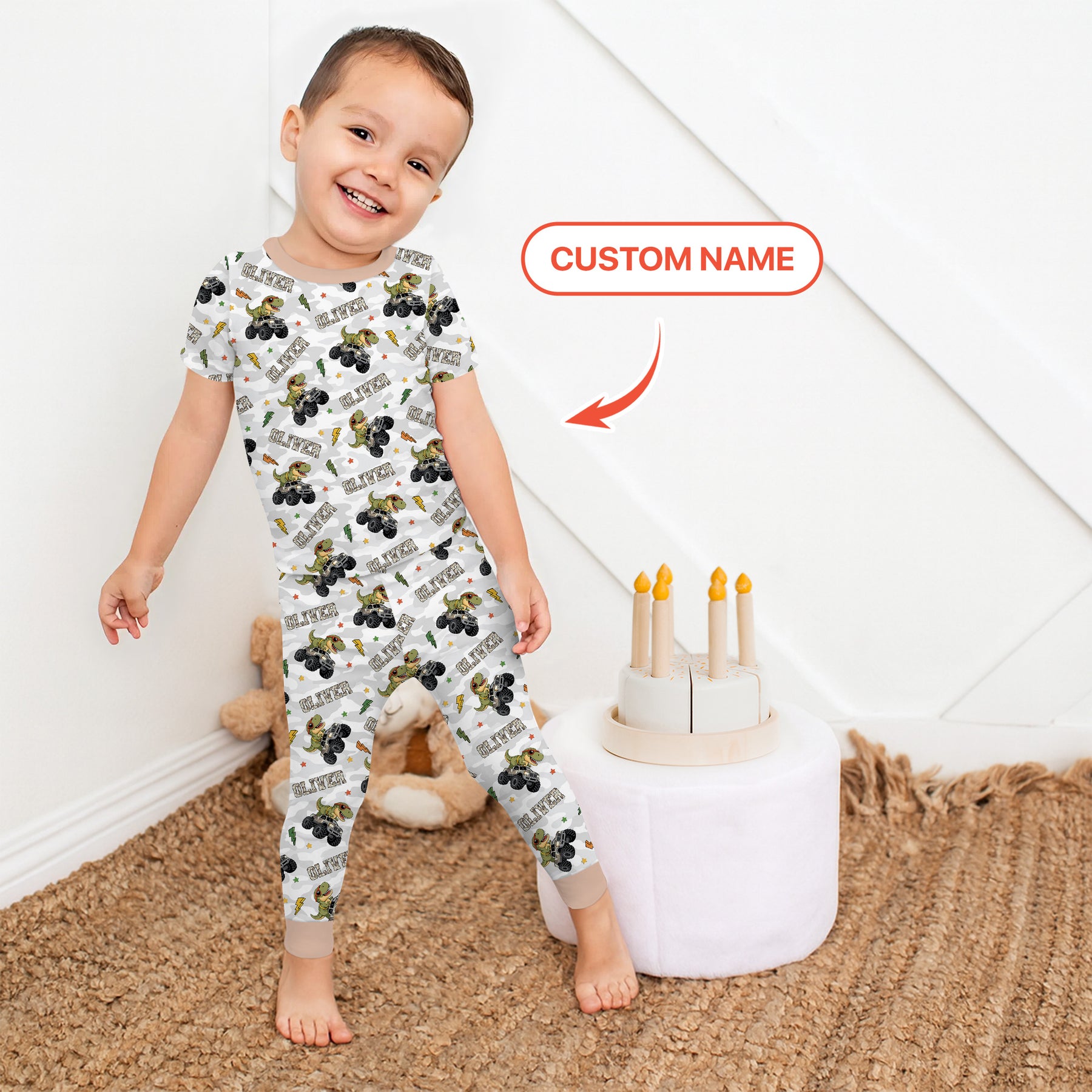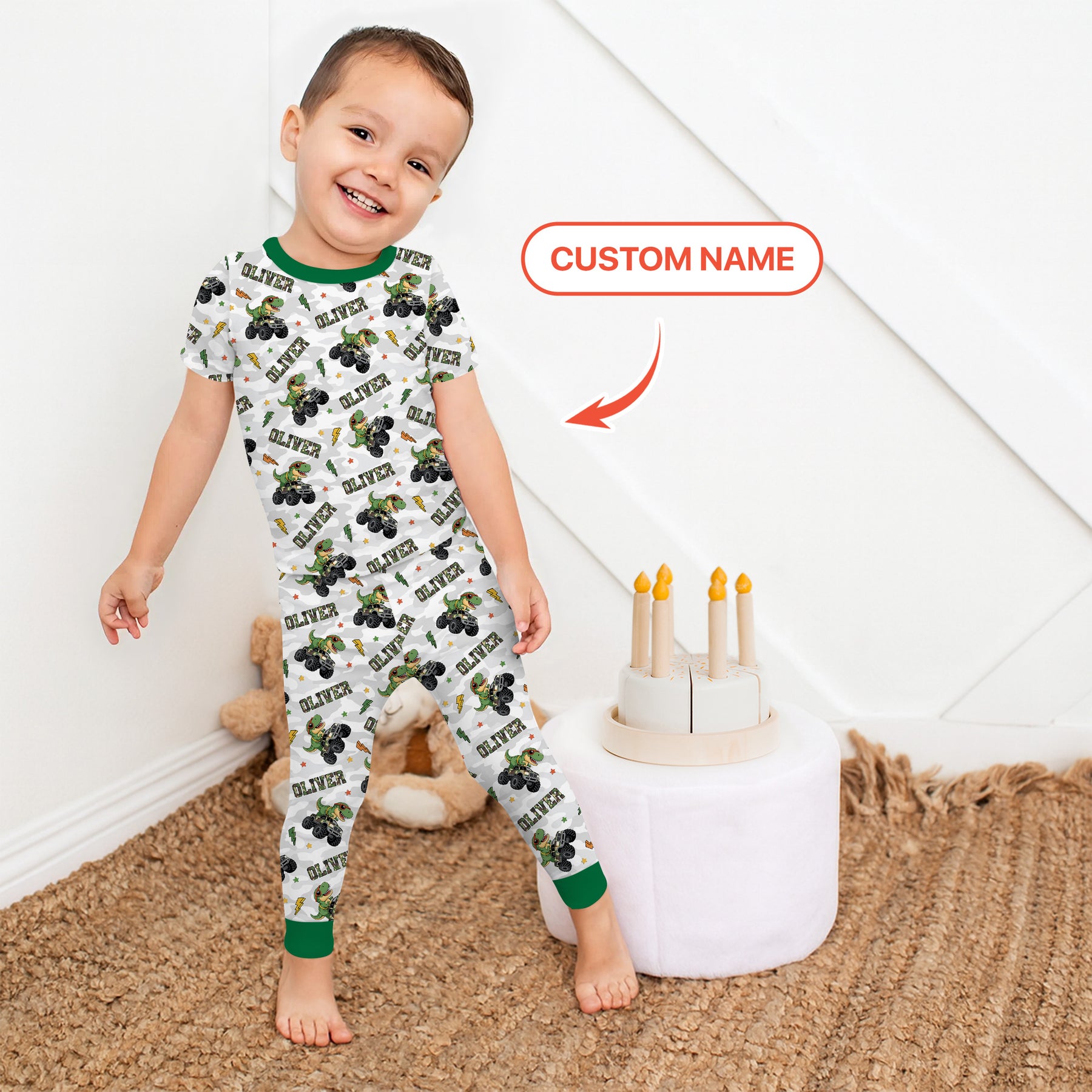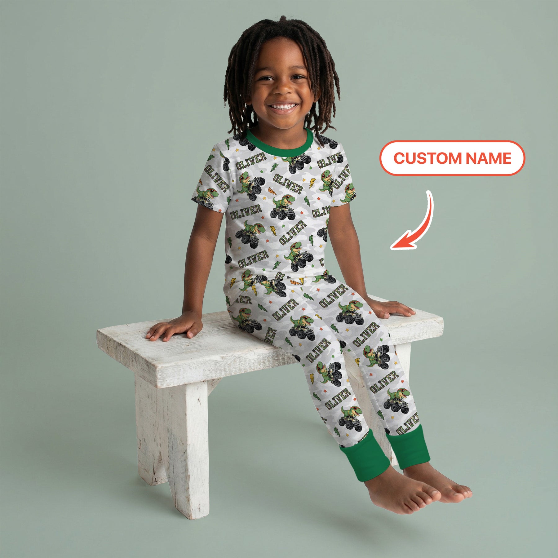 Custom Name Camo Trucker Dino Two Piece Short Sleeve Pajama Set