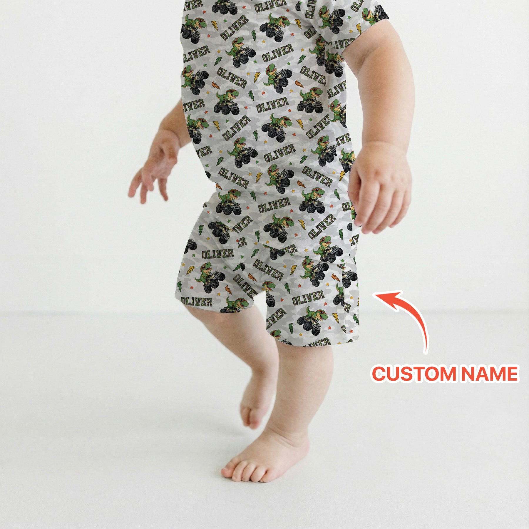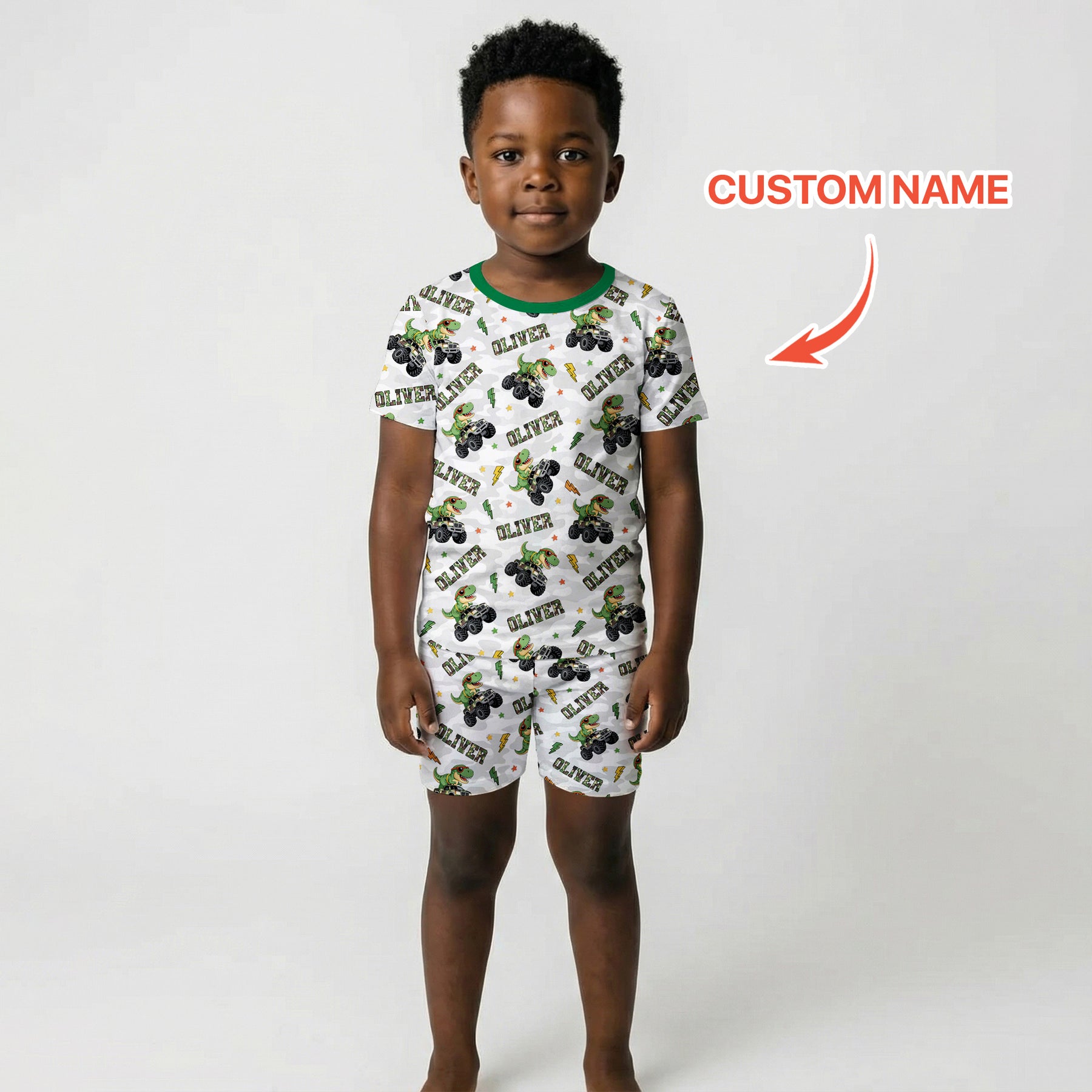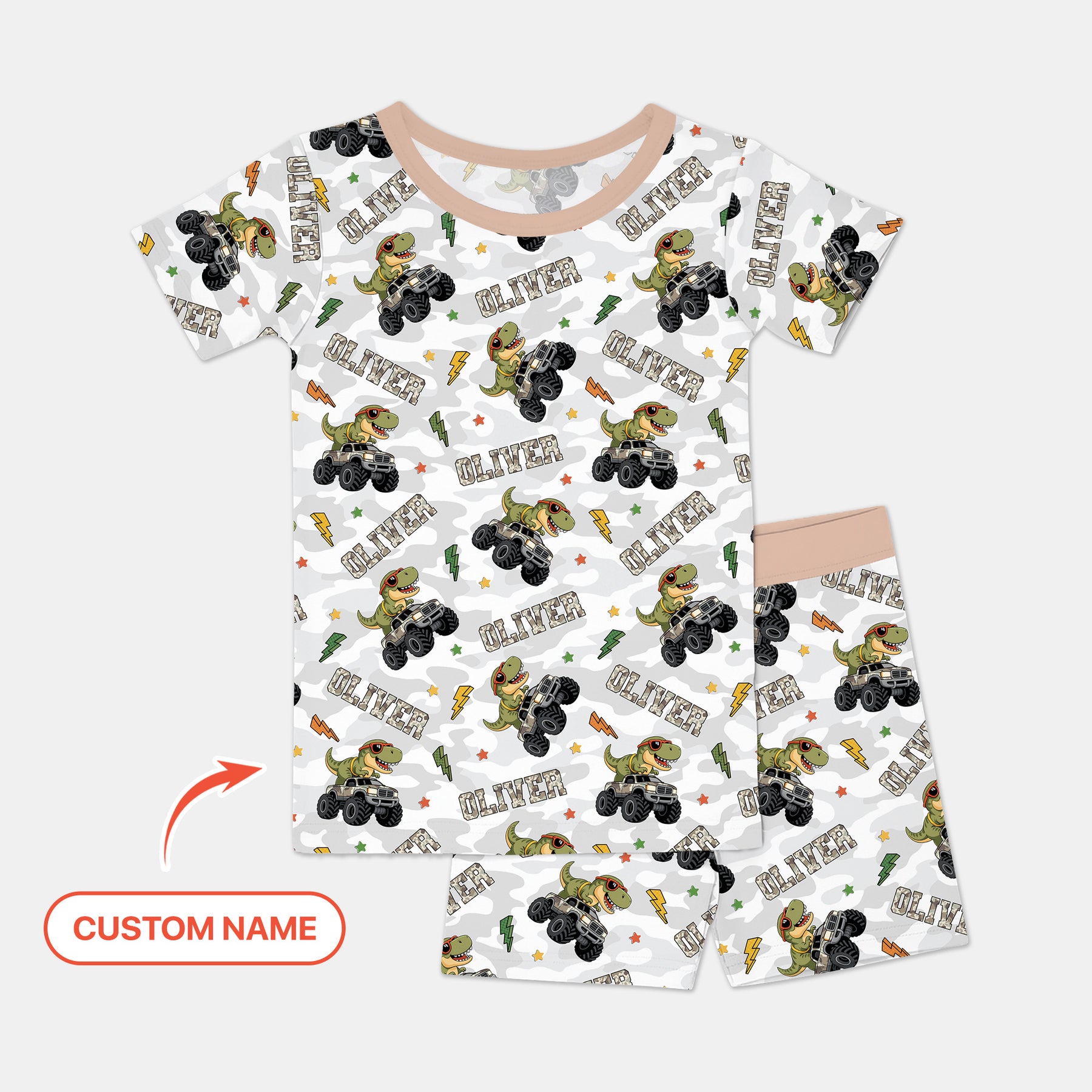 Custom Name Camo Trucker Dino Two Piece Short Sleeve Shorts Pajama Set
