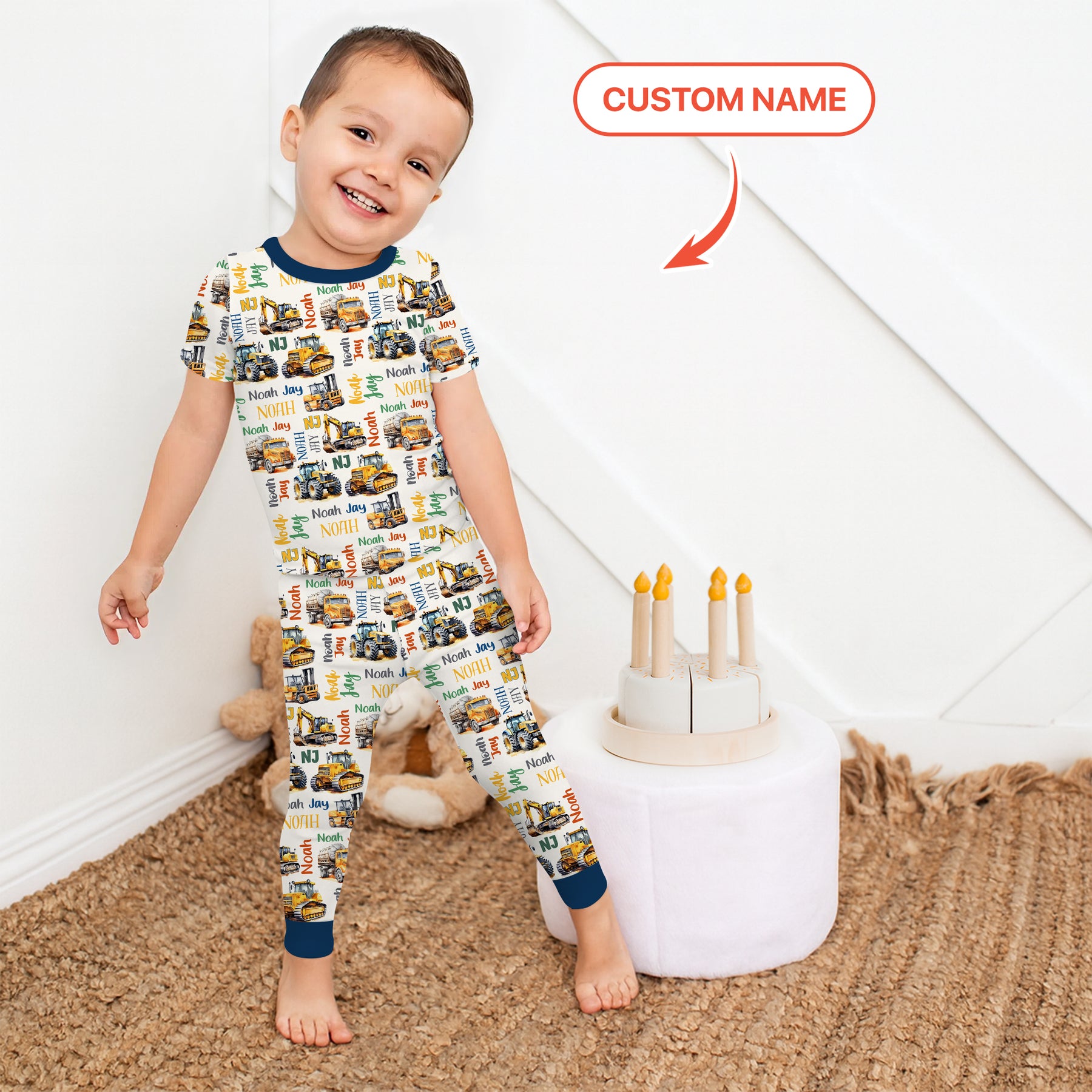 Custom Name Construction Trucks Two Piece Short Sleeve Pajama Set
