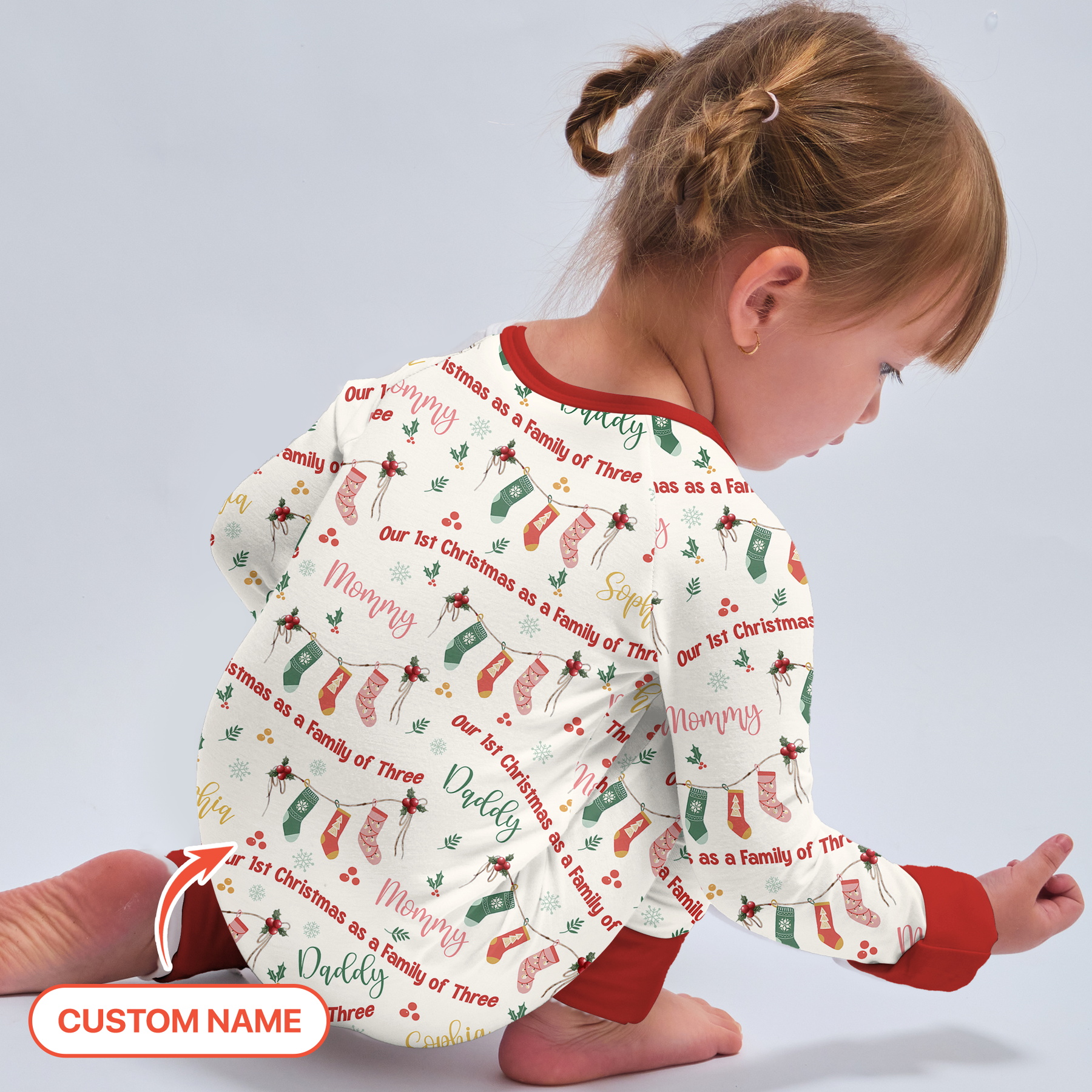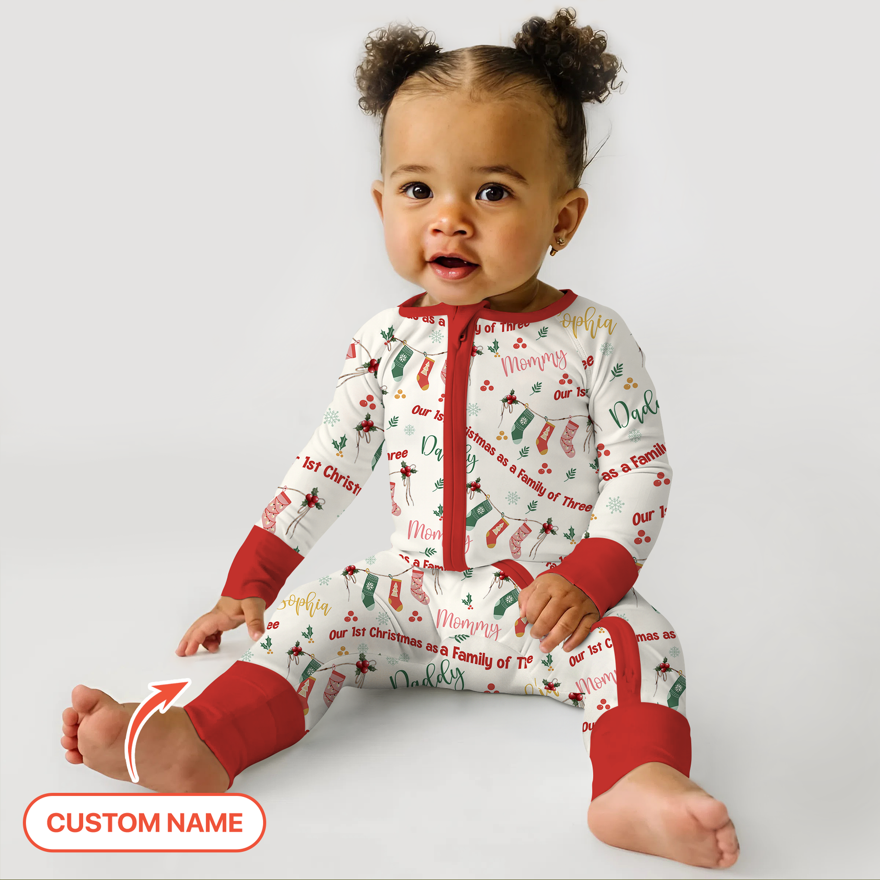 Celebrate cozy family moments with our Custom Name Family Christmas Stockings Zippy & Pajamas. Crafted from buttery-soft, breathable bamboo fabric, these PJs feature a charming stockings print and can be personalized with your family’s names. Perfect for matching holiday photos, cuddles, and Christmas morning fun!