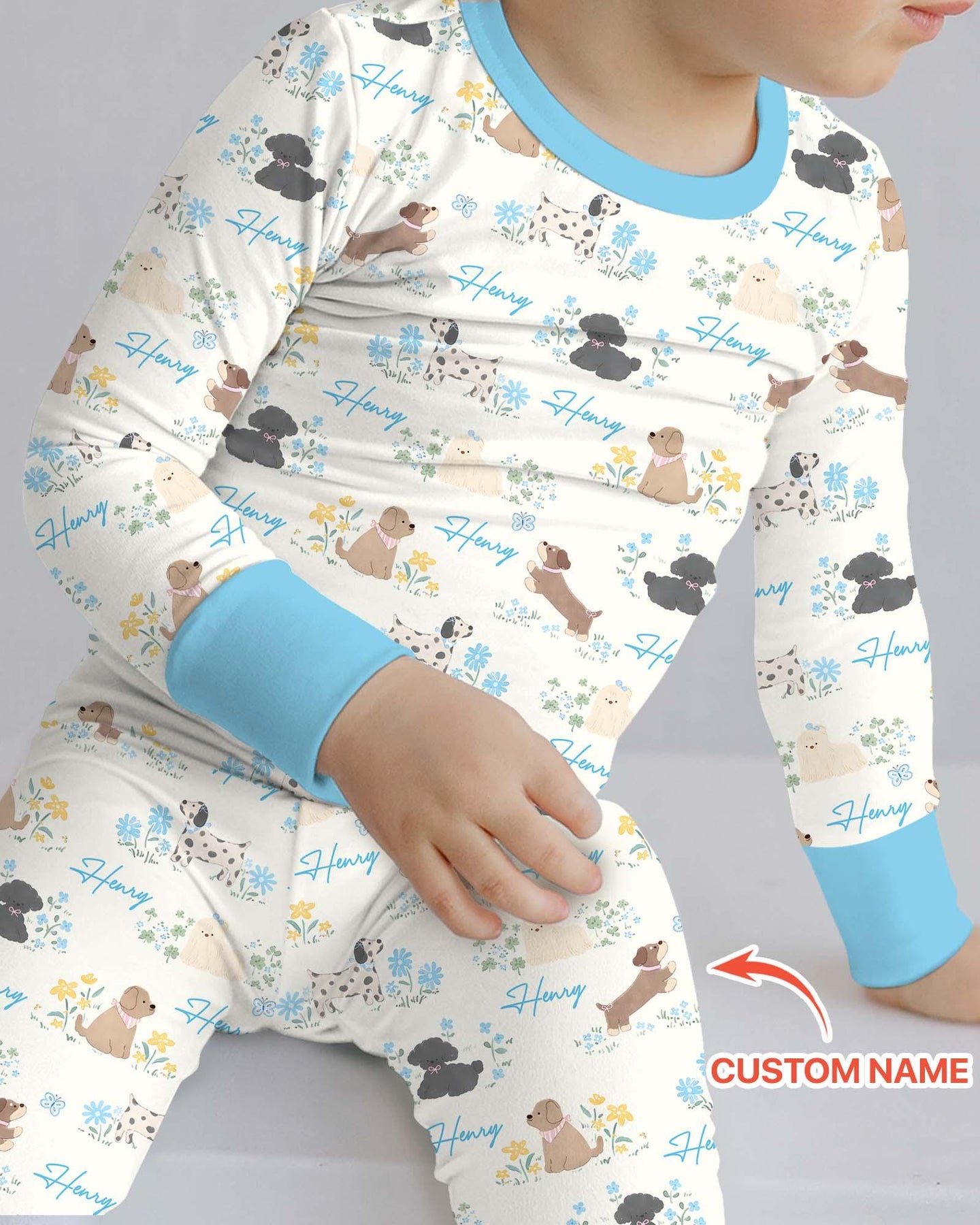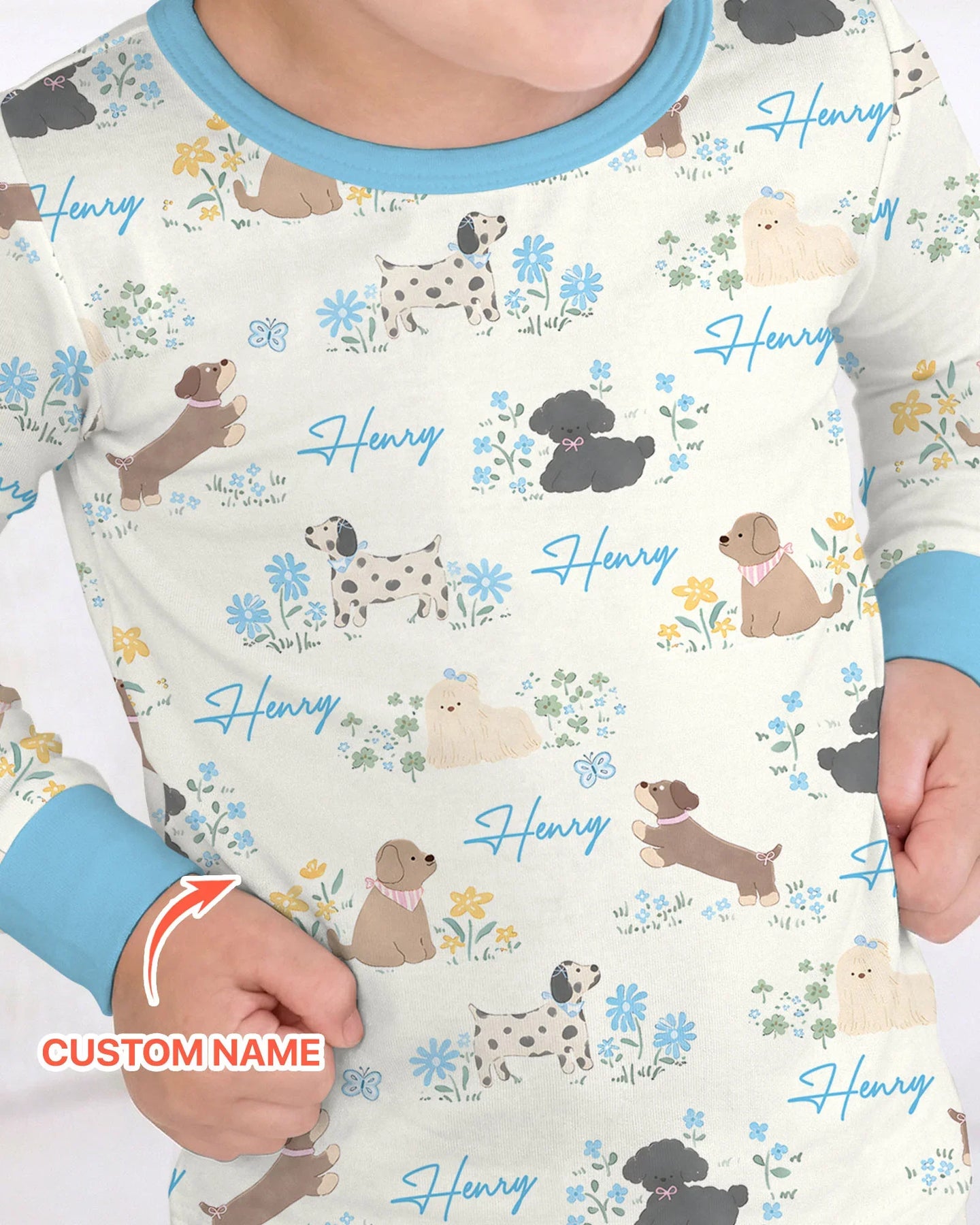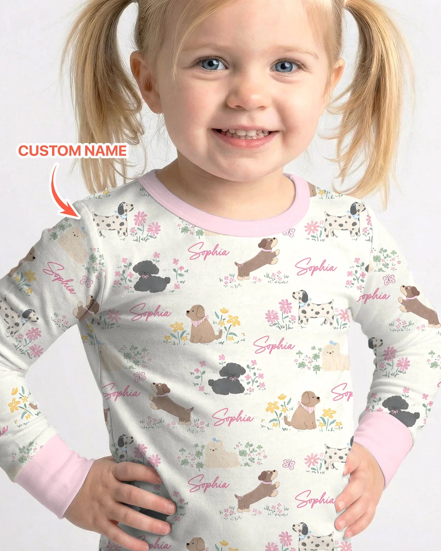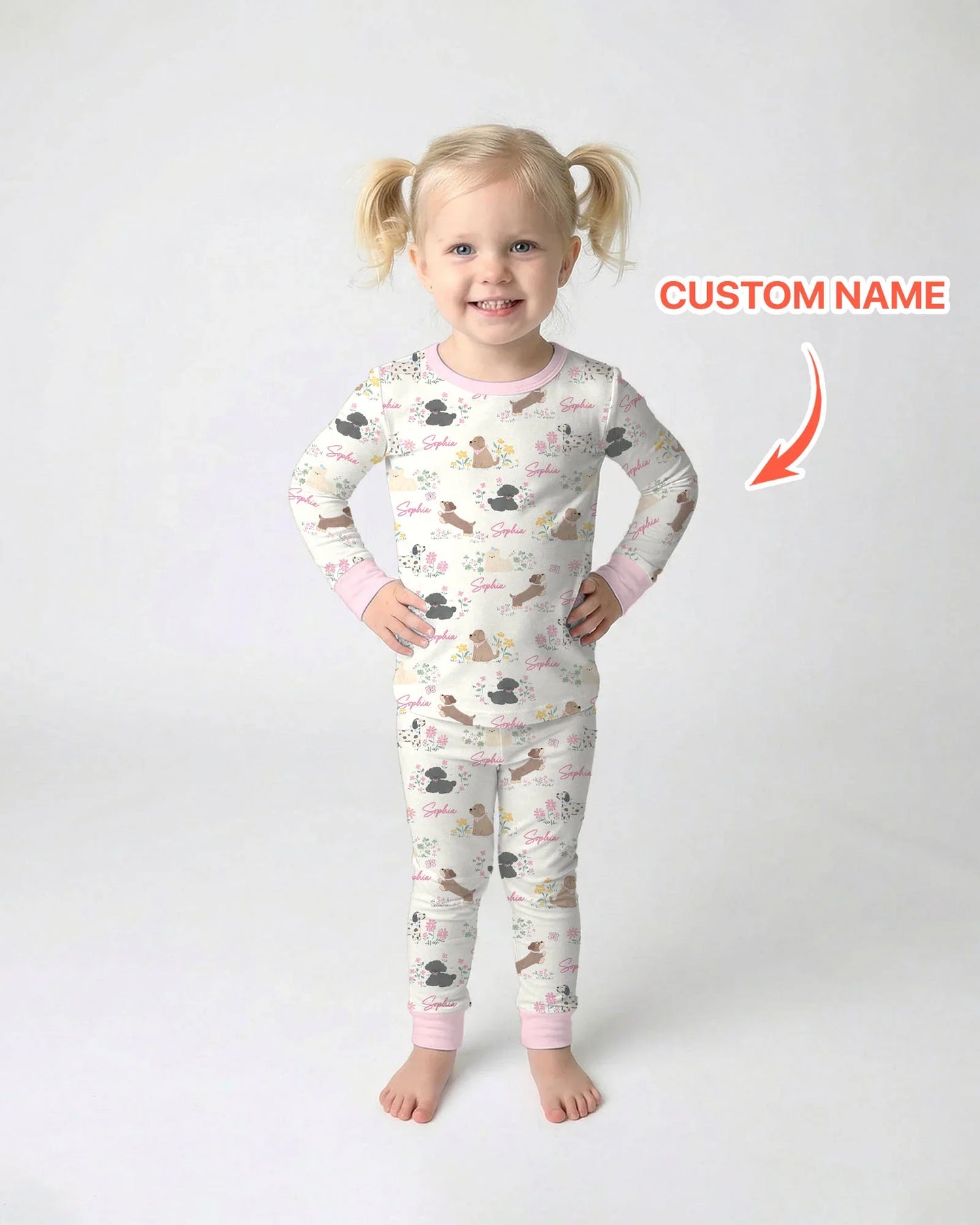 Custom Name Flower Dogs Two Piece Long Sleeve Pajama Set