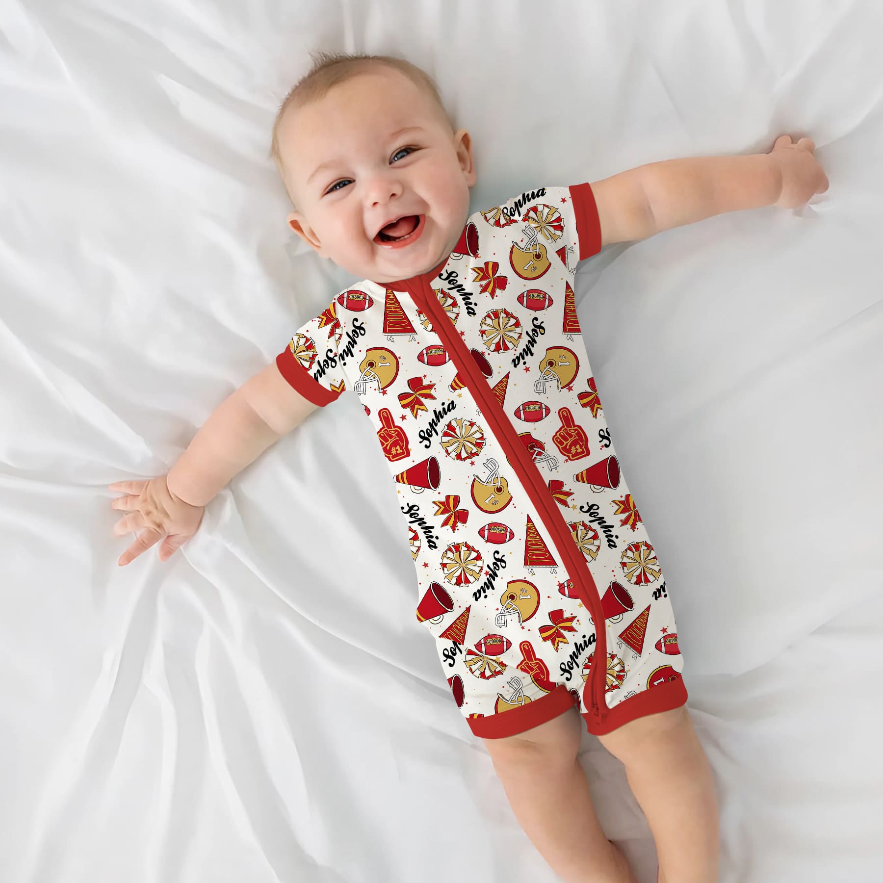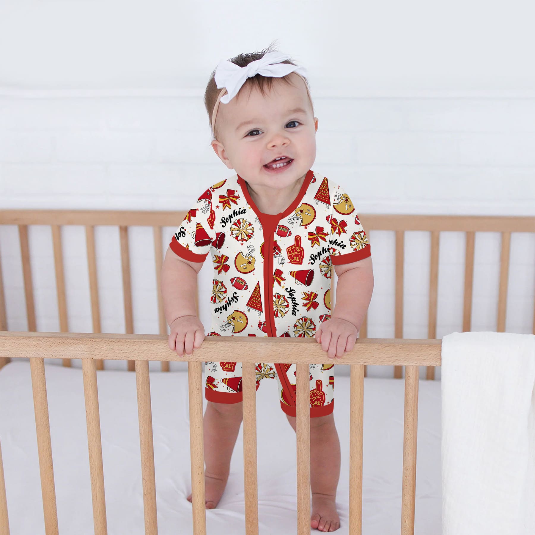 This spirited print is filled with pom-poms, helmets, megaphones, bows, footballs, and your child’s very own name—perfect for little fans who love cheering loud and proud! The playful mix of red and gold makes every sleep, play, or lounge moment feel like a game-day celebration.