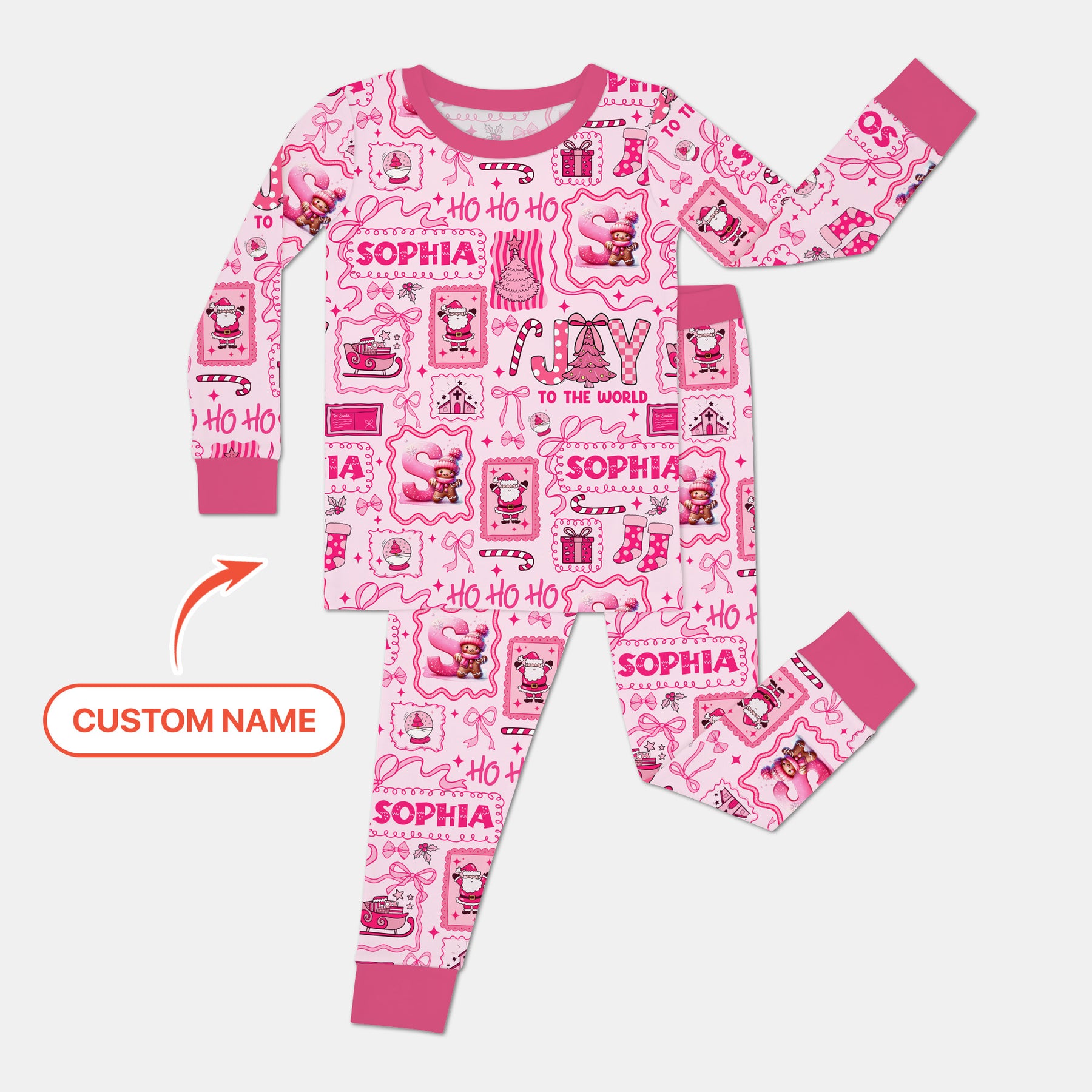 Custom Name Preppy Pink Christmas Two Piece Long Sleeve Pajama Set