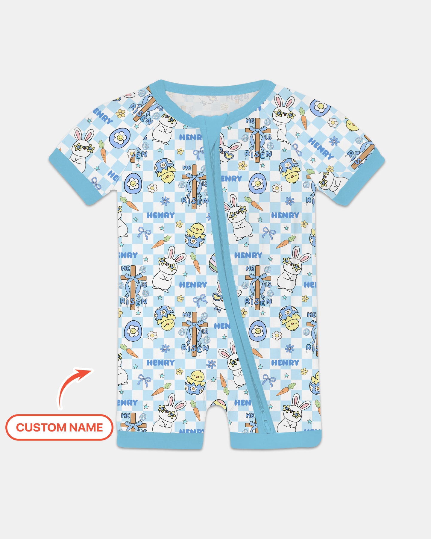 This charming pattern mixes vintage Easter vibes with sweet bunnies, eggs, bows, and crosses alongside the uplifting message âHe Is Risen,â all personalized with your childâs name. Made from our signature buttery-soft, breathable bamboo fabric, these pajamas keep little ones comfy day and night while celebrating the joy of Easter. Perfect for Easter morning, church days, family photos, and cozy spring nights đâ¨