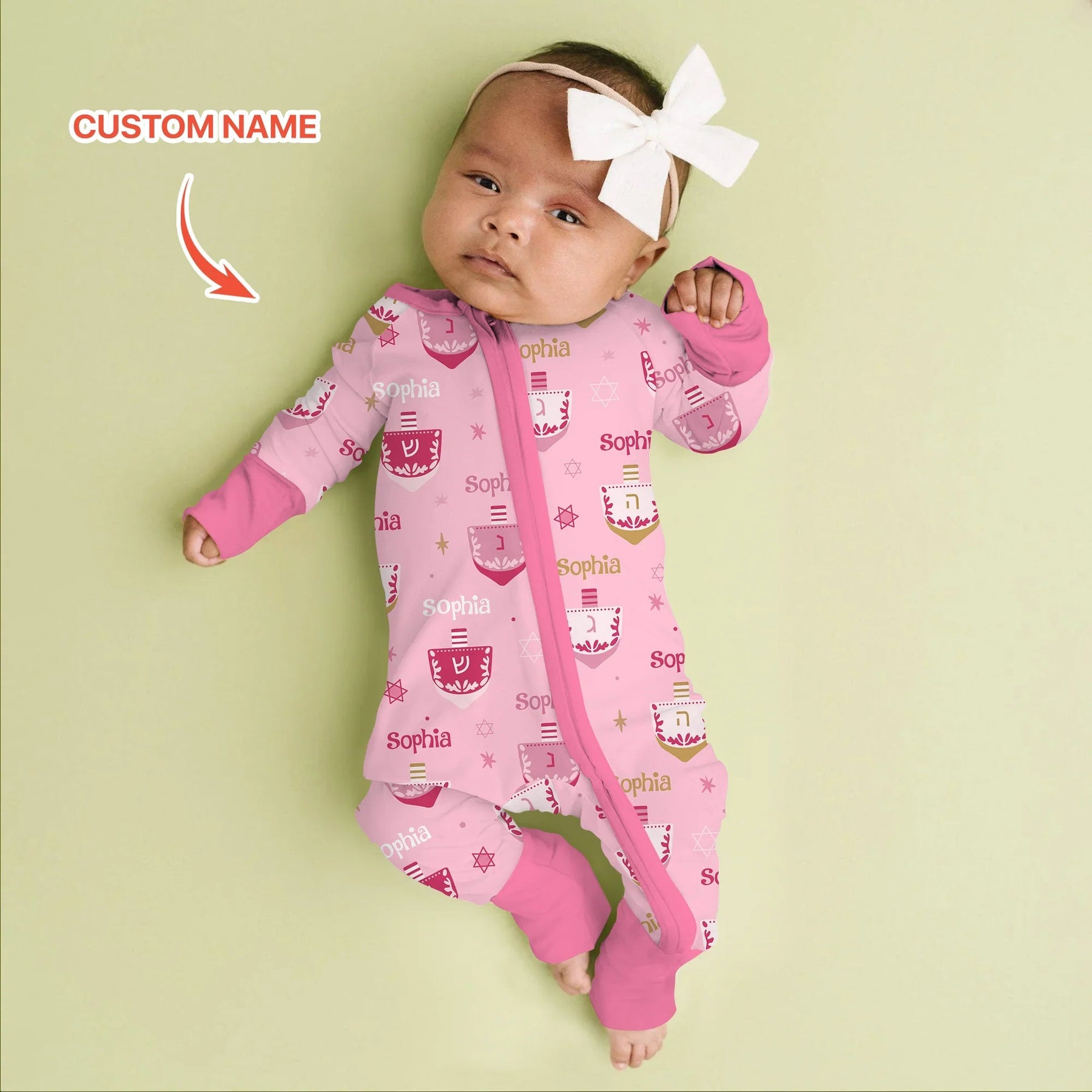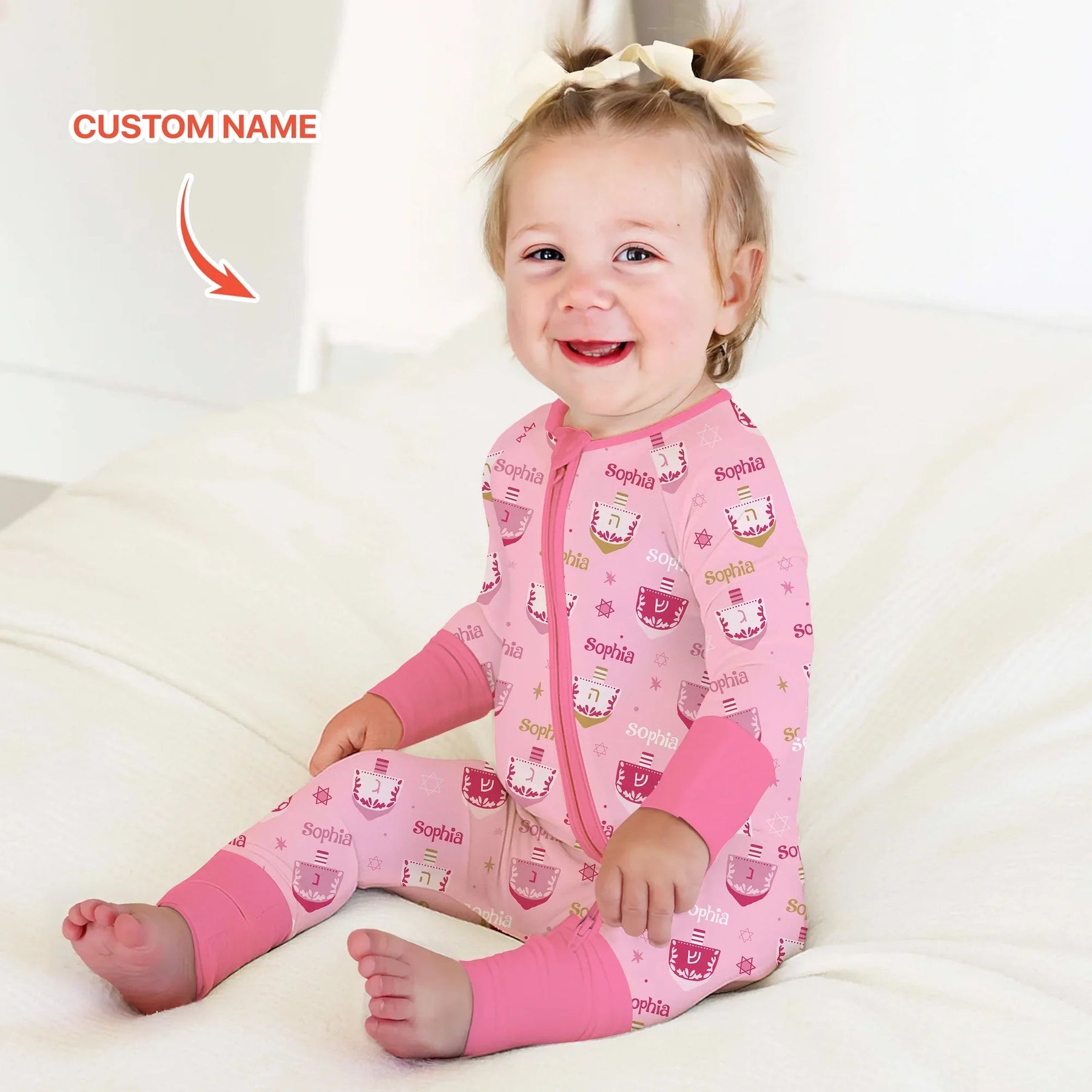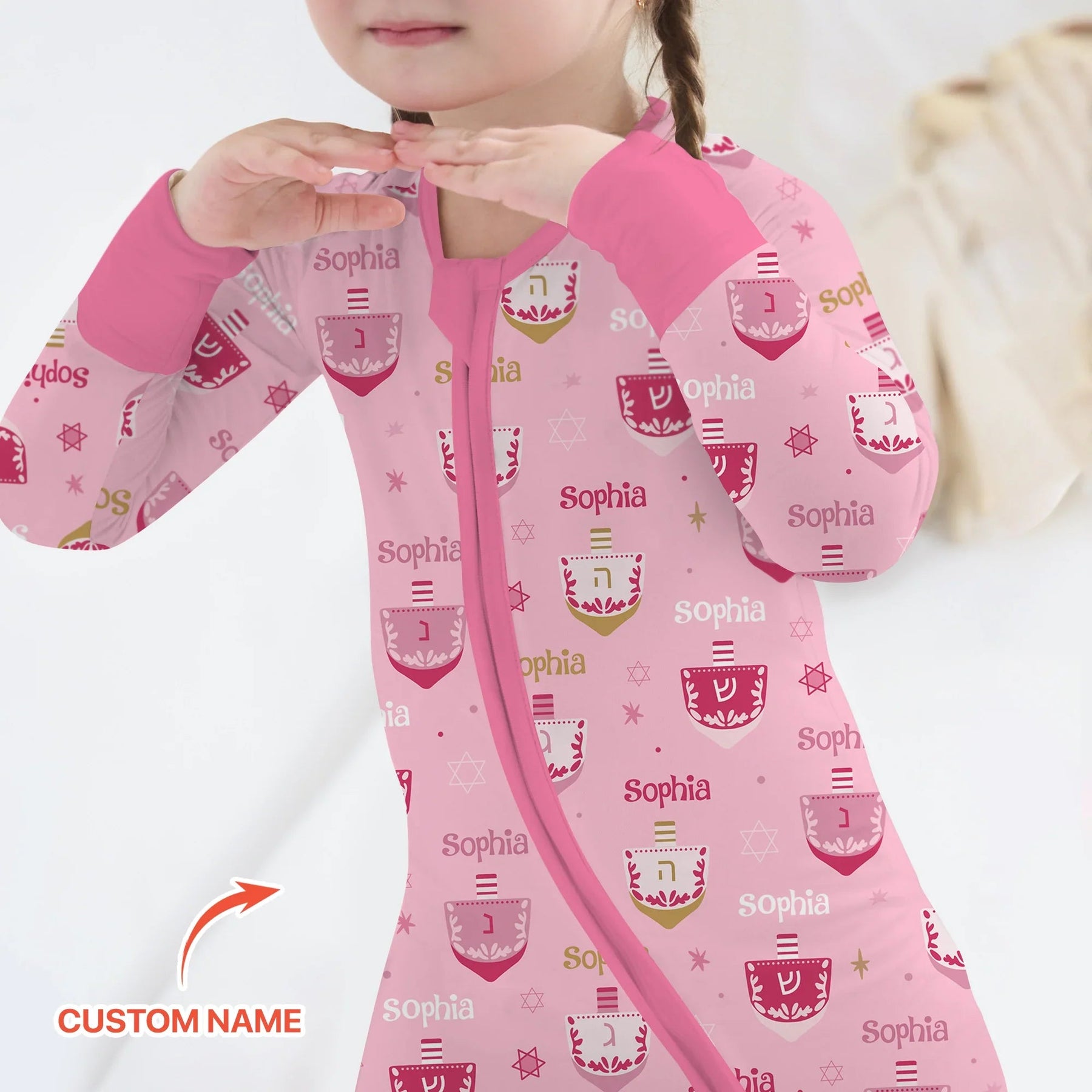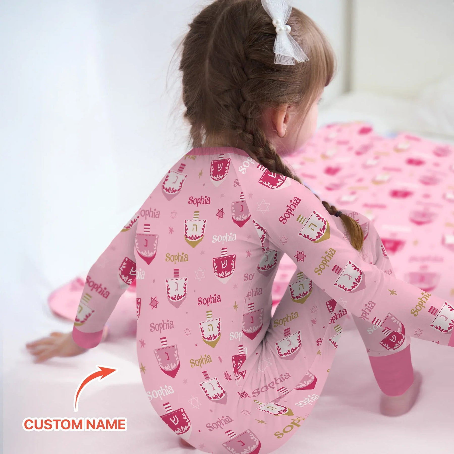 🕎✨ Celebrates the Festival of Lights with cozy, customizable bamboo pajamas. Featuring playful menorah and dreidel patterns in soft pink and navy hues, this collection spreads warmth, joy, and family connection all season long.