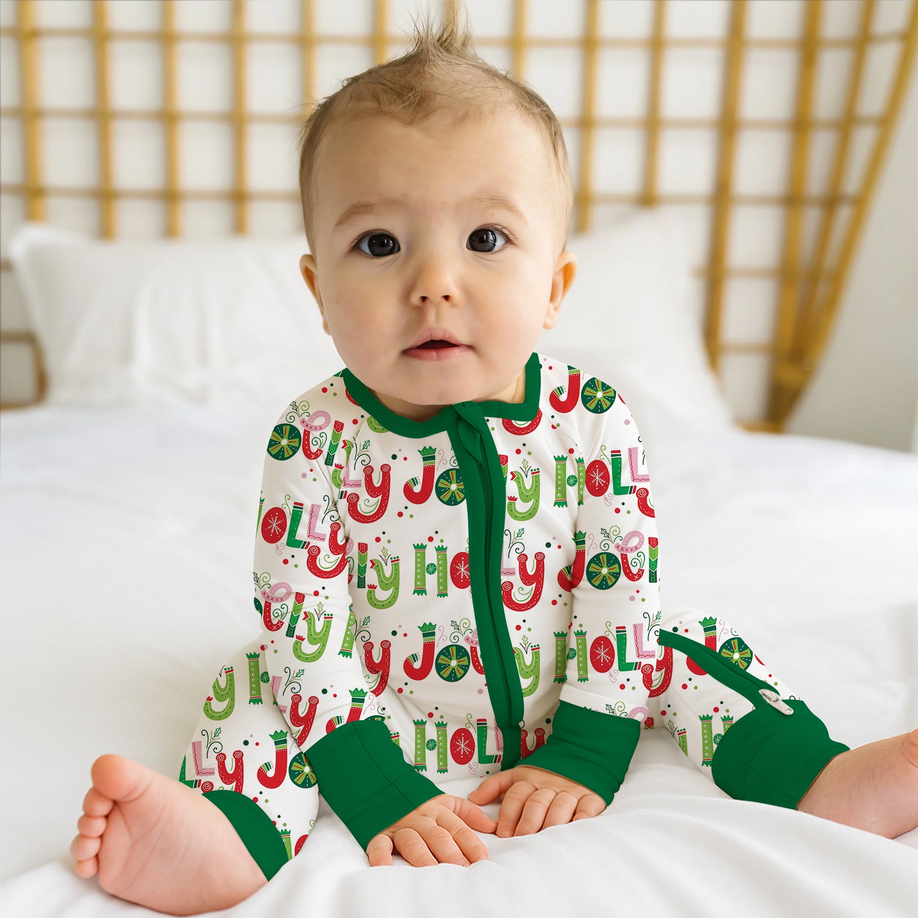 Covered in bright red and green “Holly Jolly” lettering with playful festive icons — candy canes, ornaments, and snowflakes — this pajama set perfectly captures the joy and sparkle of Christmas morning.