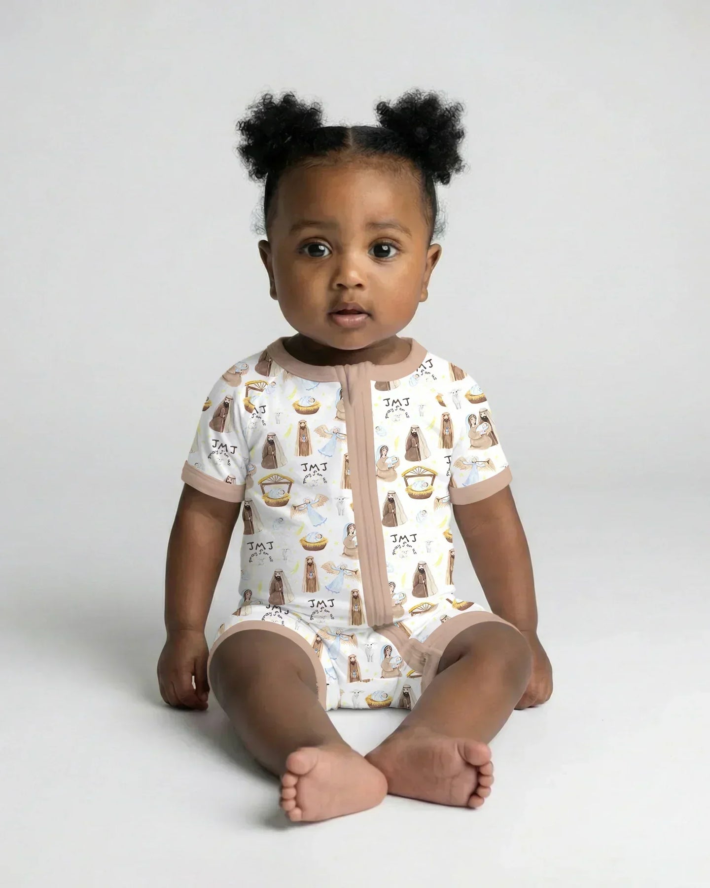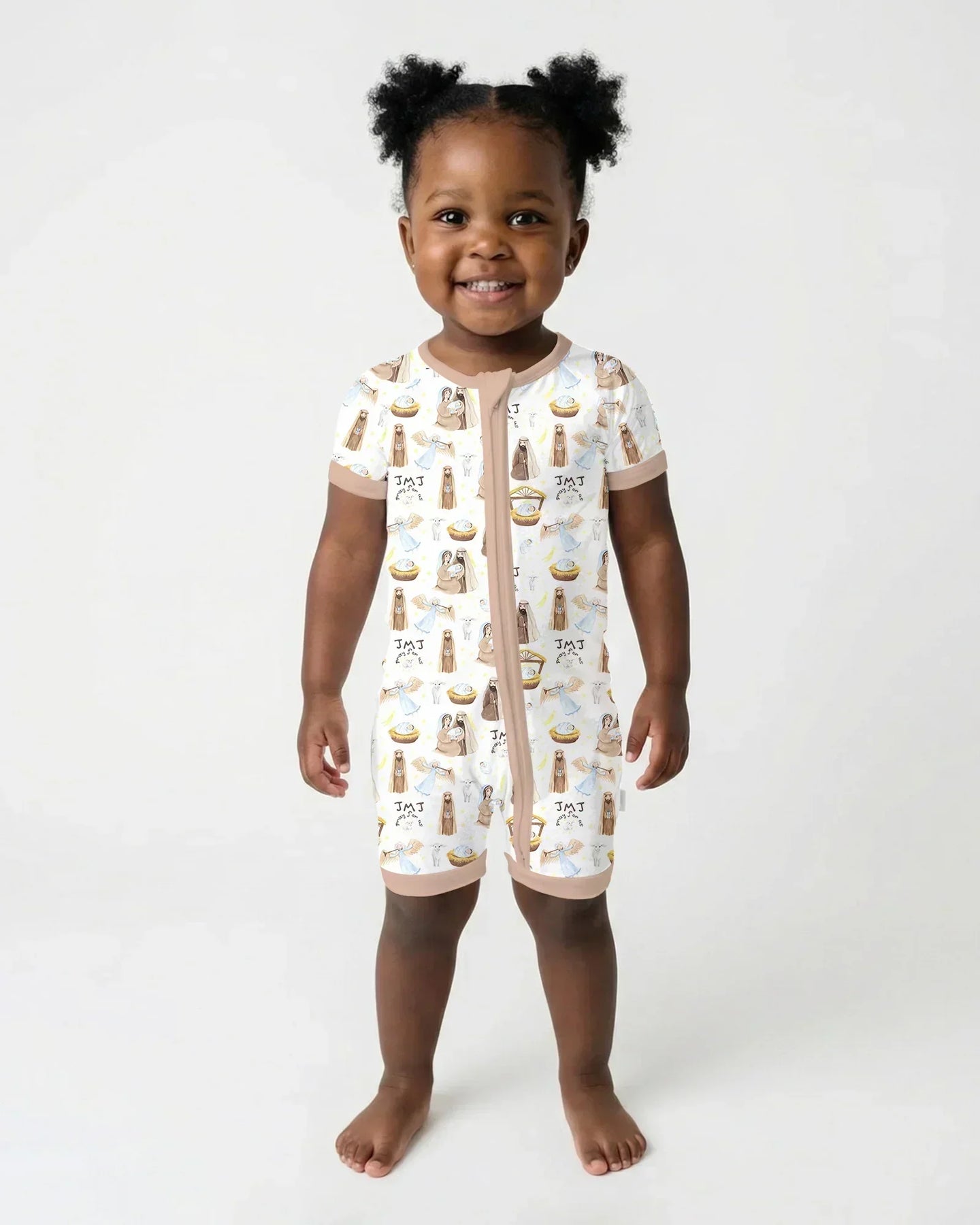 ✨ Holy Family Bamboo Zippies & PJ Sets bring the beauty of the Nativity to your little one’s everyday comfort. This gentle, faith-filled pattern features sweet illustrations of the Holy Family—Mary, Joseph, and Baby Jesus—alongside angels, lambs, and soft golden stars that celebrate the sacred story of Christ’s birth.