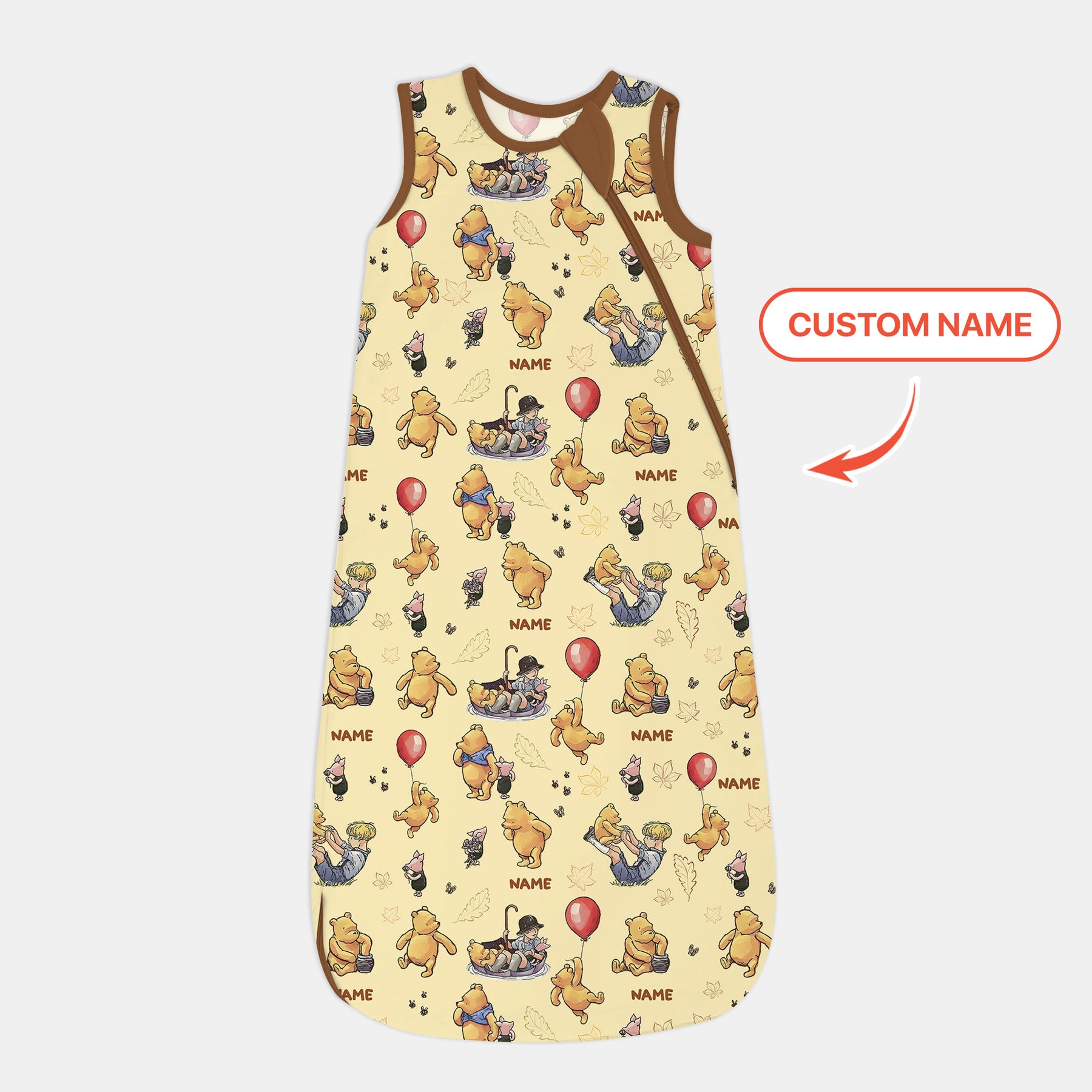 A soft yellow romper featuring an all-over illustration of a cute bear and friends in playful autumn scenes, with balloons, leaves, and storybook details. Personalized with your child’s name for an extra sweet, custom touch.
