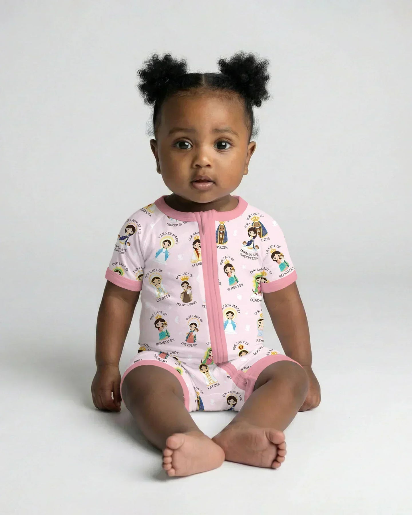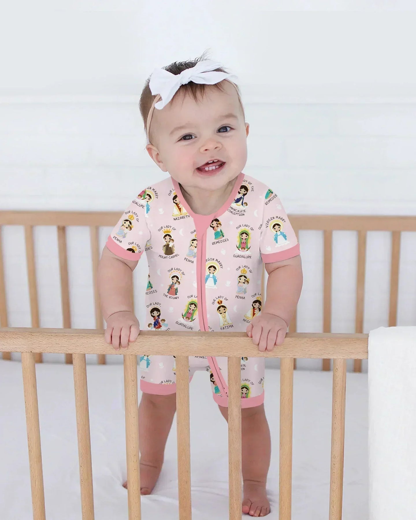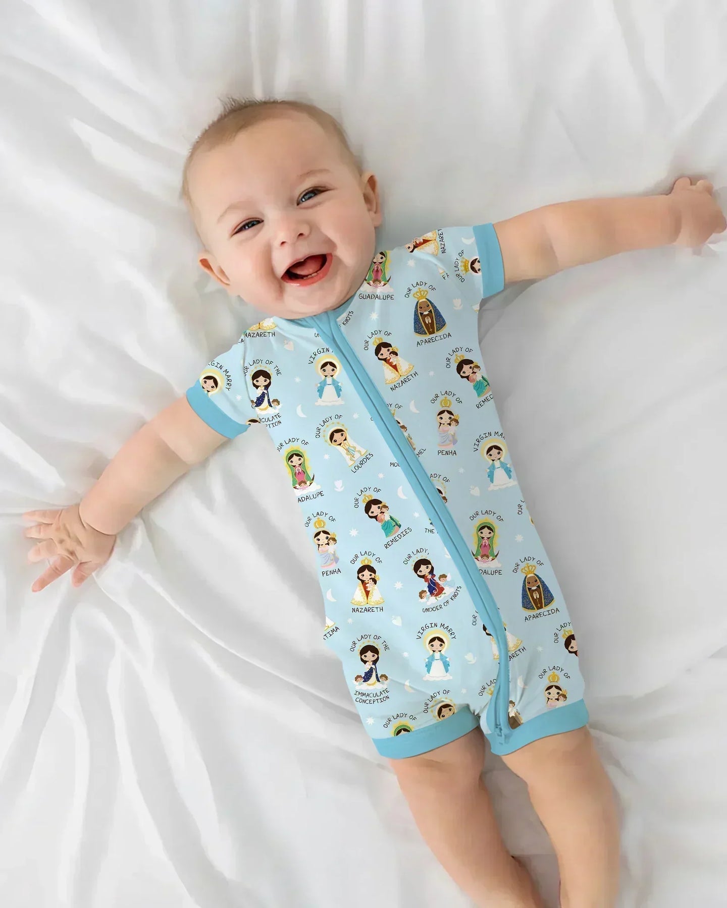 š Little Marian Blessings Bamboo Zippies & PJ Sets wrap your little one in comfort and faith. This sweet pattern features charming illustrations of beloved Marian titlesāsuch as Our Lady of Guadalupe, Fatima, Lourdes, and moreāsurrounded by gentle stars, moons, and hearts in a soft, peaceful palette.