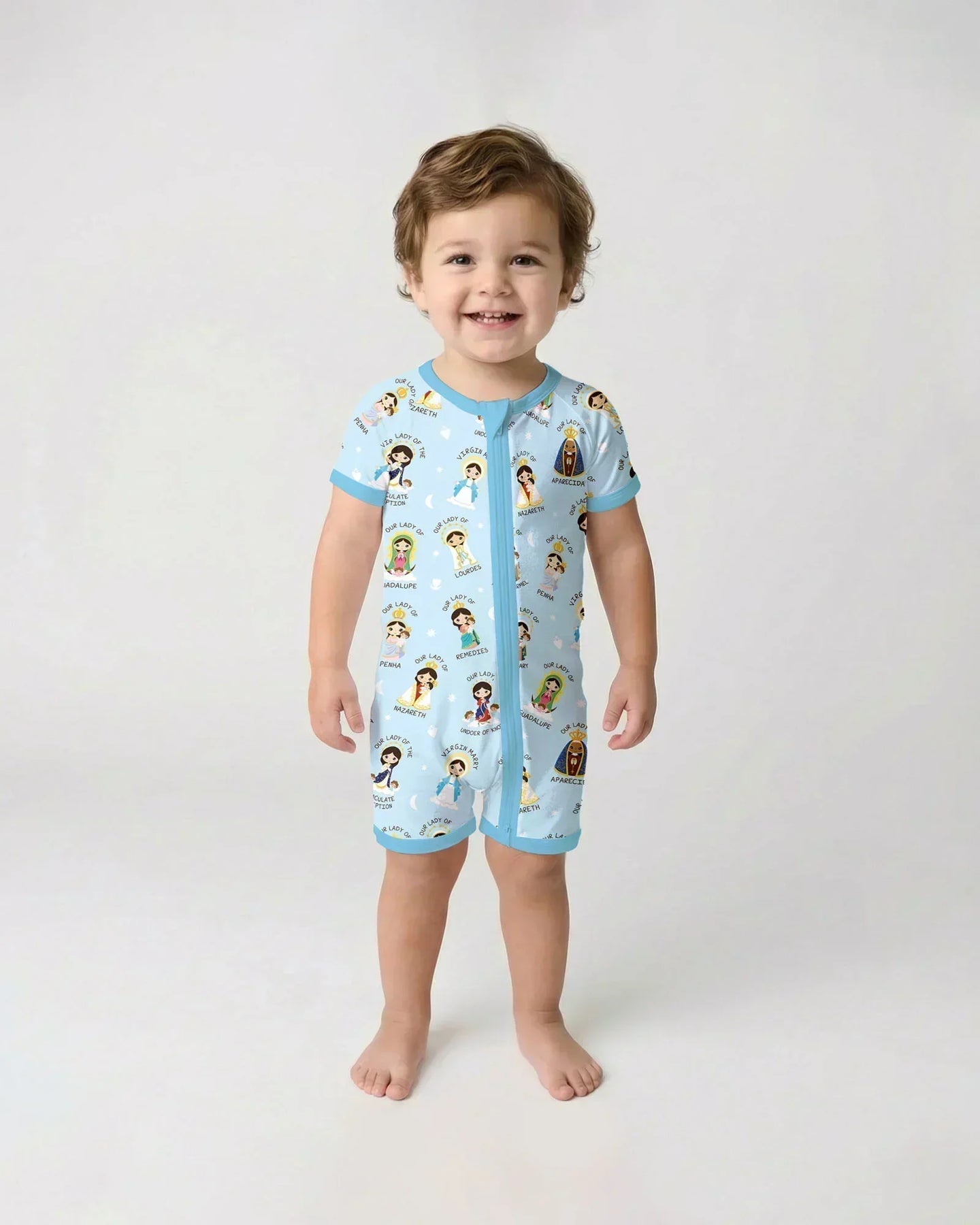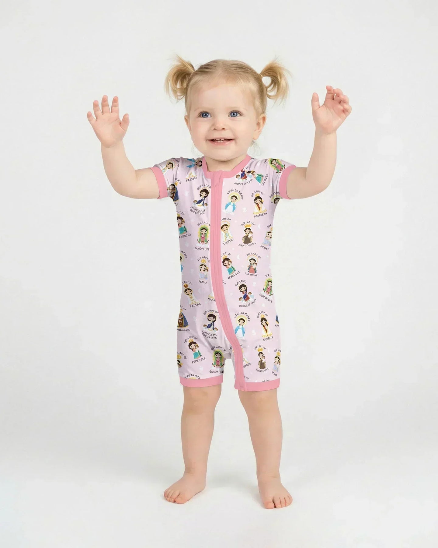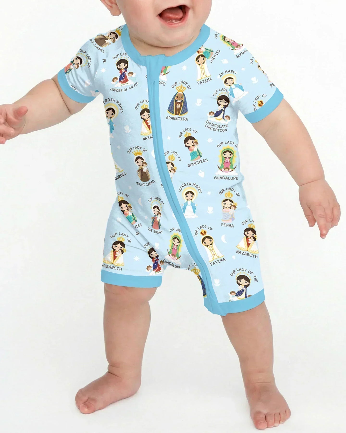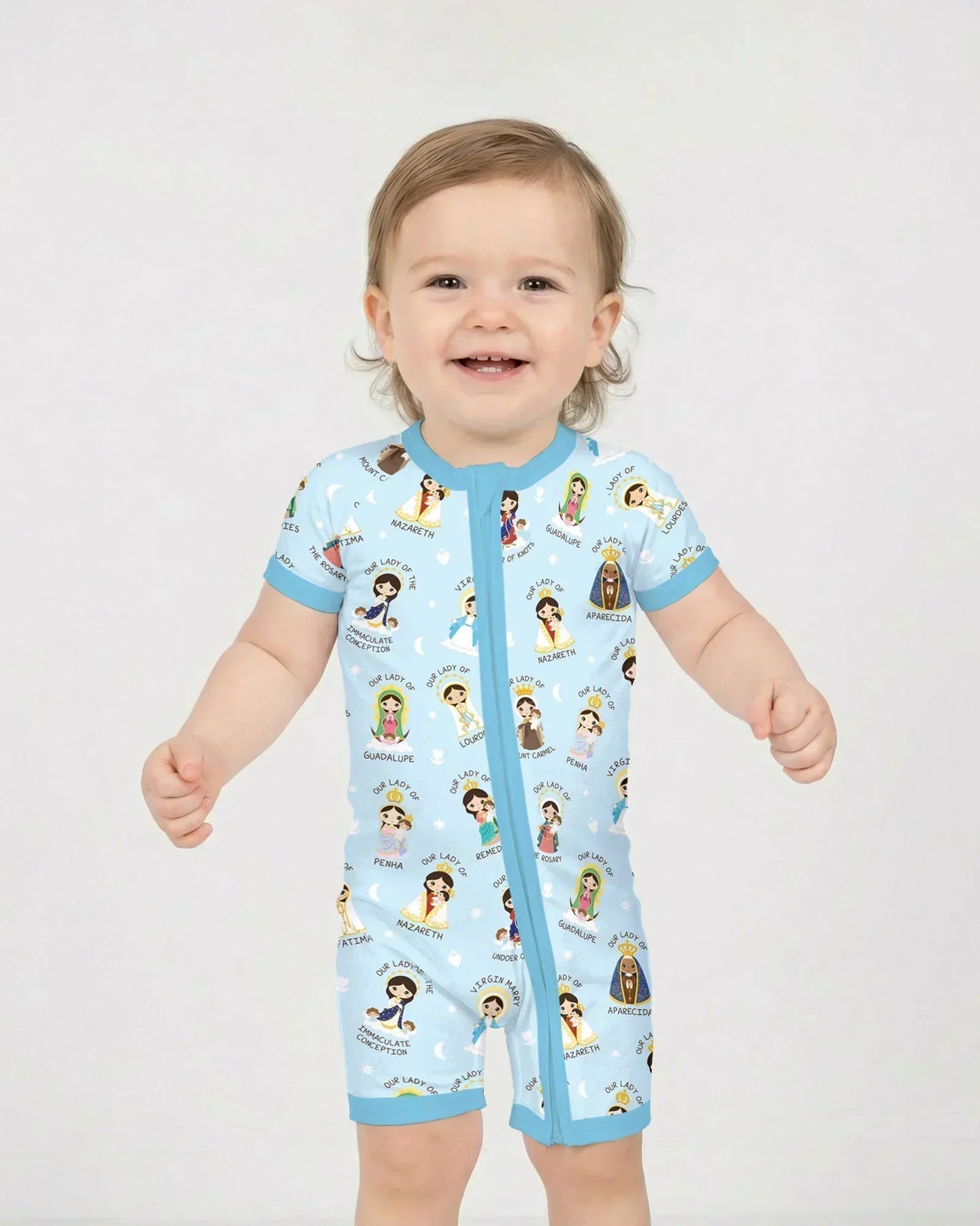 š Little Marian Blessings Bamboo Zippies & PJ Sets wrap your little one in comfort and faith. This sweet pattern features charming illustrations of beloved Marian titlesāsuch as Our Lady of Guadalupe, Fatima, Lourdes, and moreāsurrounded by gentle stars, moons, and hearts in a soft, peaceful palette.