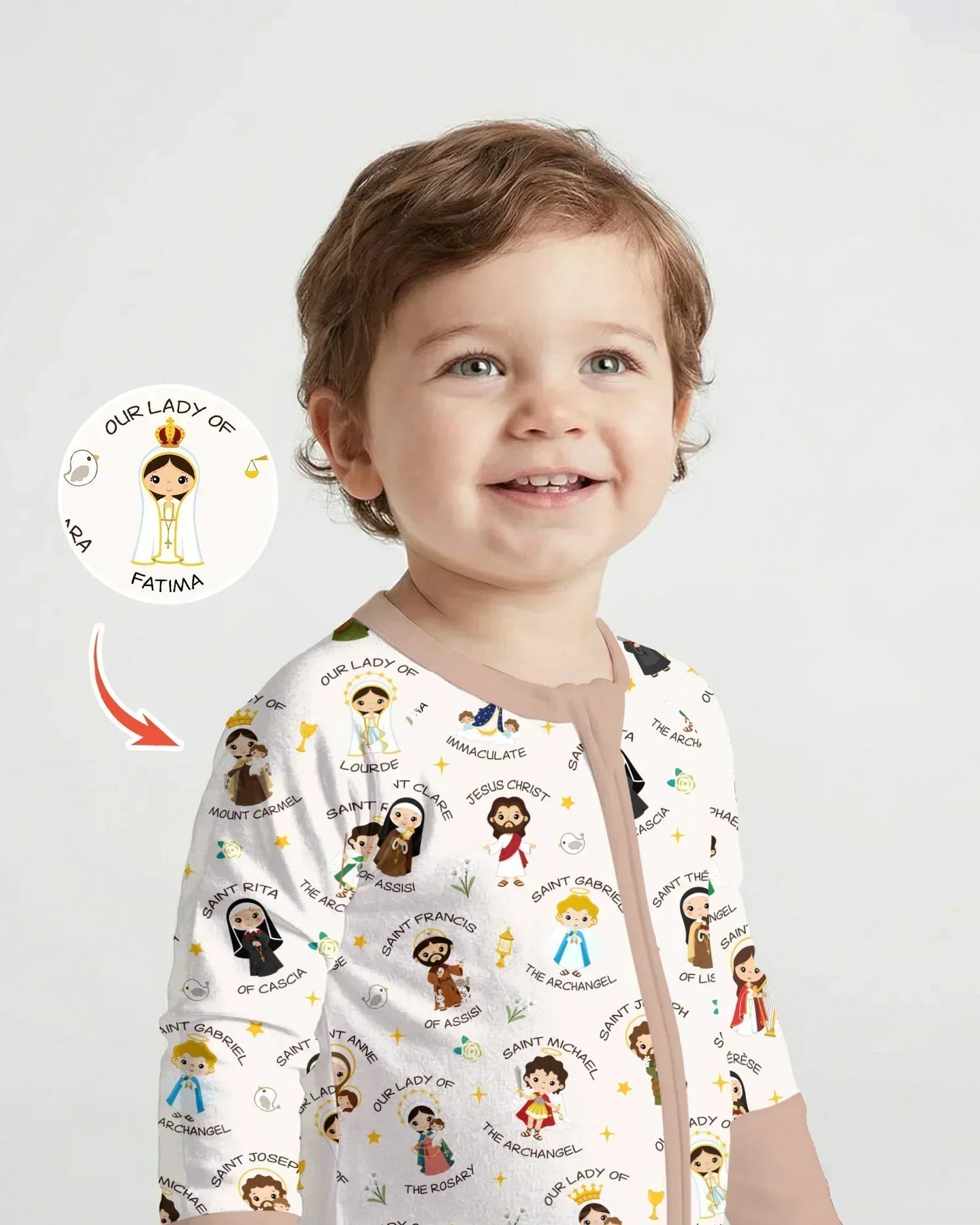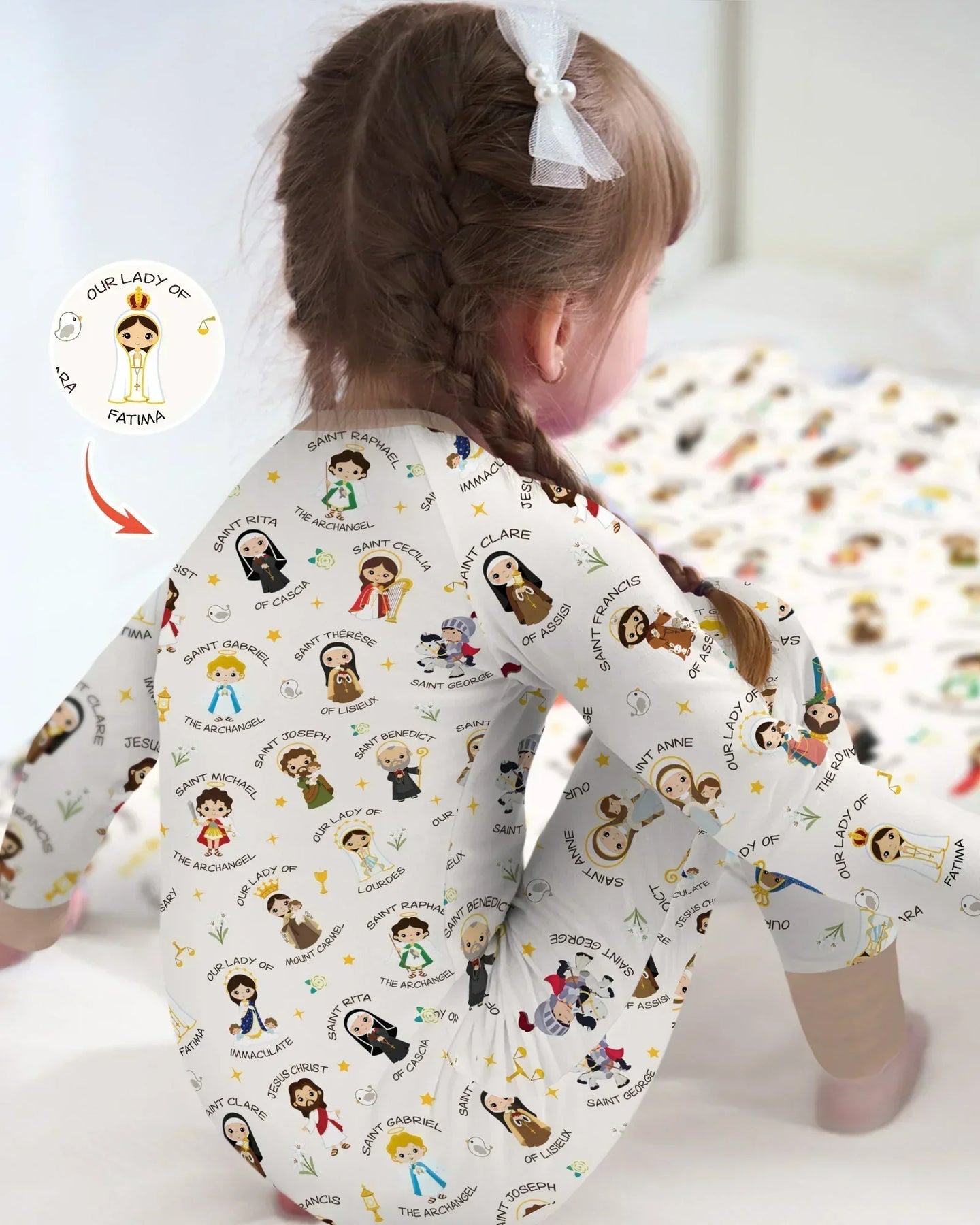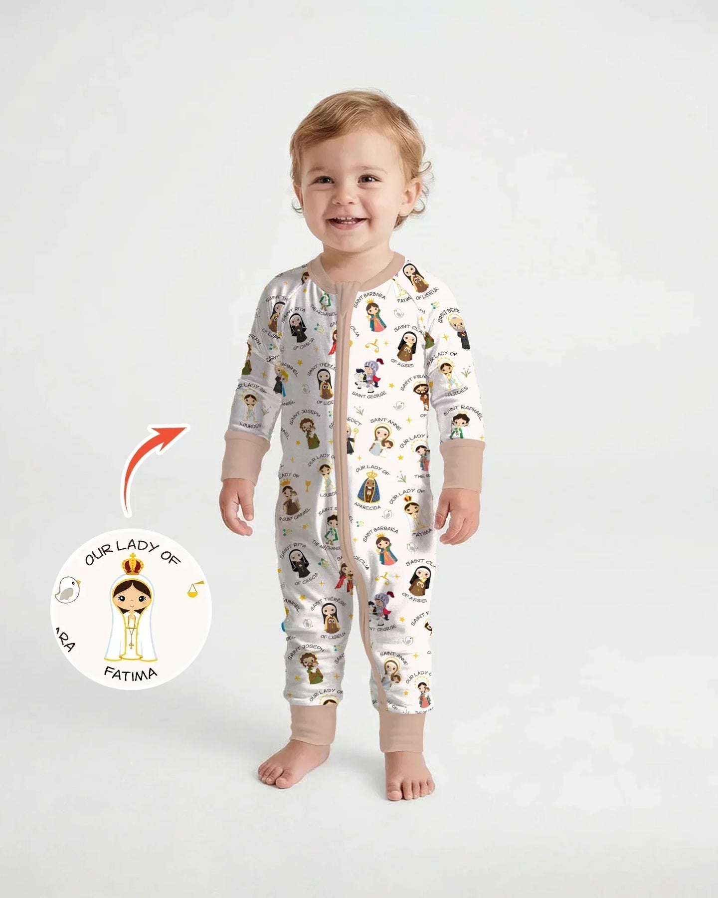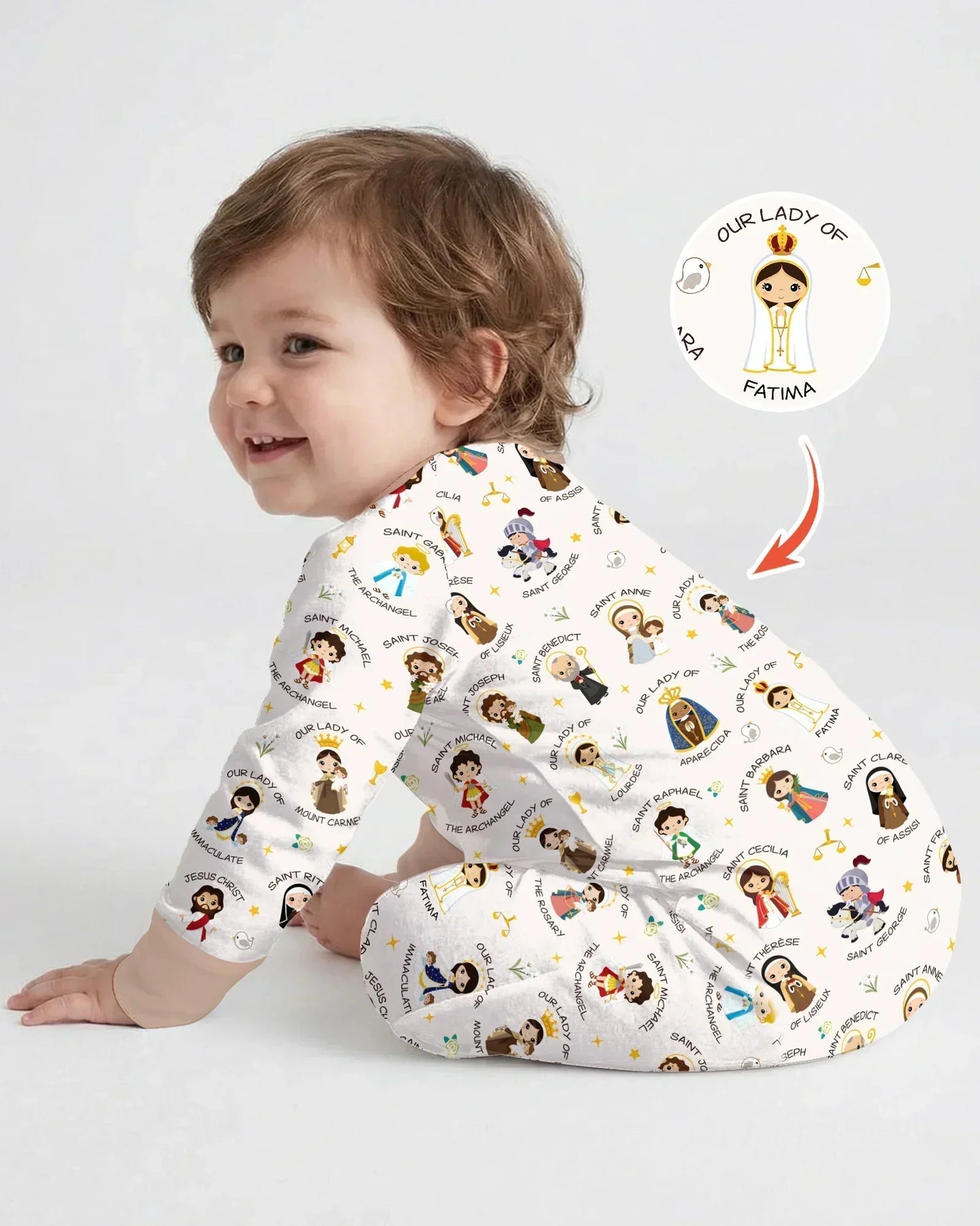 Surround your whole family with the intercession of the saints with our Pray For Us Collection! Featuring Our Lady of Fatima, Our Lady of Lourdes, St. Francis of Assisi, St. Michael the Archangel, St. Joseph, St. Thérèse of Lisieux, and so many more — this beautifully illustrated design wraps your little ones in the Communion of Saints from head to toe.