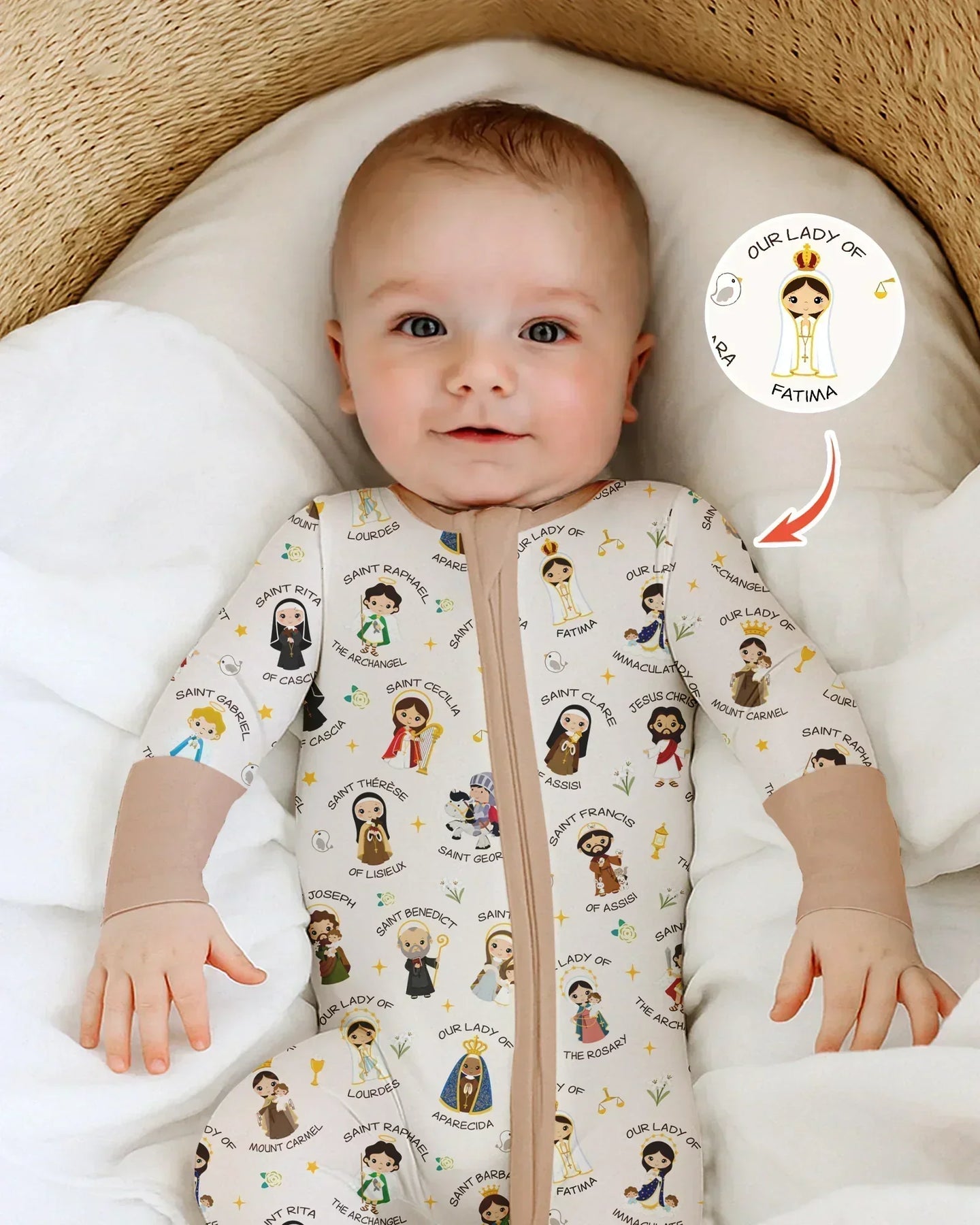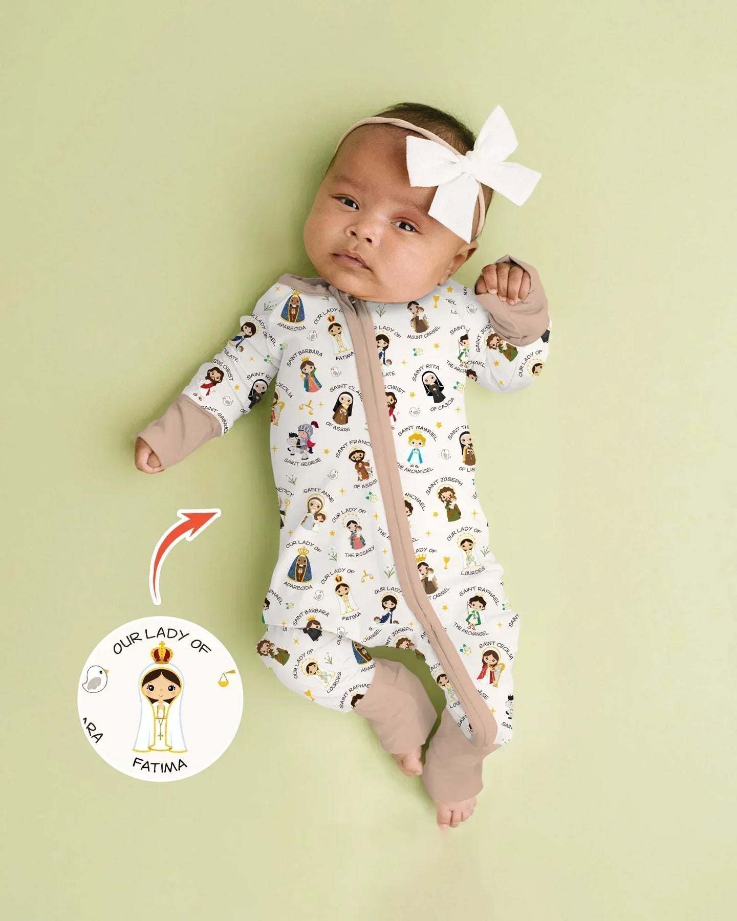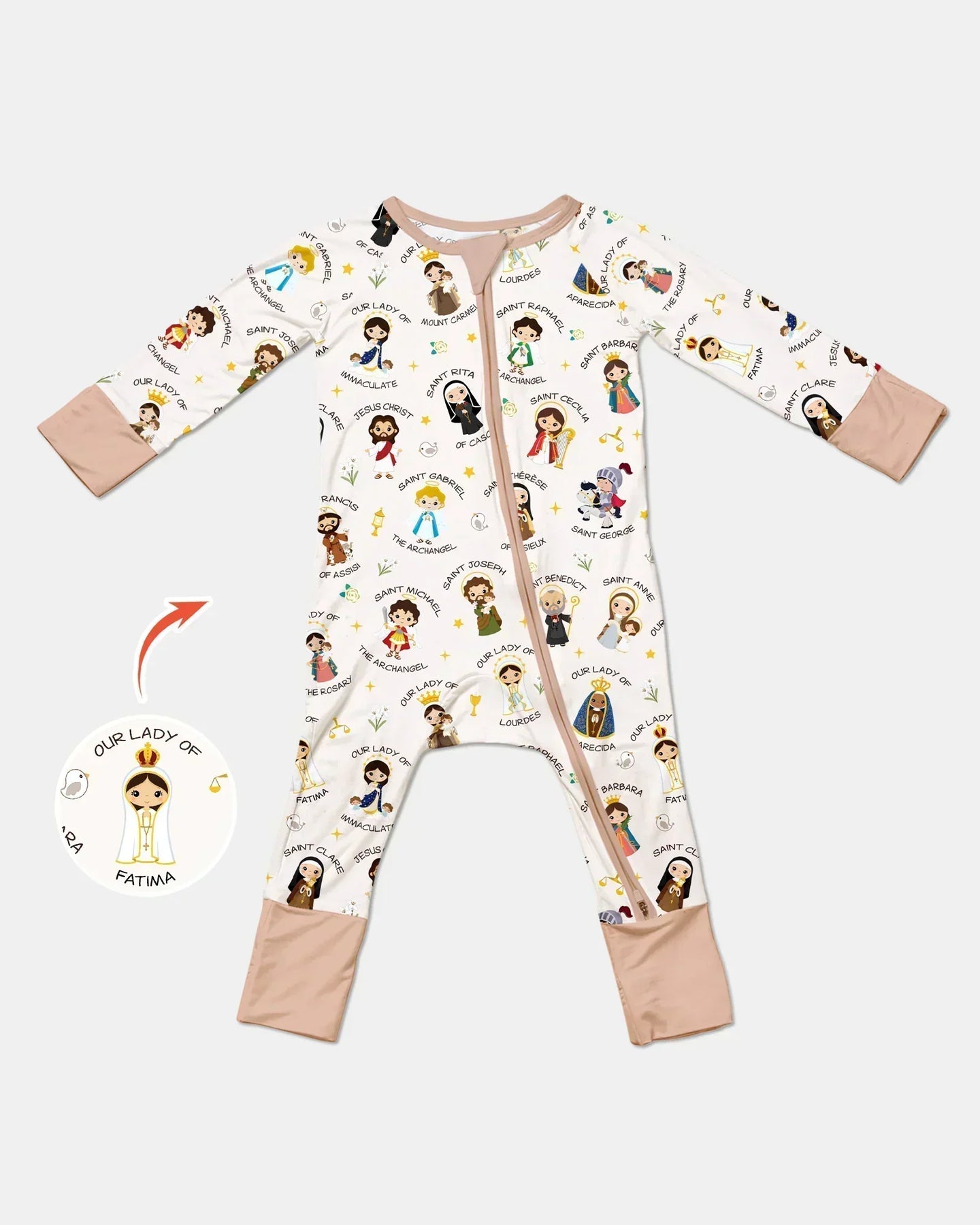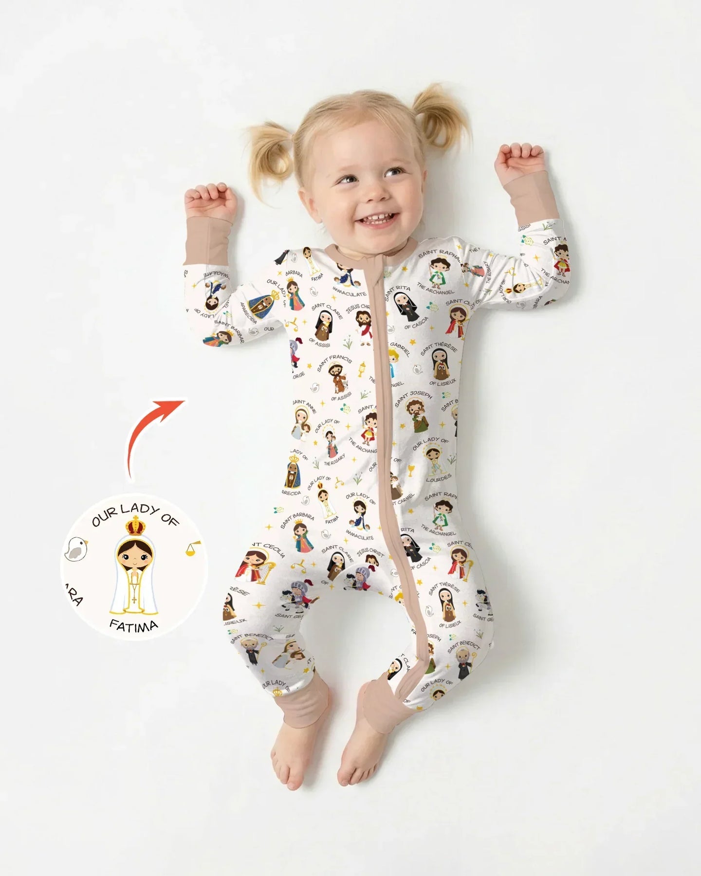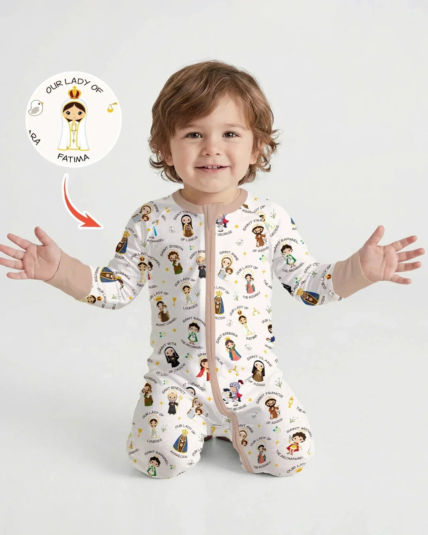 Surround your whole family with the intercession of the saints with our Pray For Us Collection! Featuring Our Lady of Fatima, Our Lady of Lourdes, St. Francis of Assisi, St. Michael the Archangel, St. Joseph, St. Thérèse of Lisieux, and so many more — this beautifully illustrated design wraps your little ones in the Communion of Saints from head to toe.