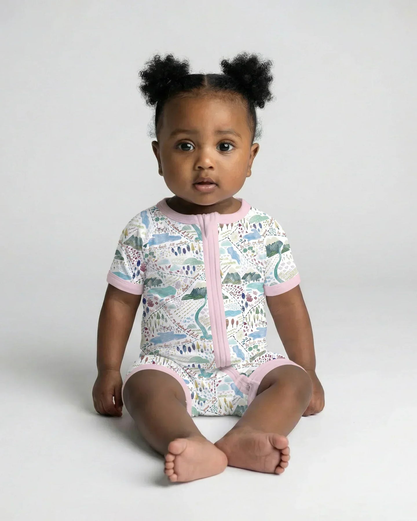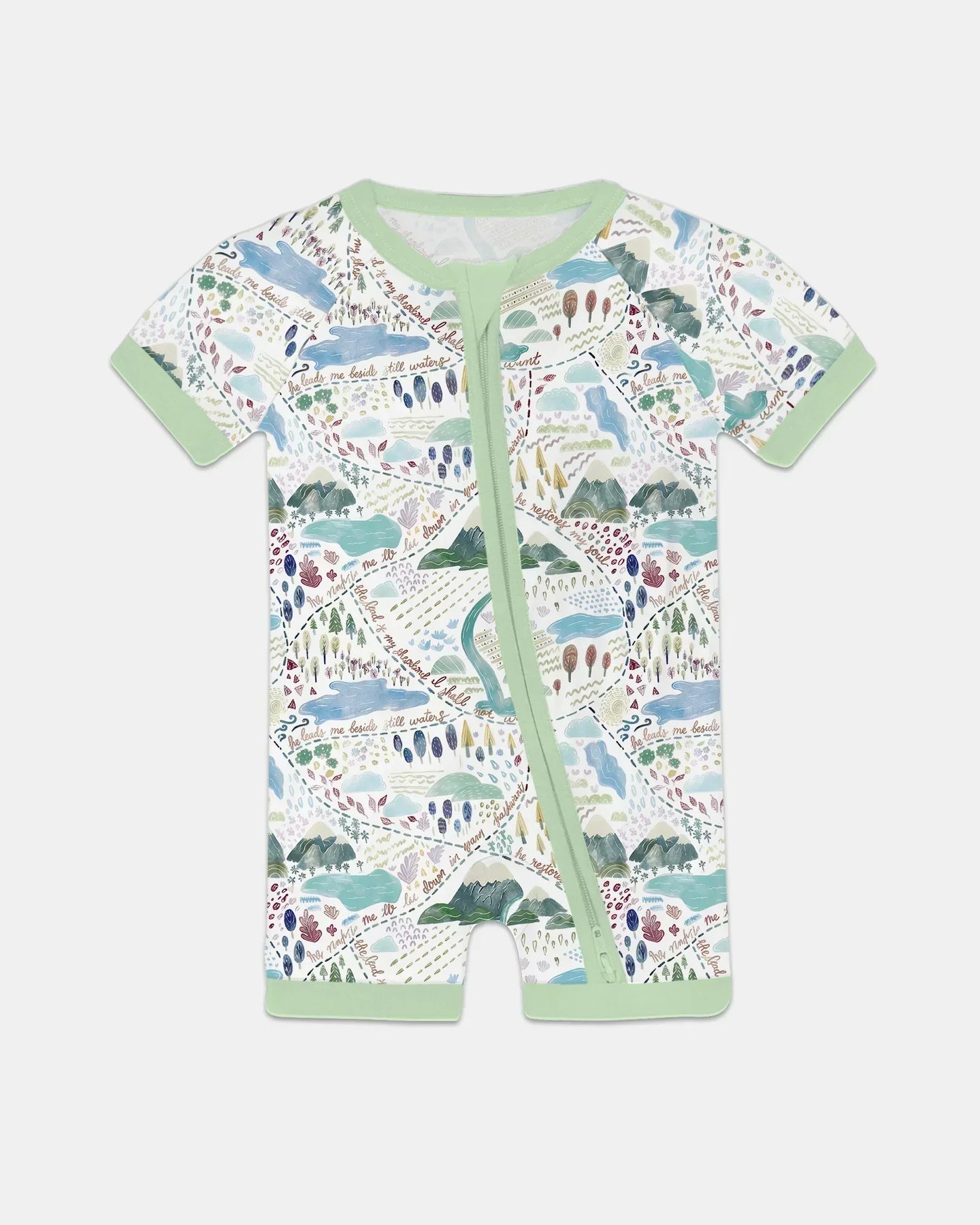 🗺️ Whimsical Psalms 23 Map Bamboo Zippies & PJMS bring the comforting words of Psalm 23 to life in a playful, hand-drawn map pattern. Featuring mountains, streams, and cozy landscapes, this design guides little ones through “He restores my soul” in a fun, visual way.