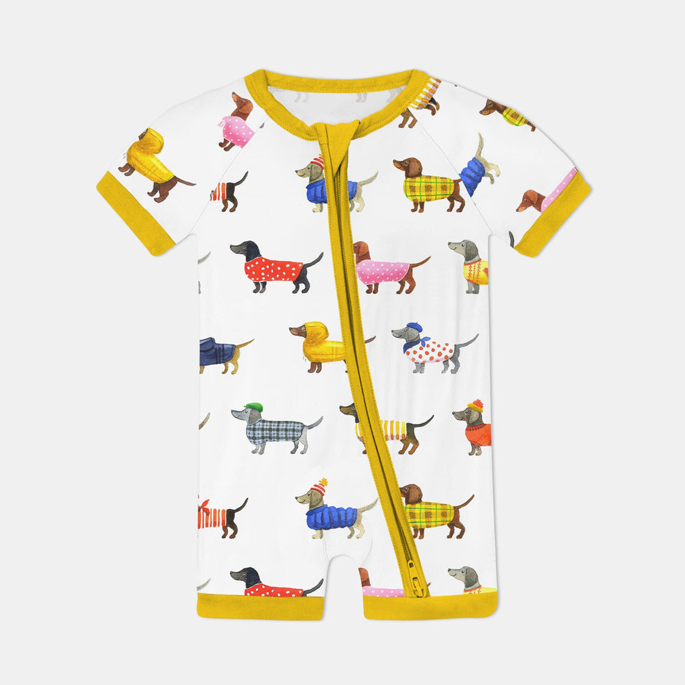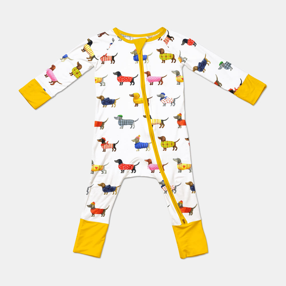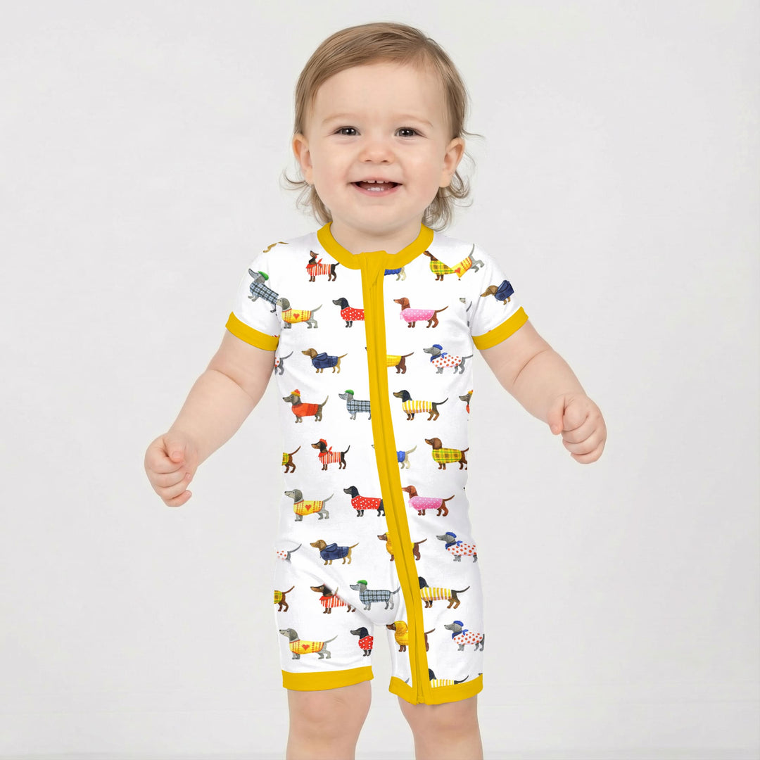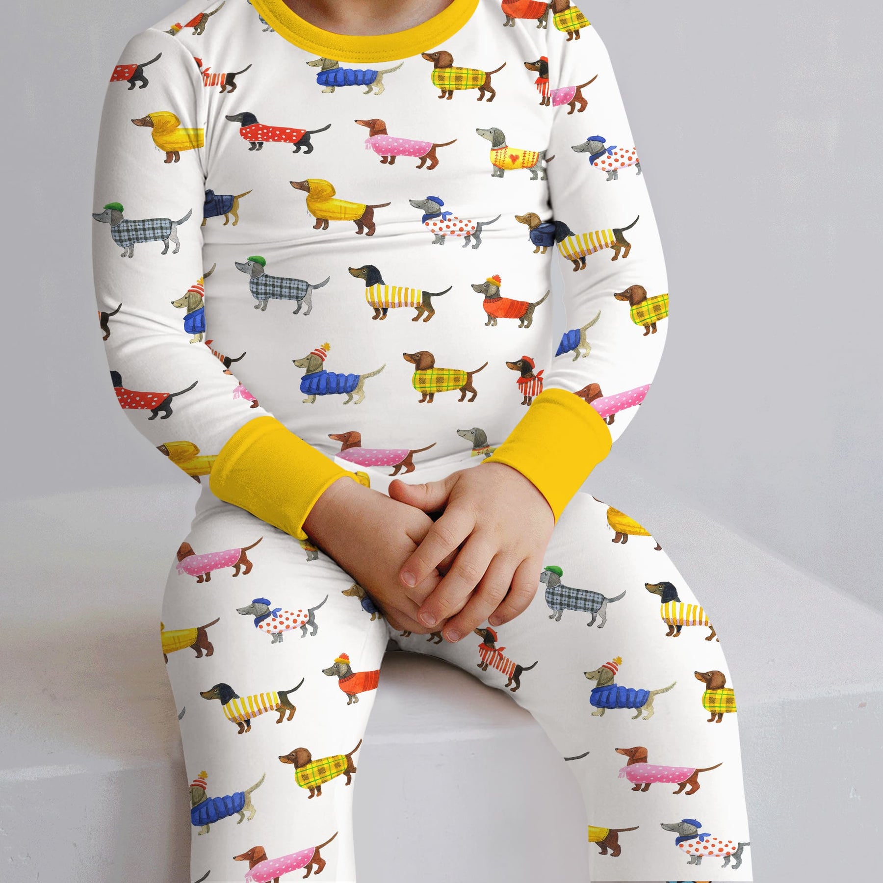 Bring colorful dachshunds, each wearing a differently patterned outfit, arranged in a playful repeating pattern into your pajamas. Made from bamboo viscose, the fabric is soft, breathable, and gentle on sensitive skin. The seasonless material keeps your child cozy in winter and cool in summer. Designed without snaps, buttons, or interior tags, it ensures a comfortable and hassle-free fit for adventure-filled days and cozy evenings.