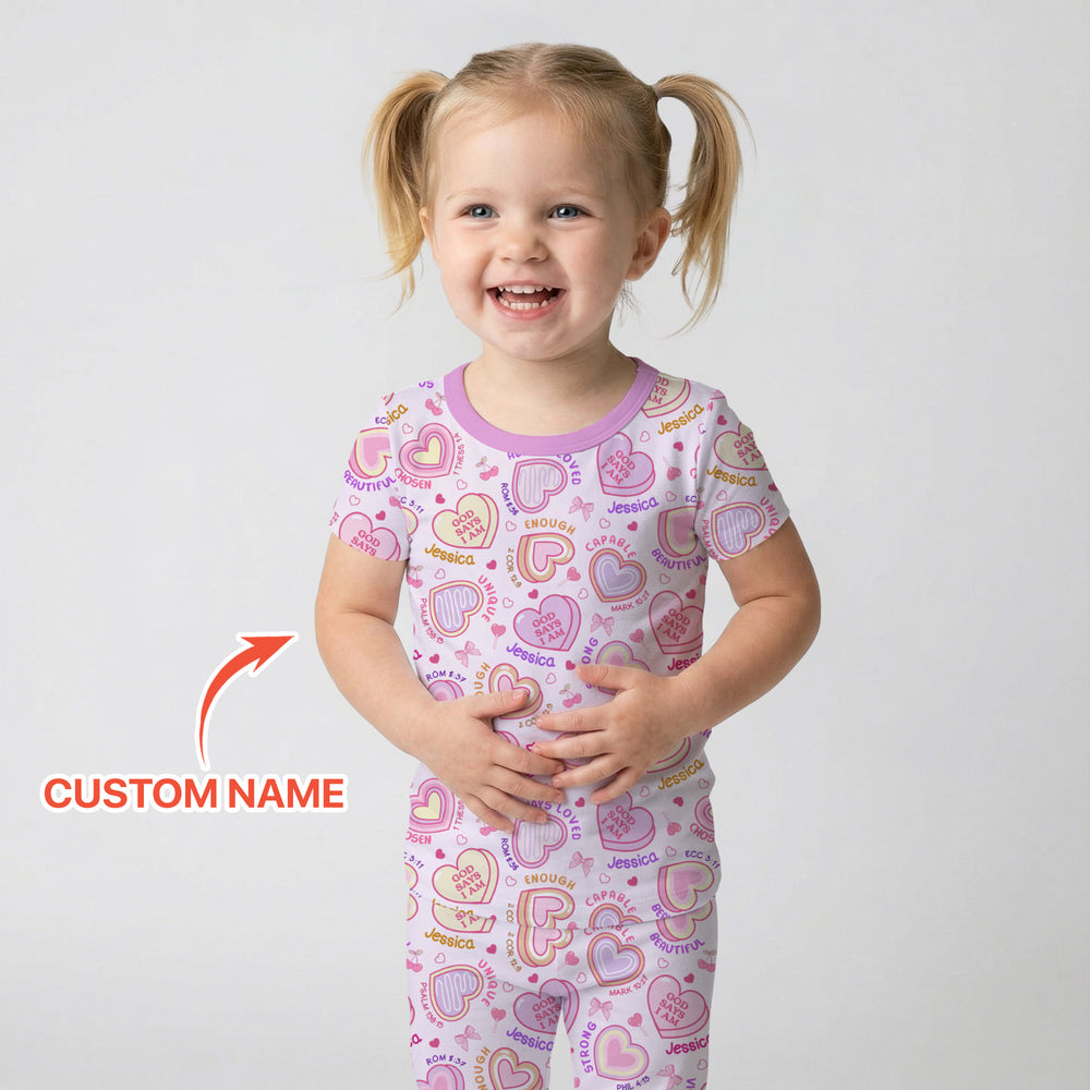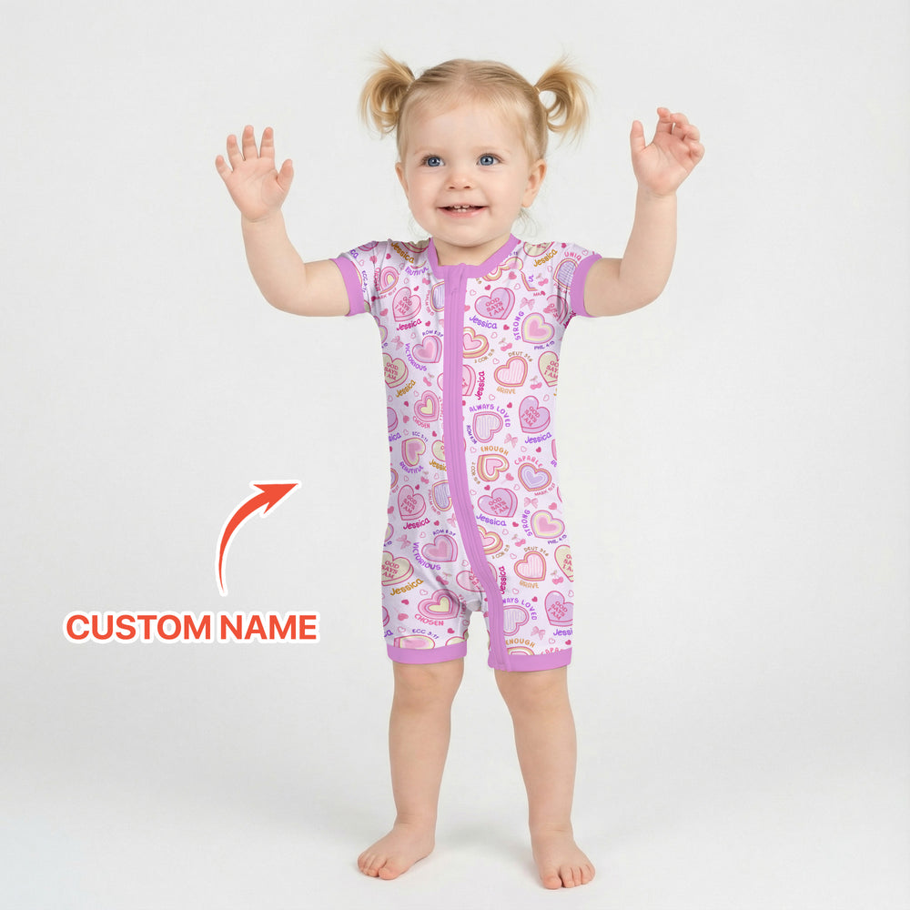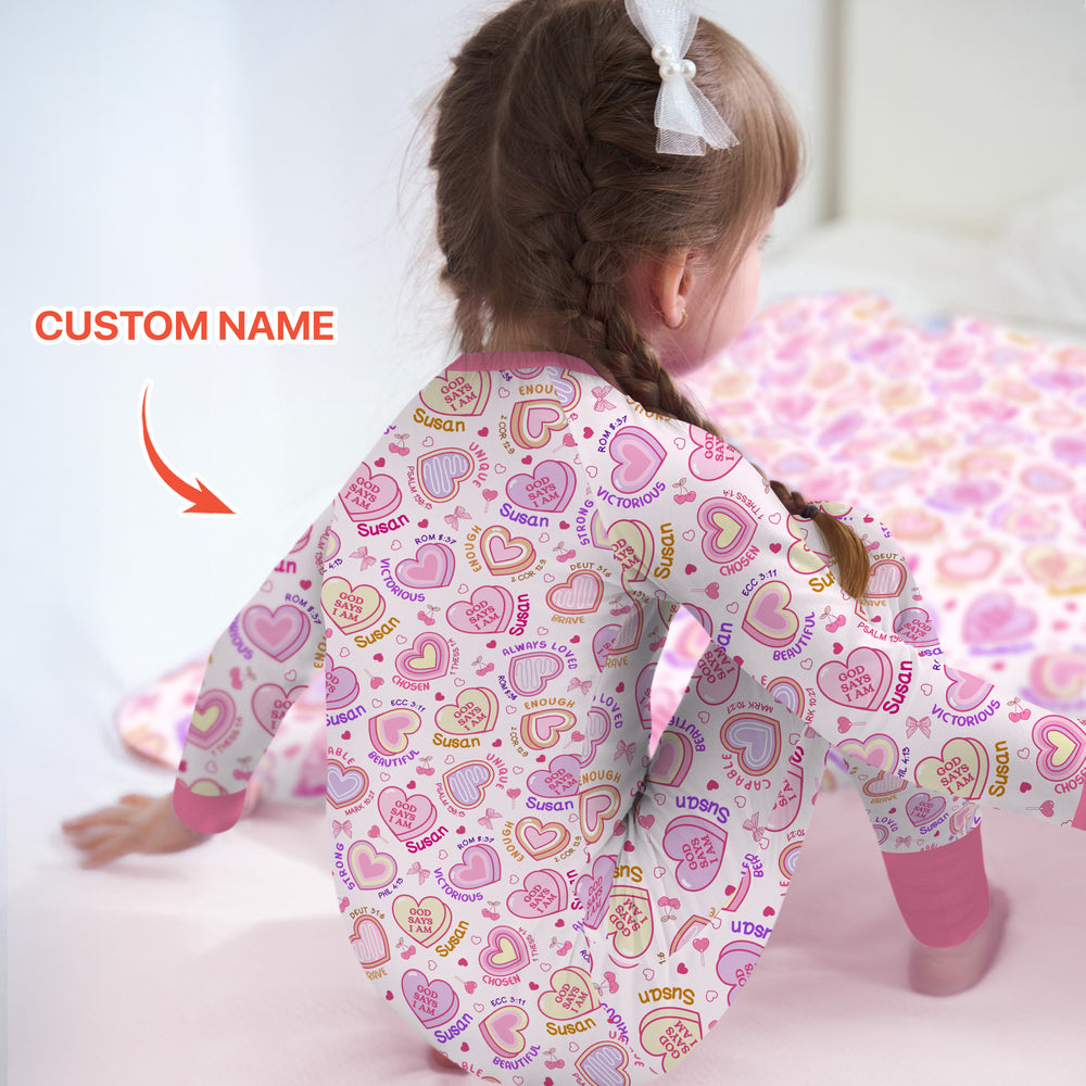 Soft pink tones, playful heart motifs, and your custom name make this set extra meaningful—perfect for bedtime cuddles, Valentine’s season, Mother’s Day, or everyday moments of connection.