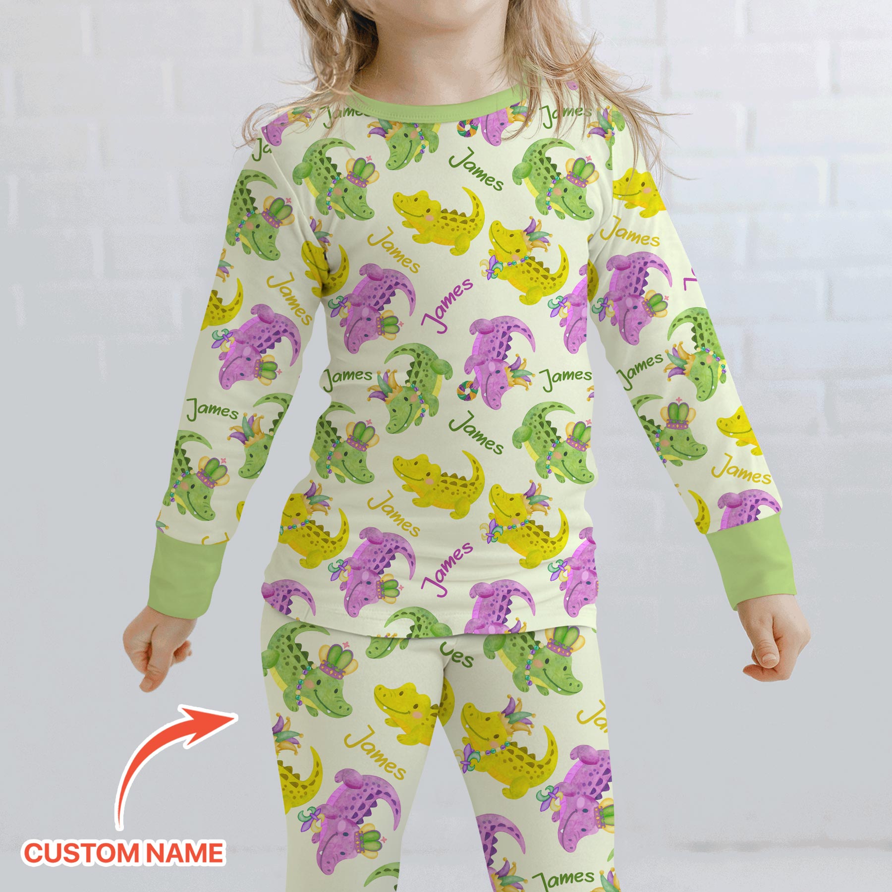 Custom Name Mardi Gras Alligator Two Piece Long Sleeve Pajama Set