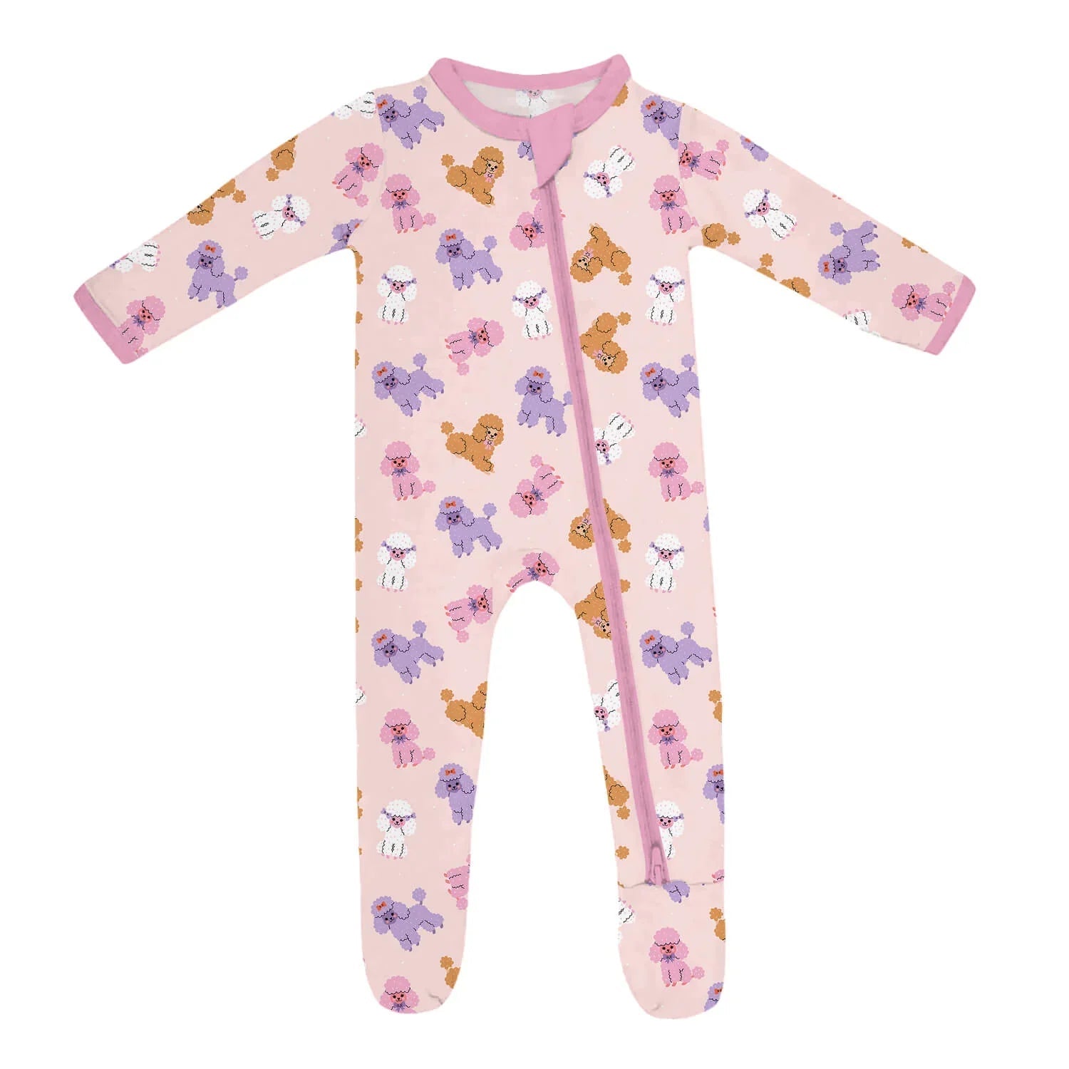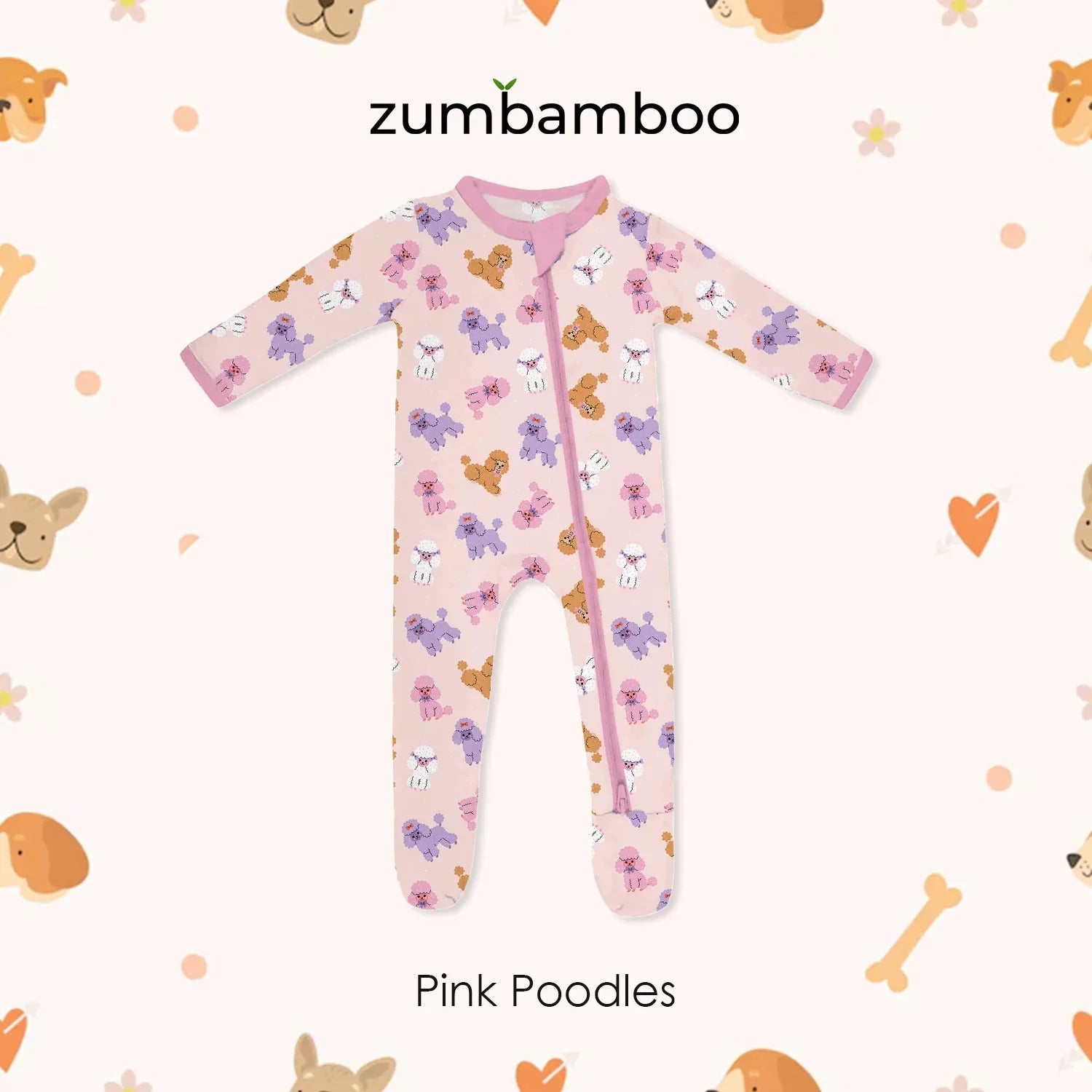 This romper, made from soft, breathable Bamboo, features a charming pink poodles design. The dual zipper and fold-over cuffs make diaper changes effortless, while the fabric’s softness ensures your baby’s comfort.
