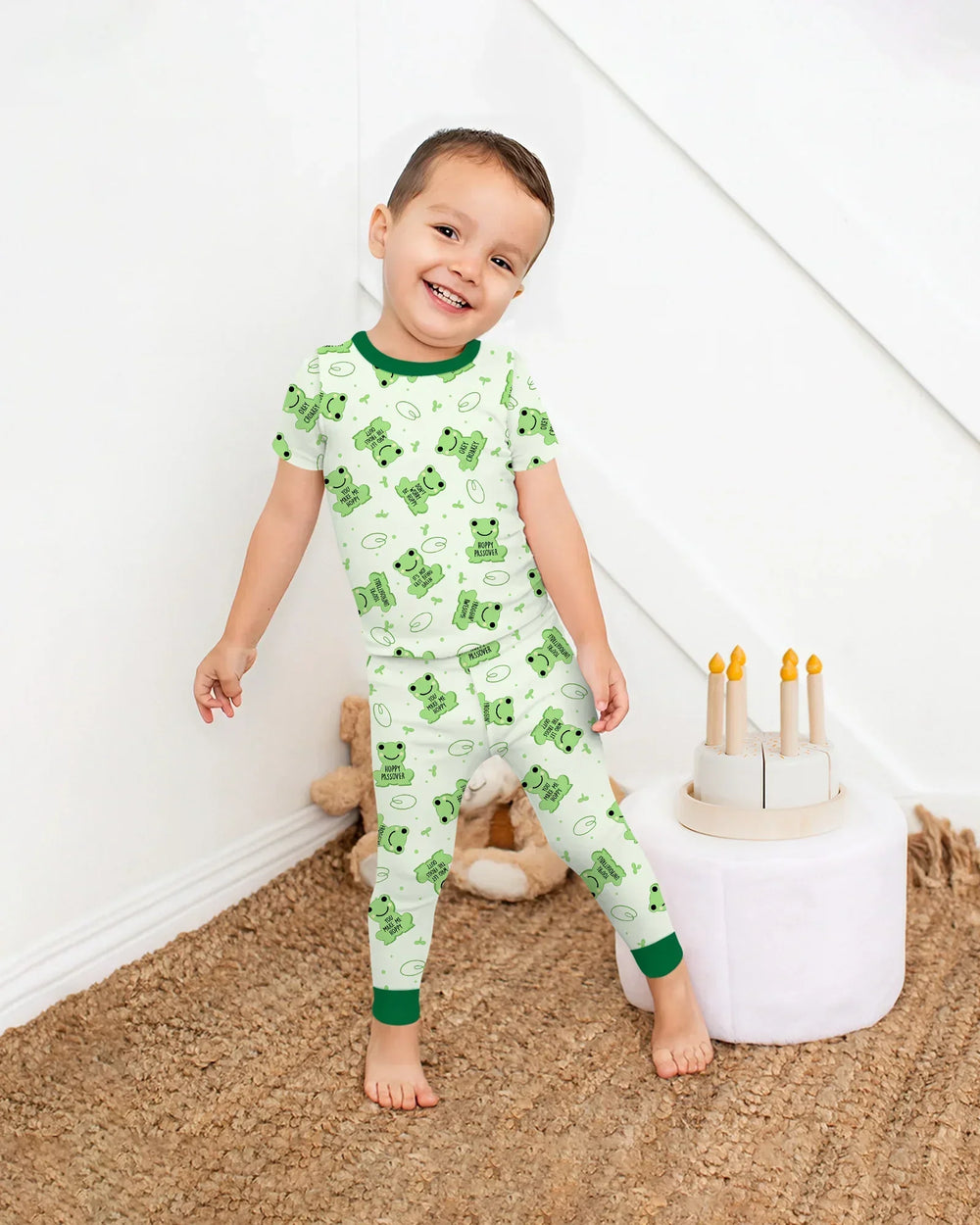 Bring extra joy to seder night with the Marzipan Passover Conversation Frogs, a playful pajama collection inspired by one of the Ten Plagues and kids’ favorite holiday treats. Cute green frogs, fun phrases, and candy-like pastel tones create a whimsical Passover look that keeps little ones excited from the first cup of grape juice to “Chad Gadya.”