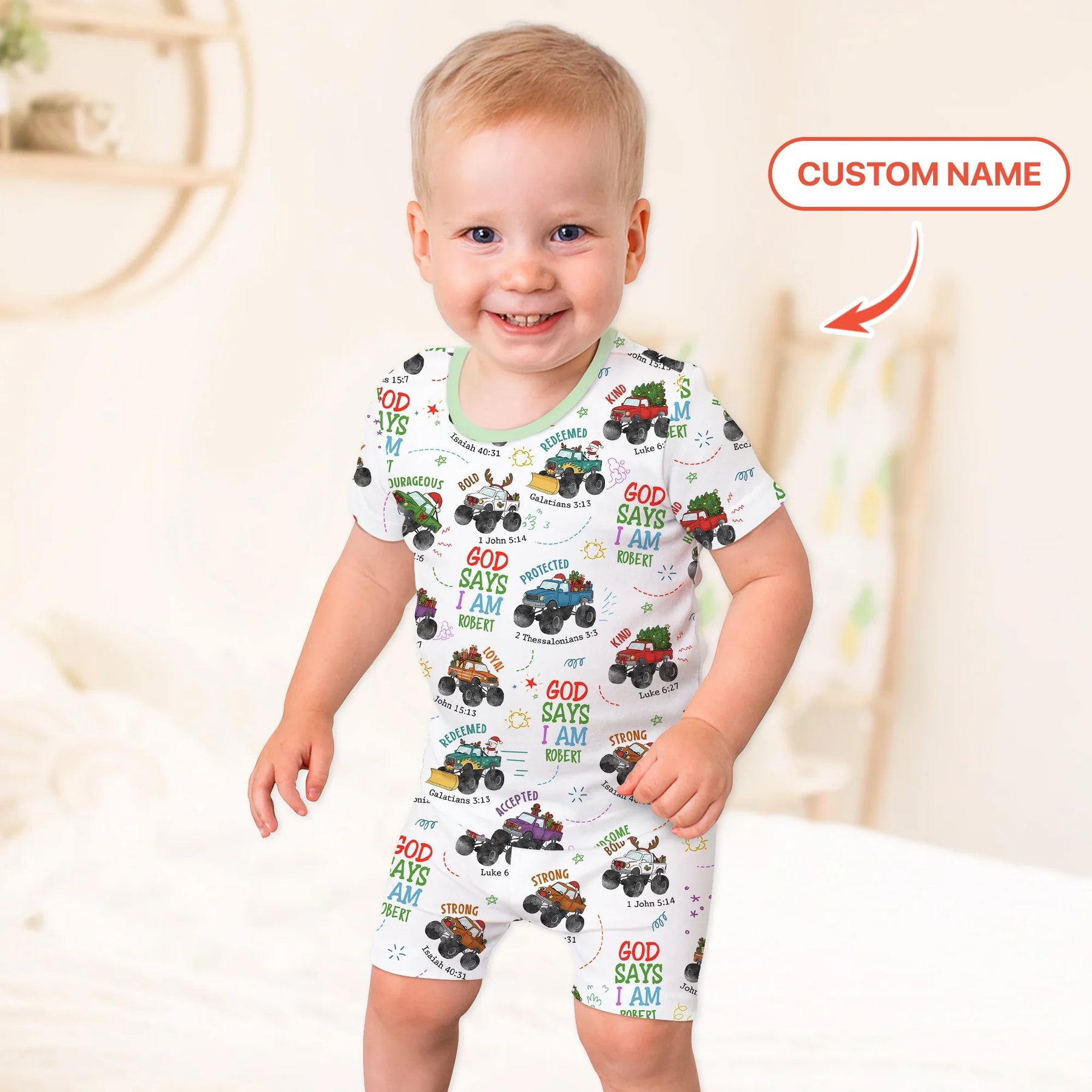 Make your baby’s first Christmas extra special with the Personalized God Says I Am Christmas Monster Truck Collection — where festive fun meets faith-filled comfort!