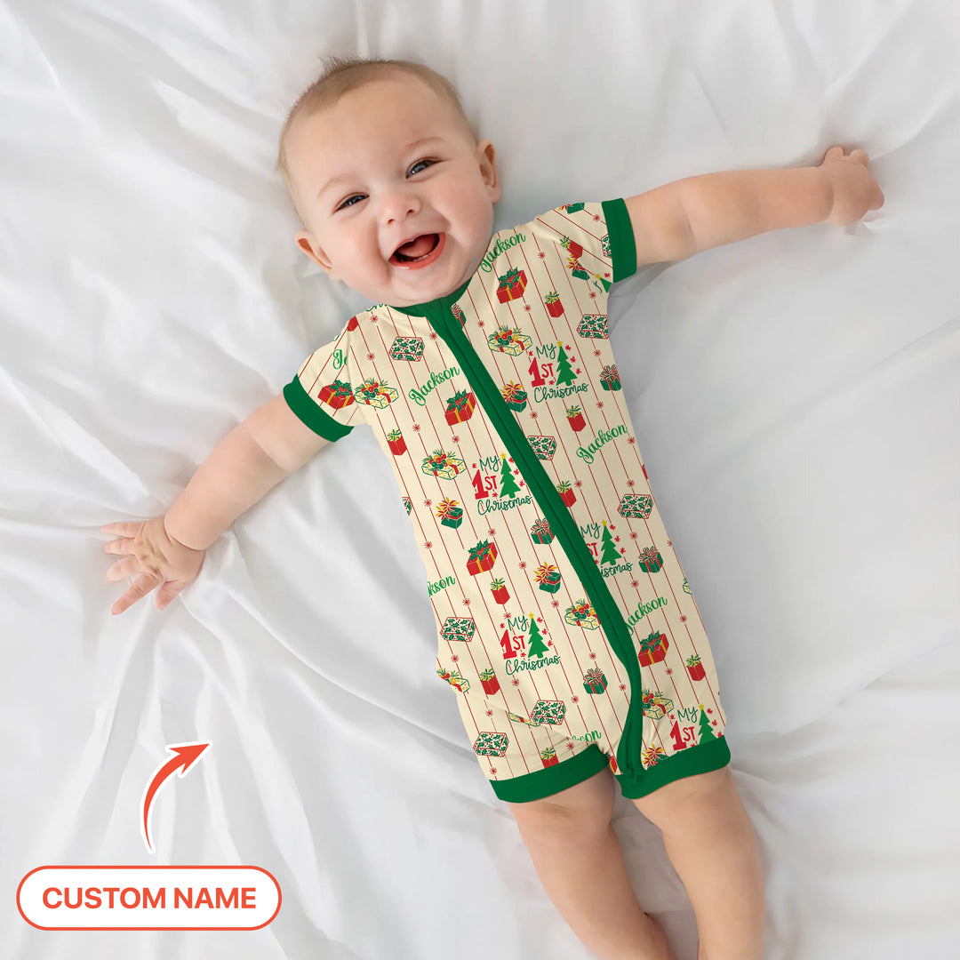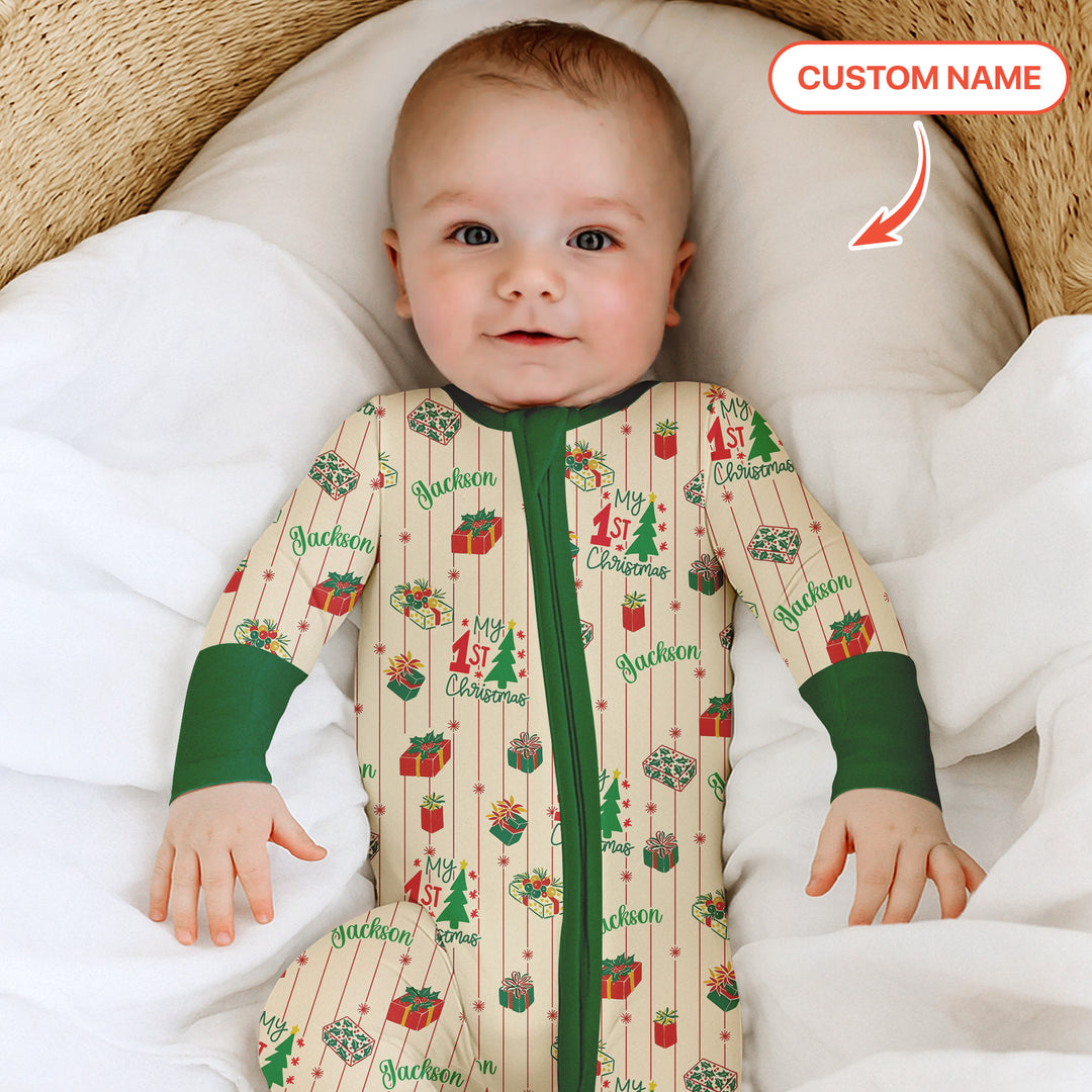 Featuring adorable gift box patterns, festive red-and-green trims, and warm beige tones, each piece brings the joyful spirit of Christmas morning to life. Whether it’s your baby’s very first Christmas or a cozy family tradition, these PJs make every photo and cuddle moment shine brighter.