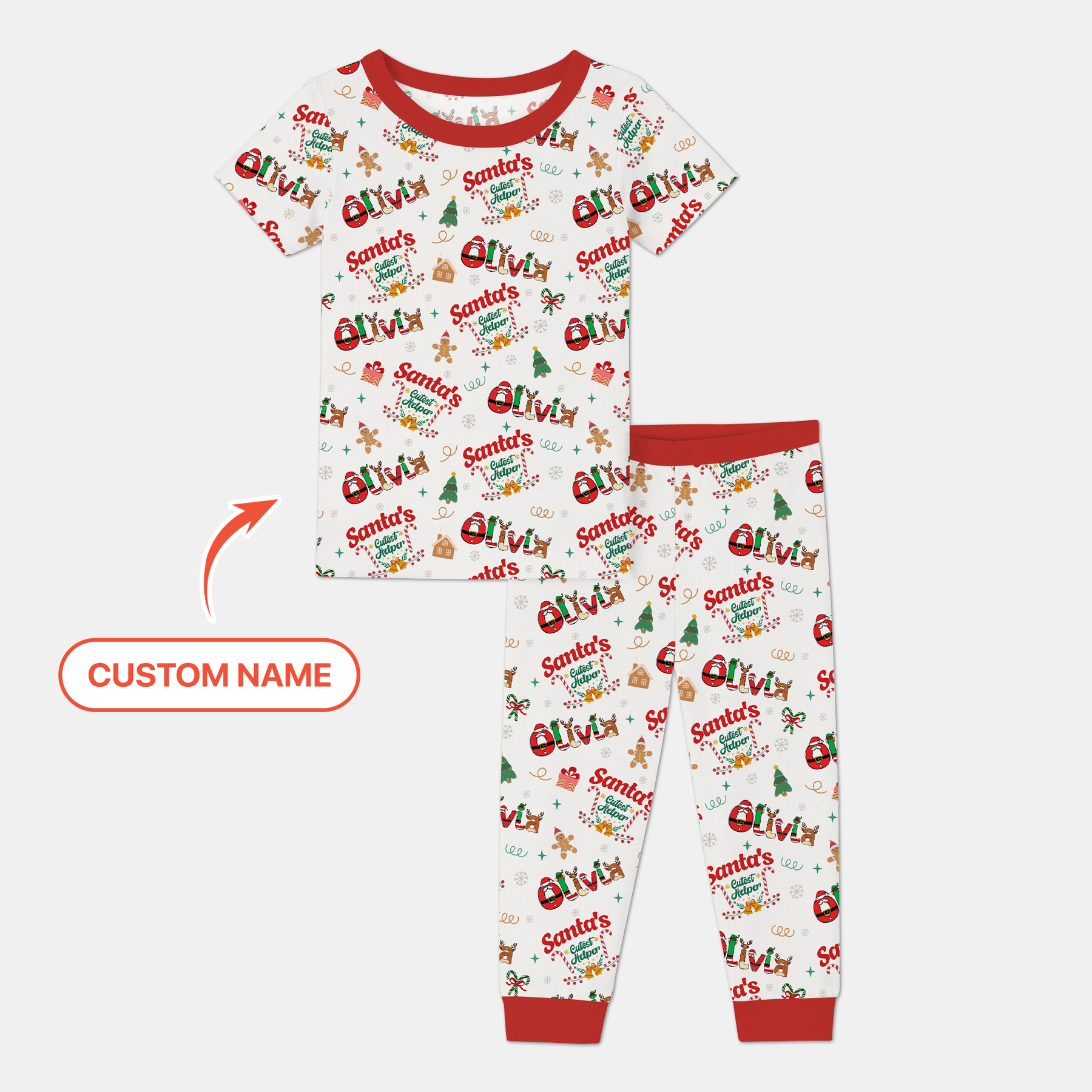 Let your little one join Santa’s crew in the most adorable way with our *Santa’s Little Helper Custom Name* Collection! Designed to capture the pure joy and excitement of Christmas Eve, these pajamas are sprinkled with festive icons — gingerbread cookies, candy canes, Christmas trees, and playful elves — all coming together in a cheerful holiday pattern.