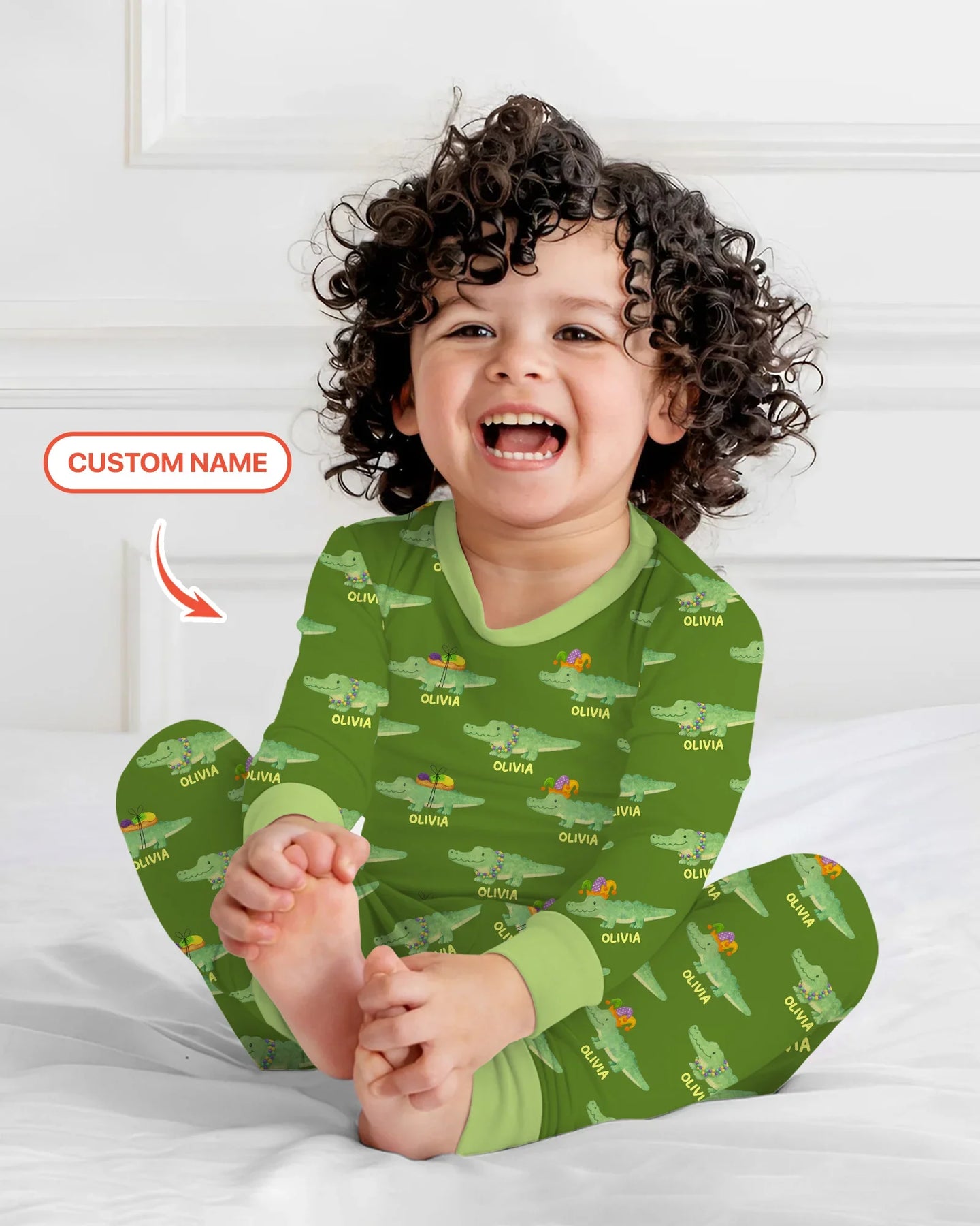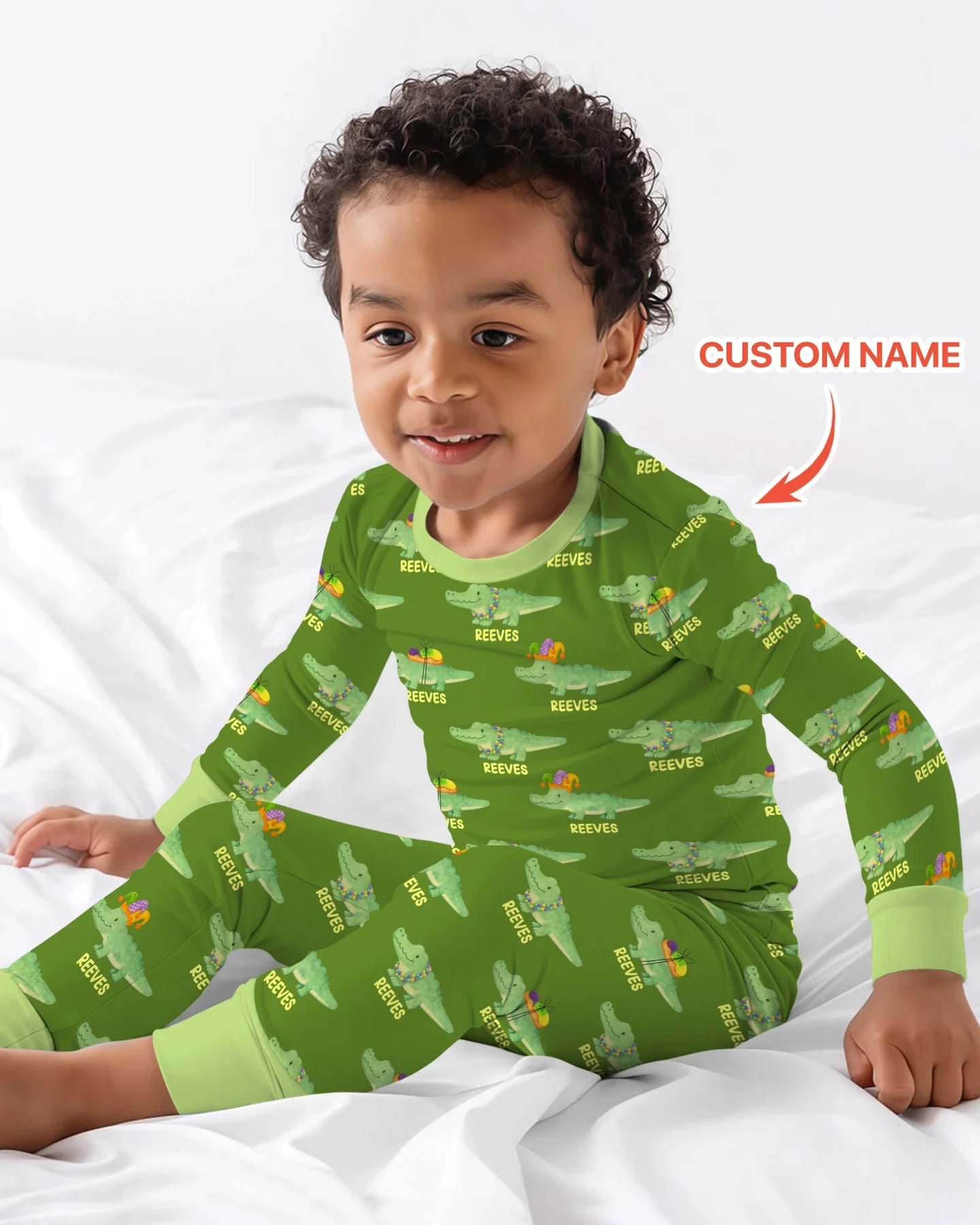 A playful Mardi Gras Gator collection featuring festive colors and cheerful parade-inspired characters, designed for kids and babies in soft, breathable fabric—perfect for celebrating Carnival season with comfort, fun, and customizable style across all matching pieces.