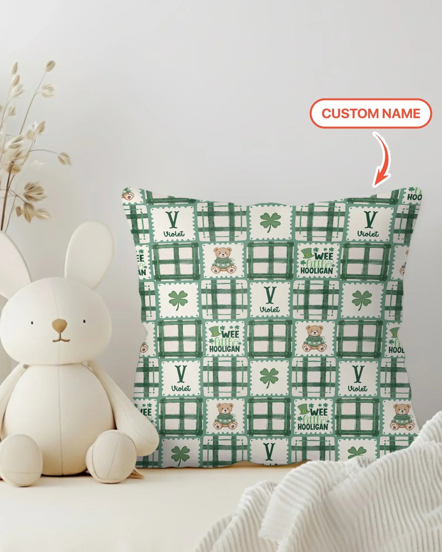 Custom Name Teddy Bear Gingham St. Patrick's Day Pillow Case