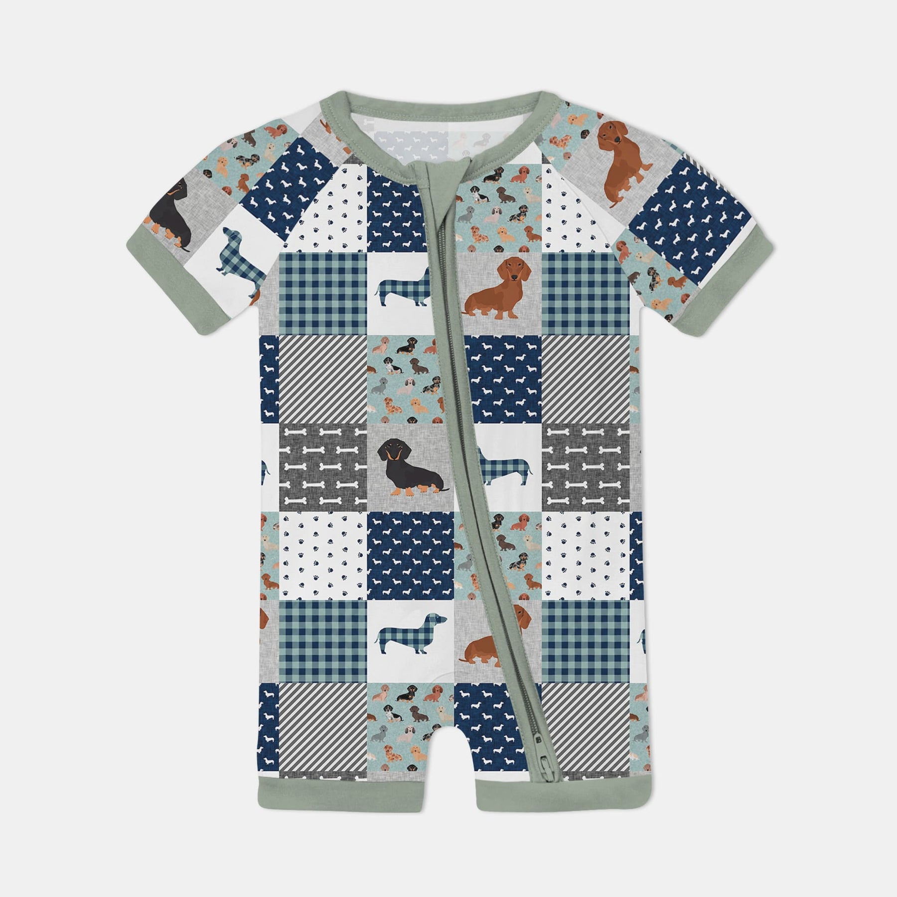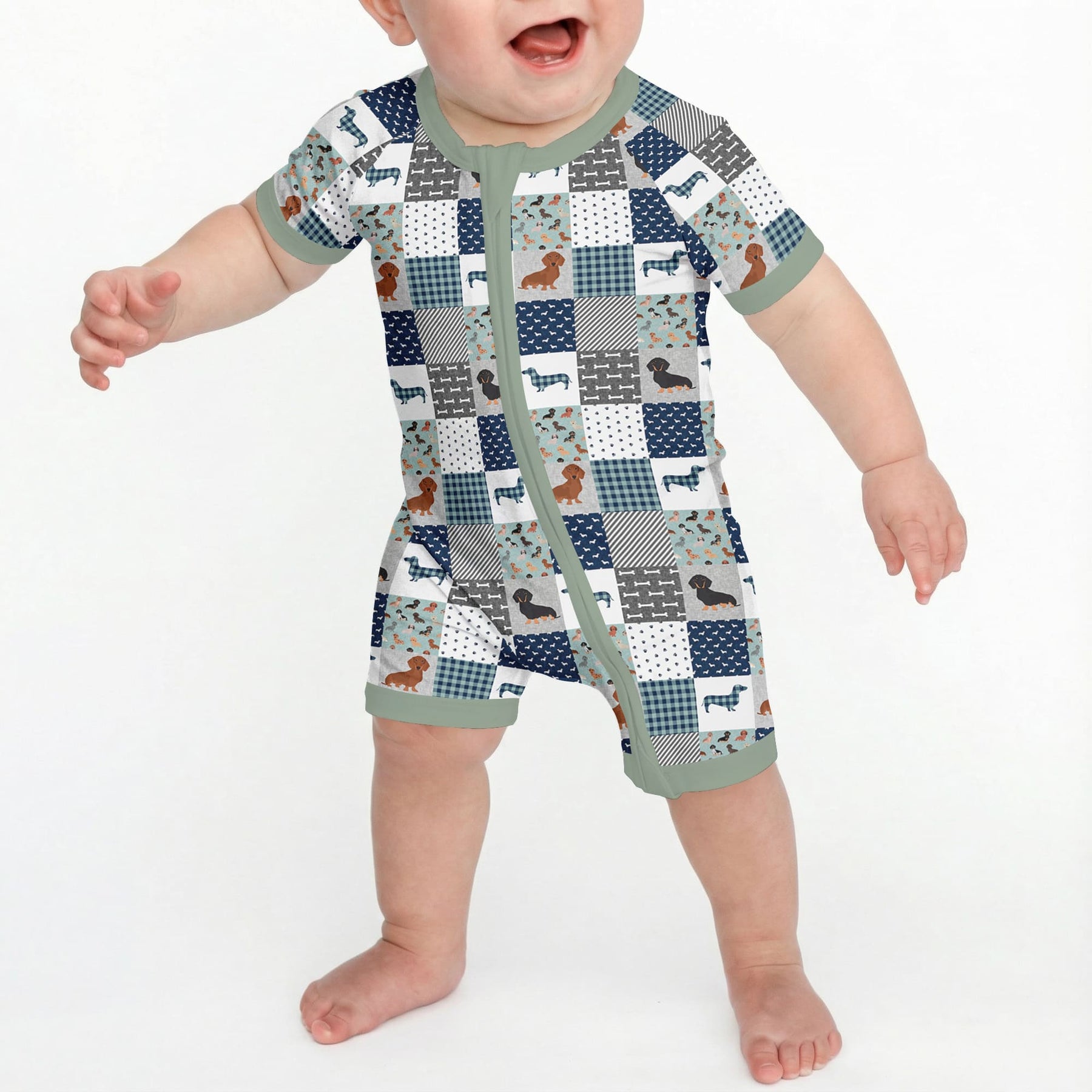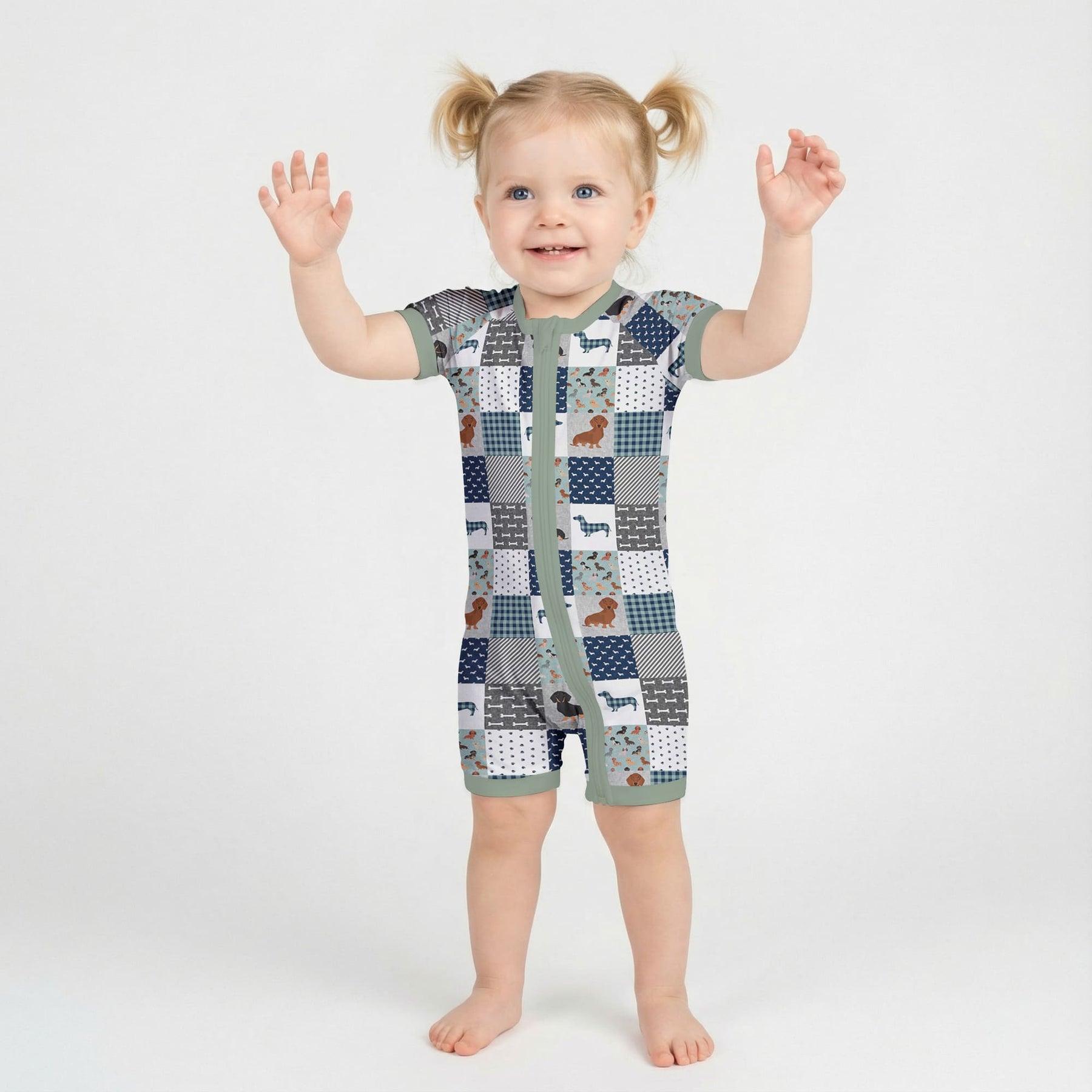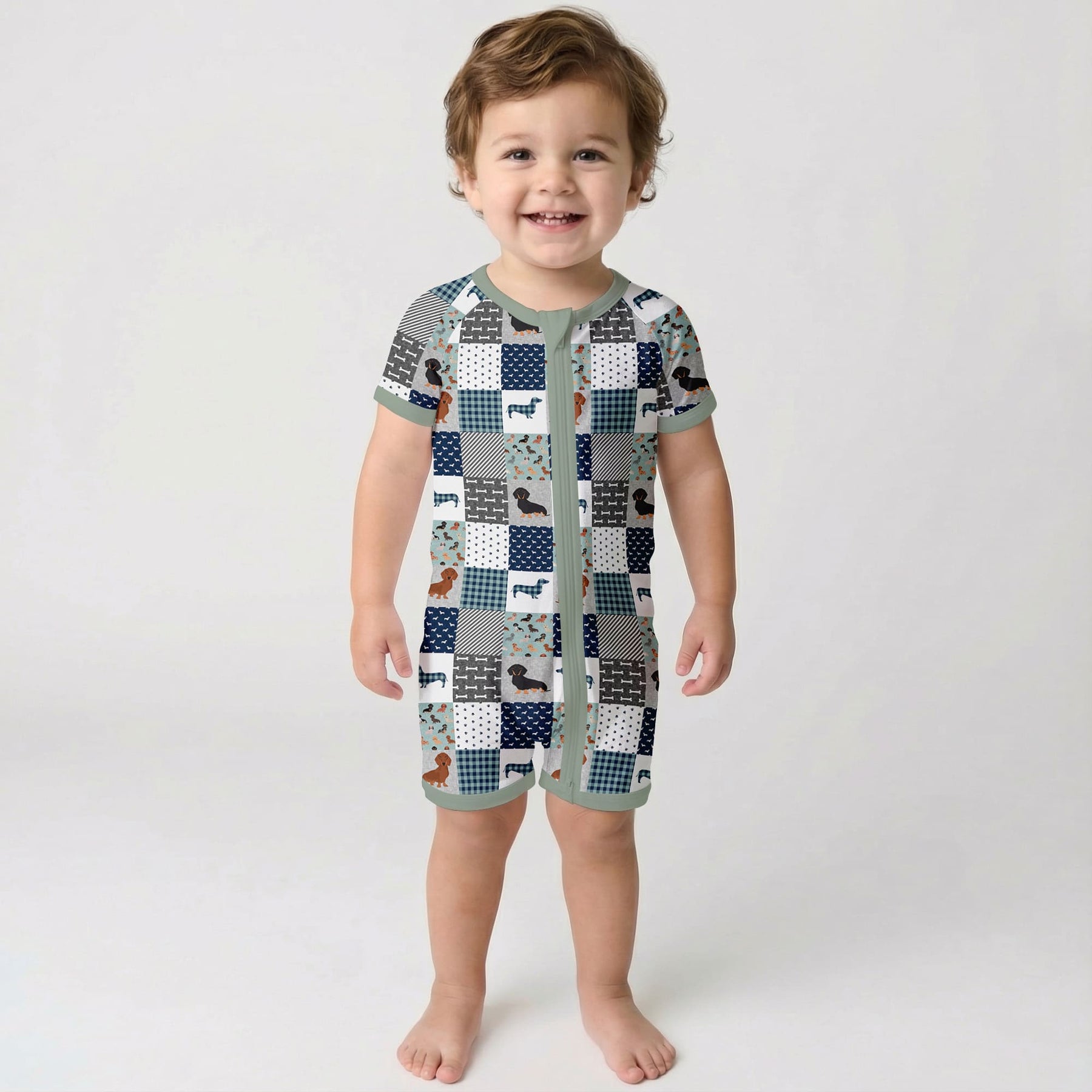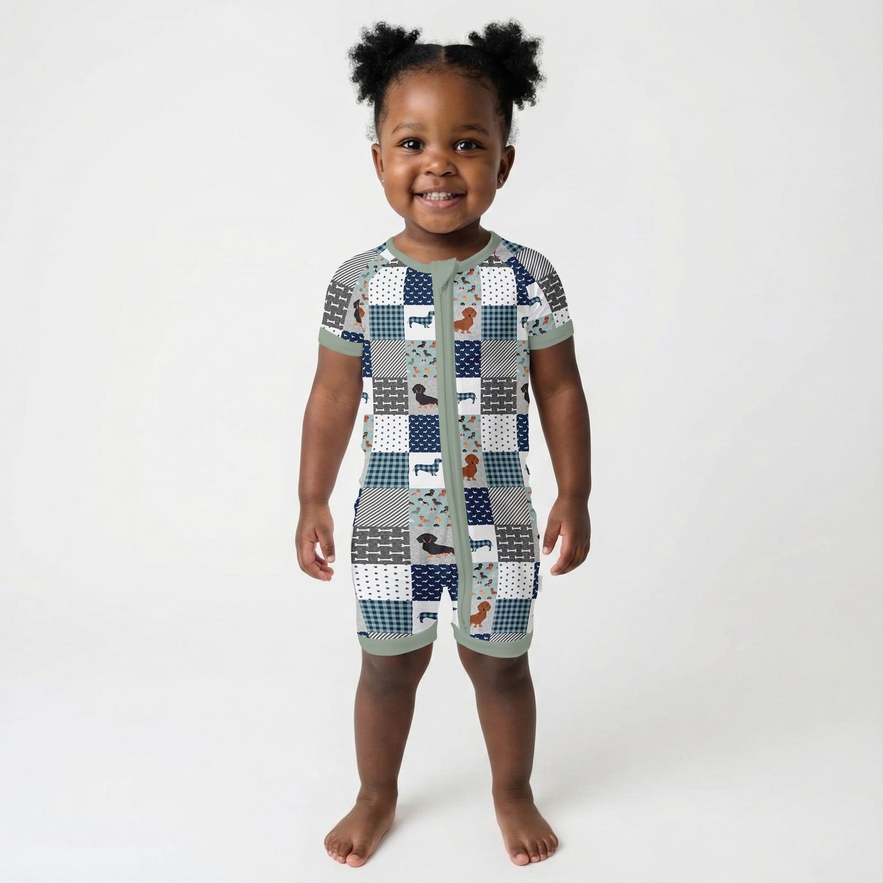 A cozy blue-and-gray patchwork design where playful dachshunds, tiny paw prints, bones, and dog silhouettes are woven together with plaid and striped squares, creating a warm, joyful pattern that celebrates the charm and personality of these little dogs. Crafted from soft bamboo viscose, this set is gentle on sensitive skin and offers breathable comfort in any season. The extra length ensures it fits longer, making bedtime routines even more enjoyable.