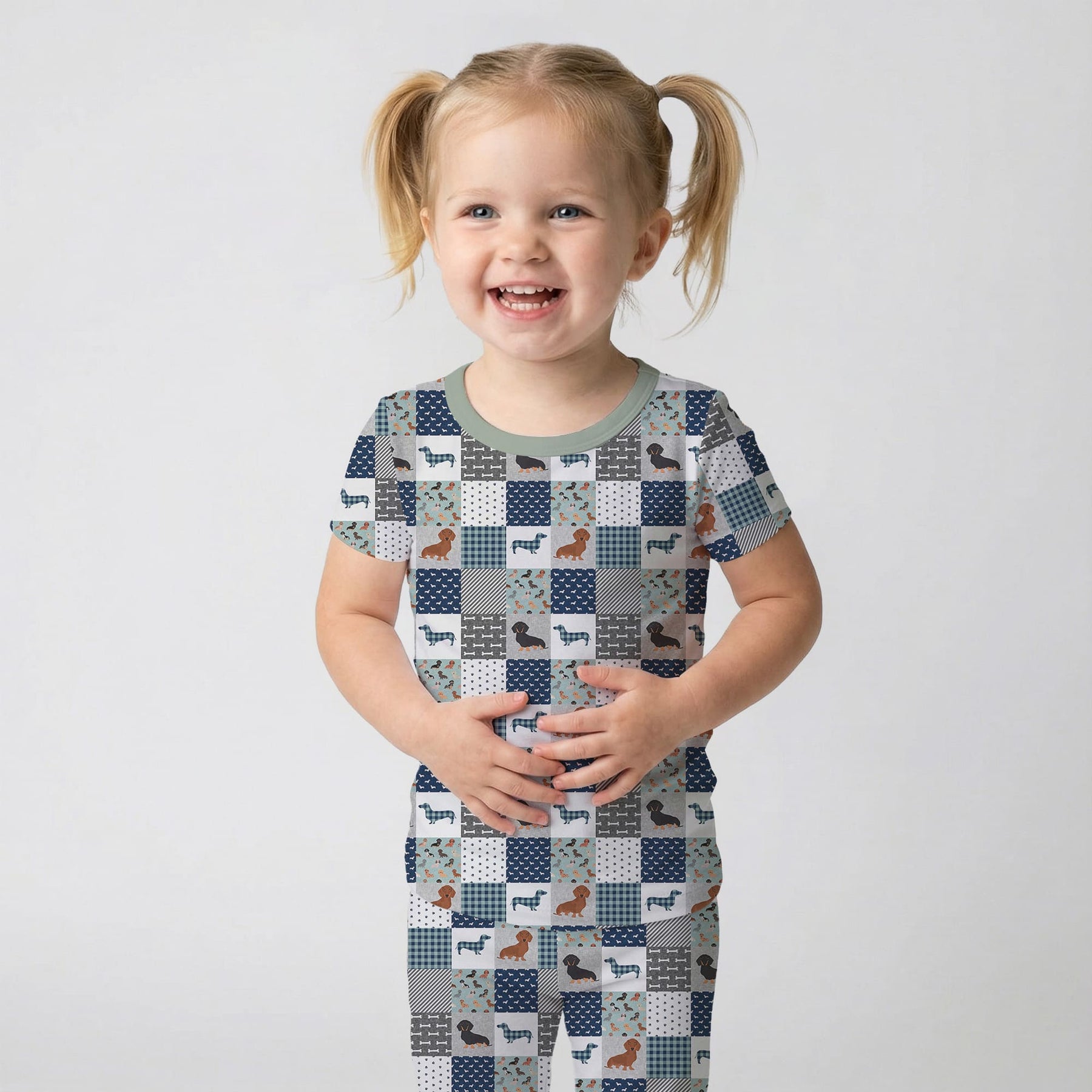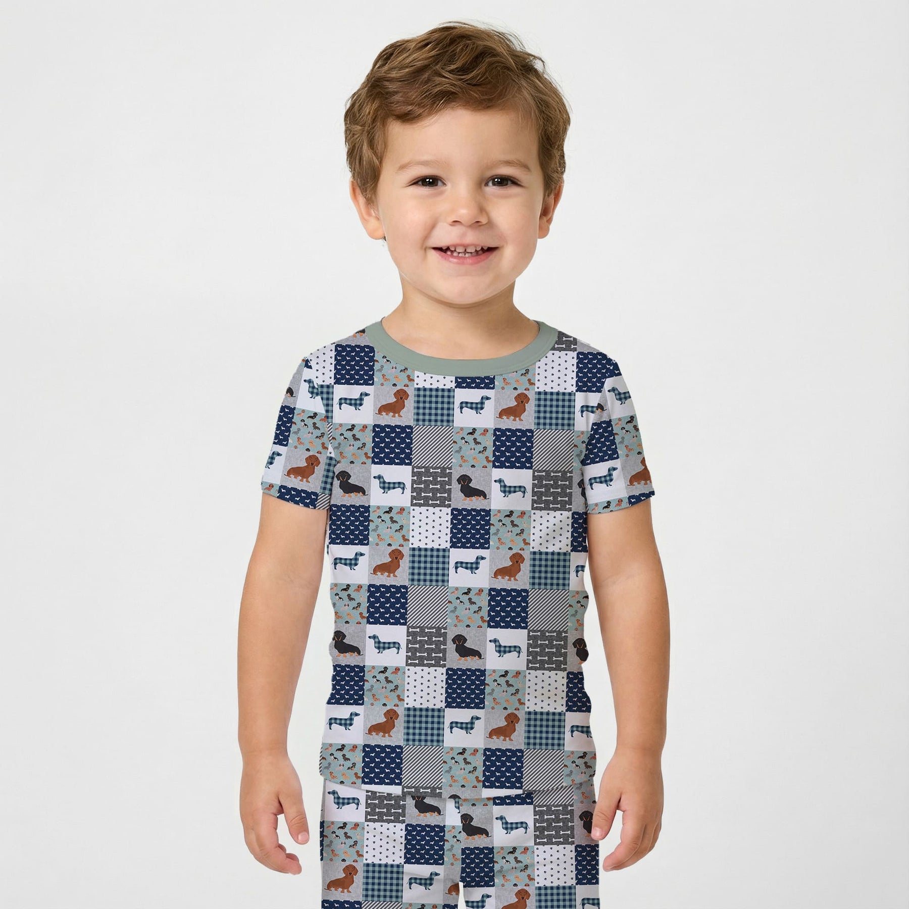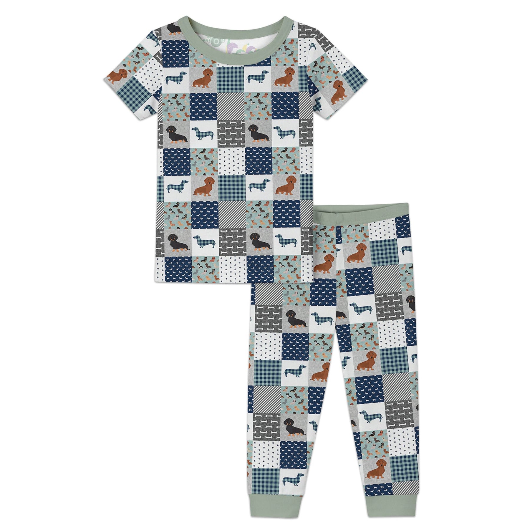 A cozy blue-and-gray patchwork design where playful dachshunds, tiny paw prints, bones, and dog silhouettes are woven together with plaid and striped squares, creating a warm, joyful pattern that celebrates the charm and personality of these little dogs. Crafted from soft bamboo viscose, this set is gentle on sensitive skin and offers breathable comfort in any season. The extra length ensures it fits longer, making bedtime routines even more enjoyable.