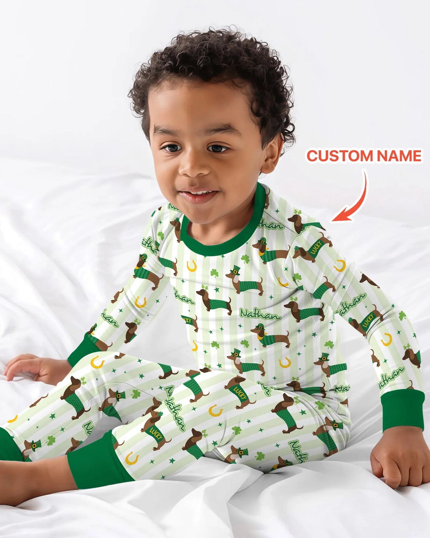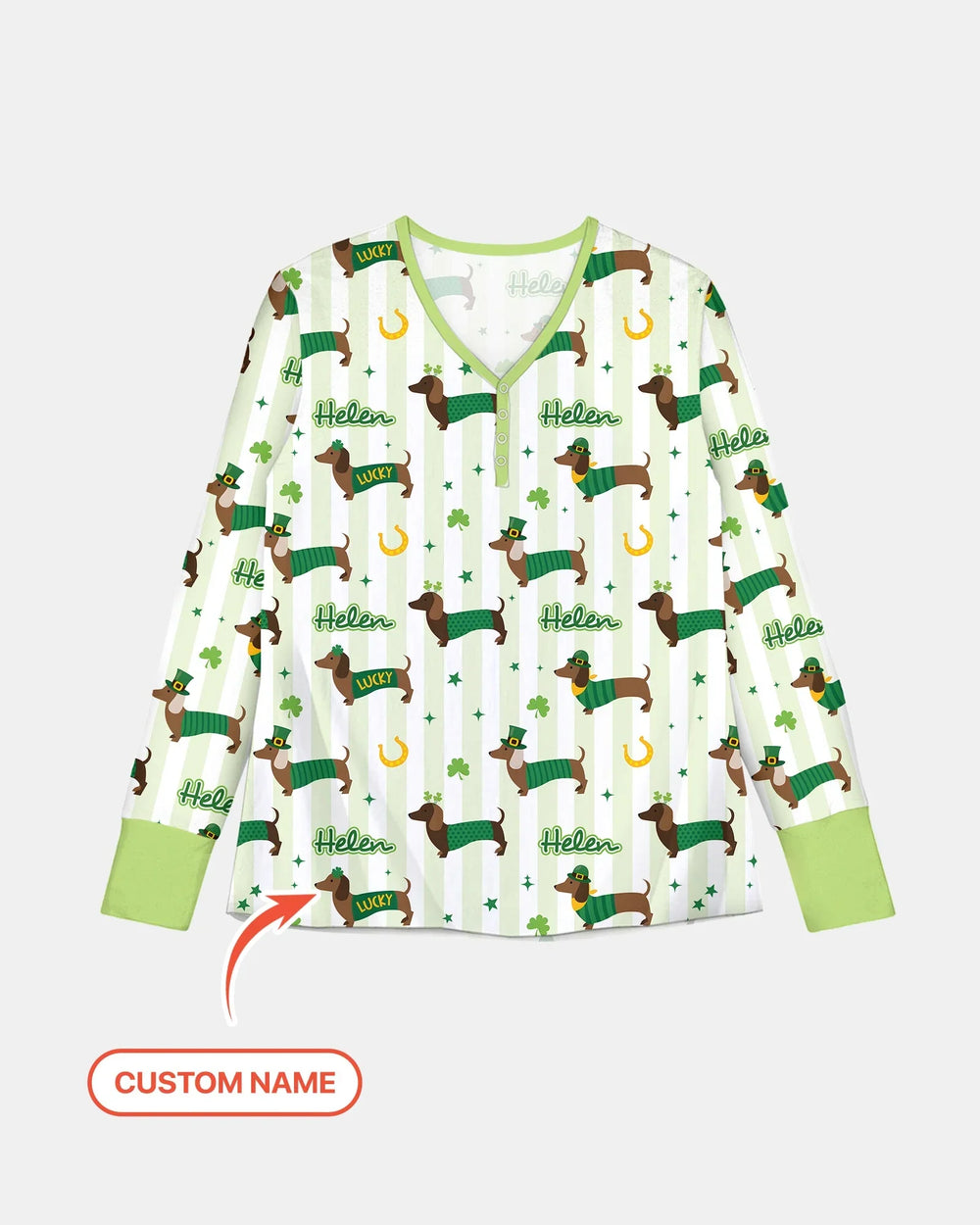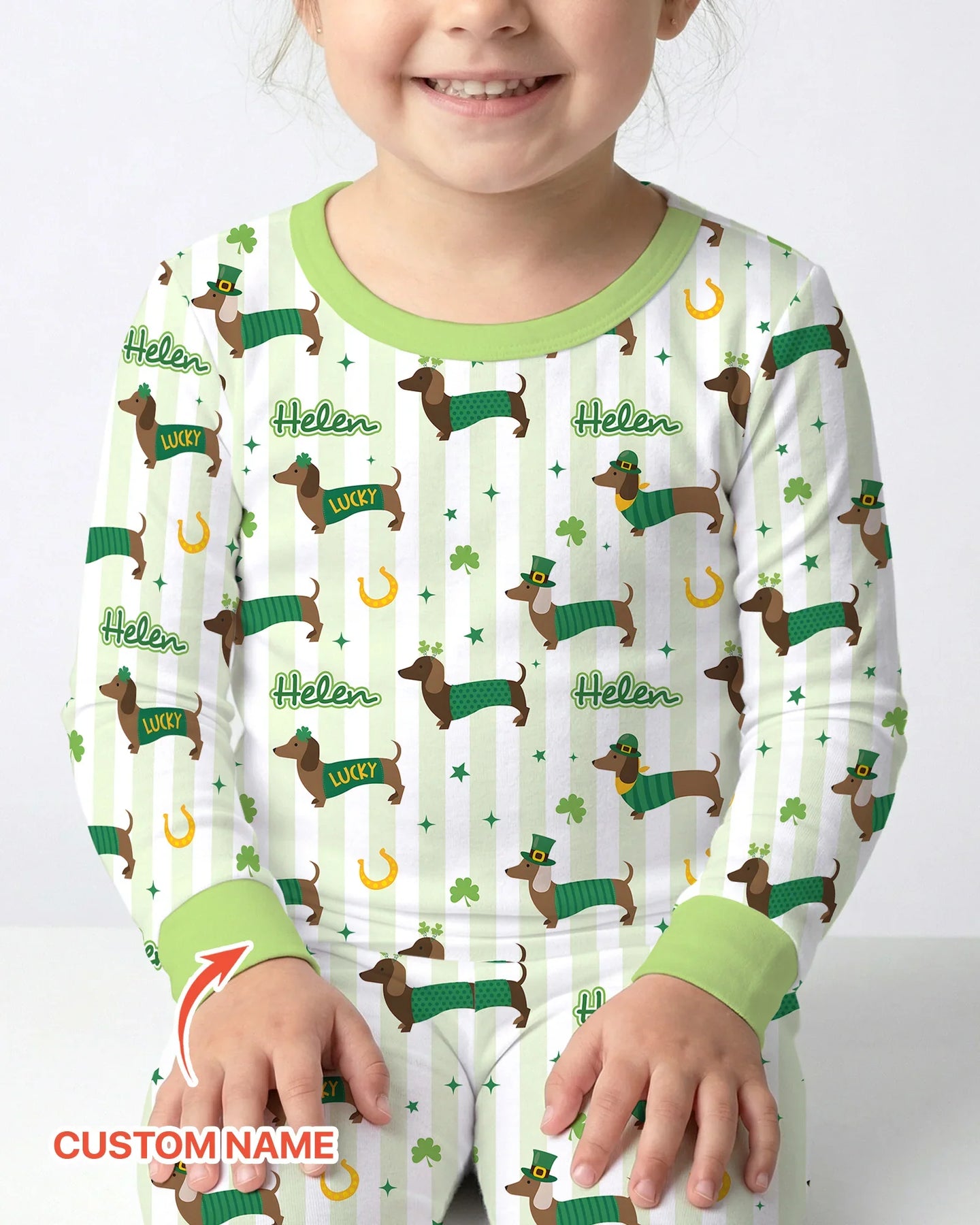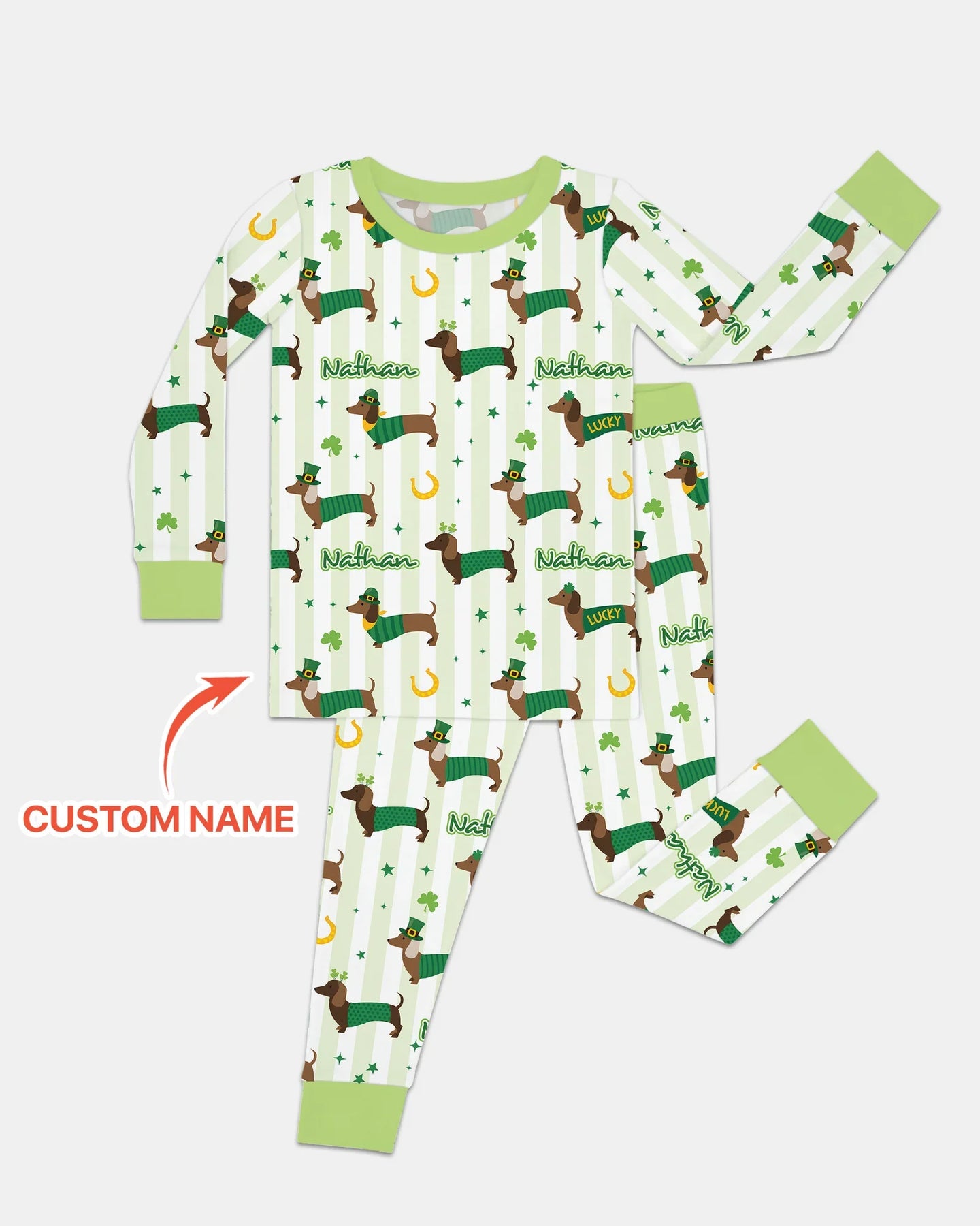 Brings adorable dachshunds dressed in green outfits, surrounded by lucky charms like shamrocks, horseshoes, and sparkling stars into your sleeping clothings. Soft green stripes and cheerful details create a festive yet cozy look, while the child’s custom name is repeated throughout the design for a fun, personalized touch.