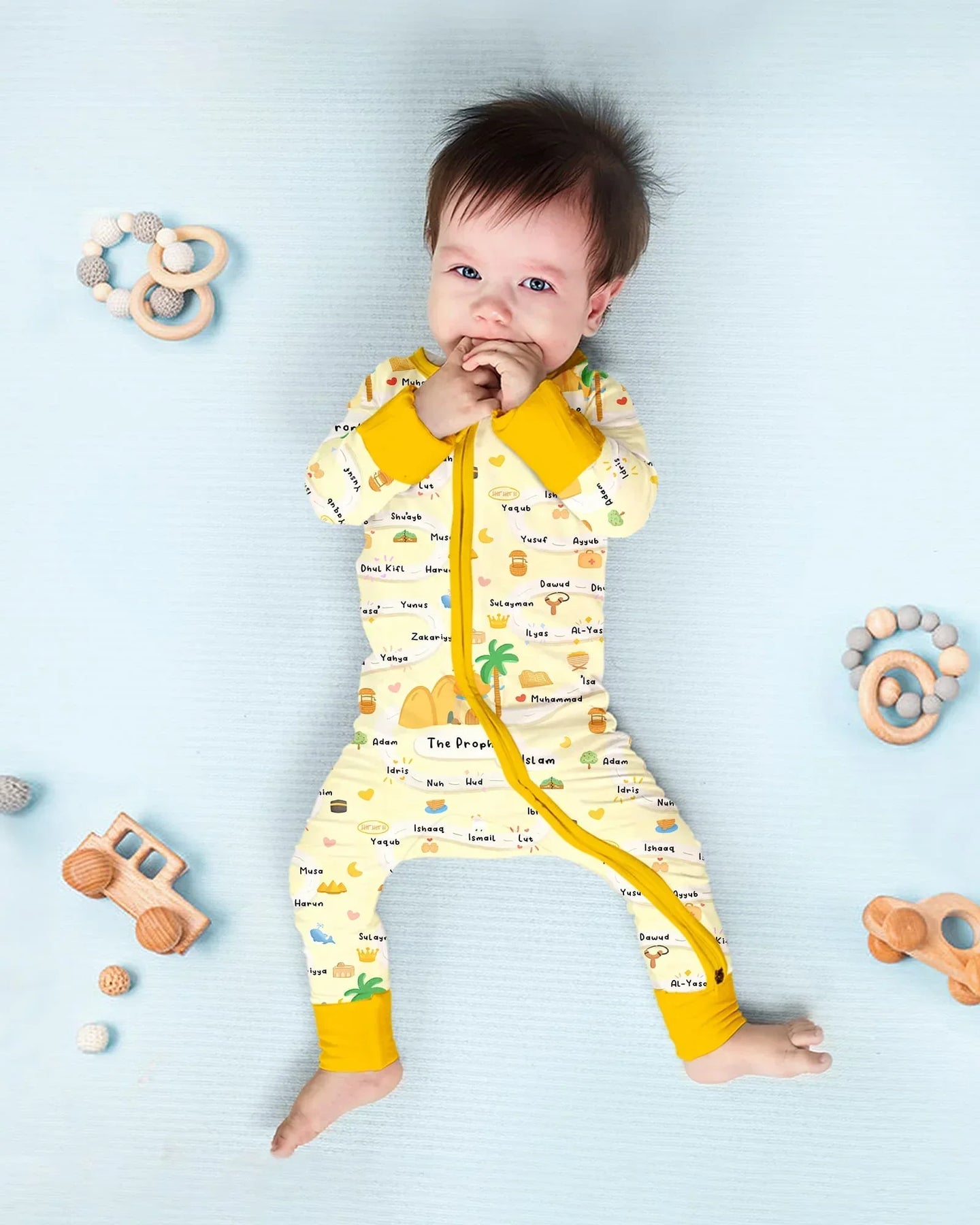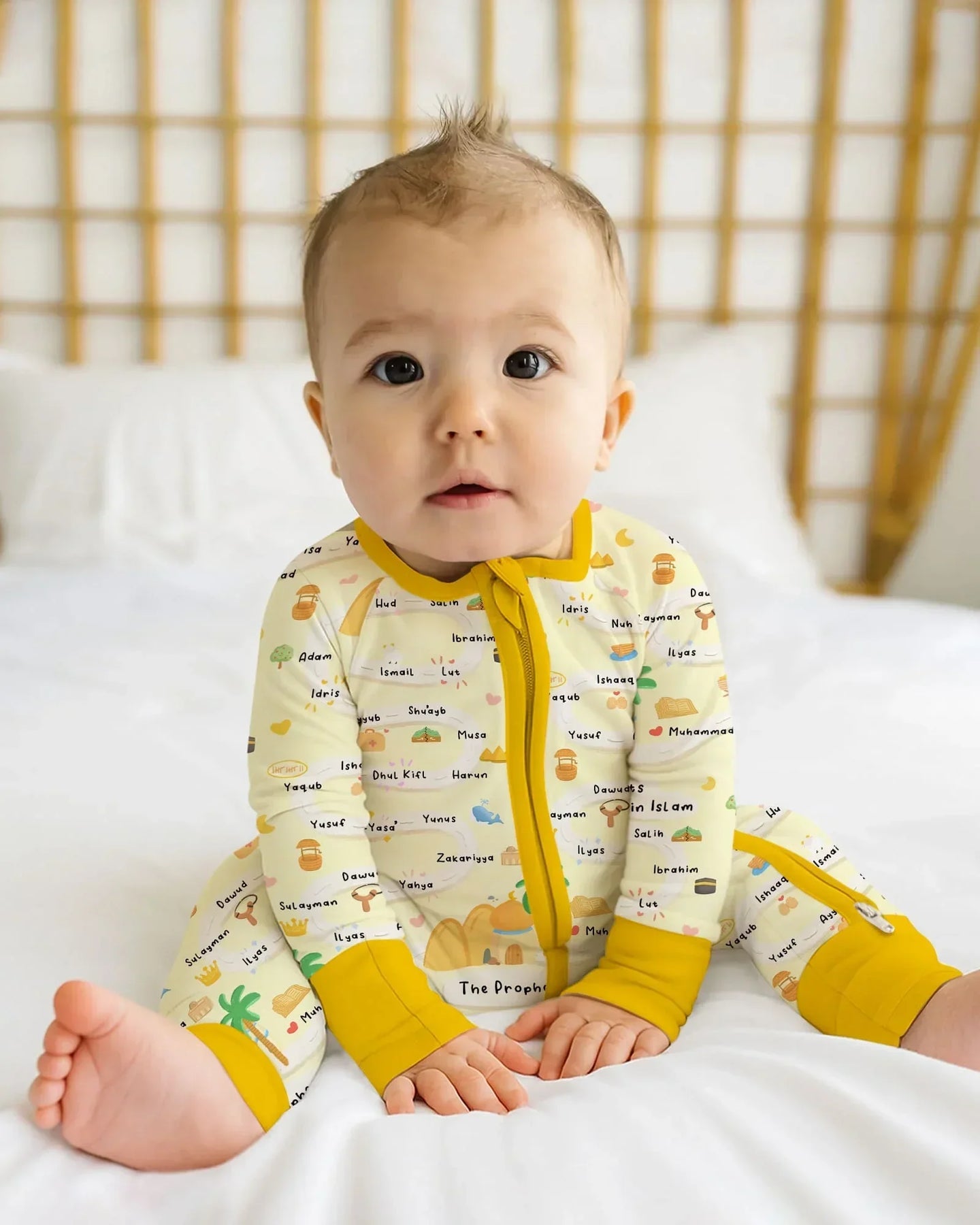 The Prophets in Islam Bamboo Zippies & PJ Sets combine comfort with meaningful learning. This thoughtfully designed print features a gentle, child-friendly illustrated timeline of the Prophets in Islam, surrounded by soft desert tones, palm trees, and symbolic icons that spark curiosity and conversation.