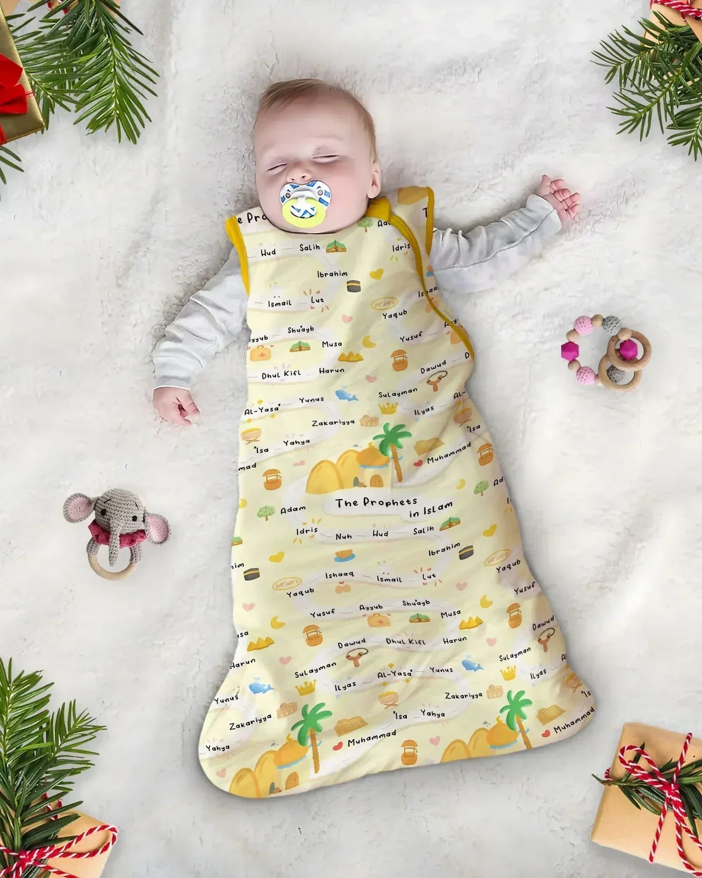 The Prophets in Islam Bamboo Zippies & PJ Sets combine comfort with meaningful learning. This thoughtfully designed print features a gentle, child-friendly illustrated timeline of the Prophets in Islam, surrounded by soft desert tones, palm trees, and symbolic icons that spark curiosity and conversation.